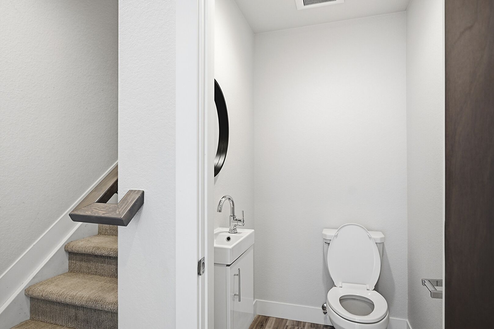 Baseboards Wall, Drywall, Half Bathroom, Vent, Wood Finish Floor, Vanity