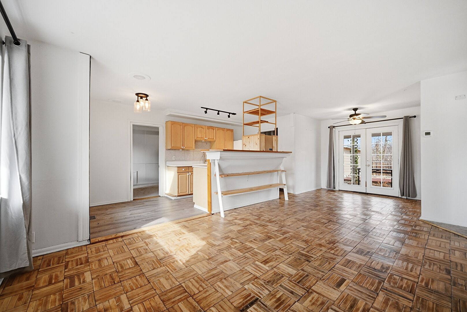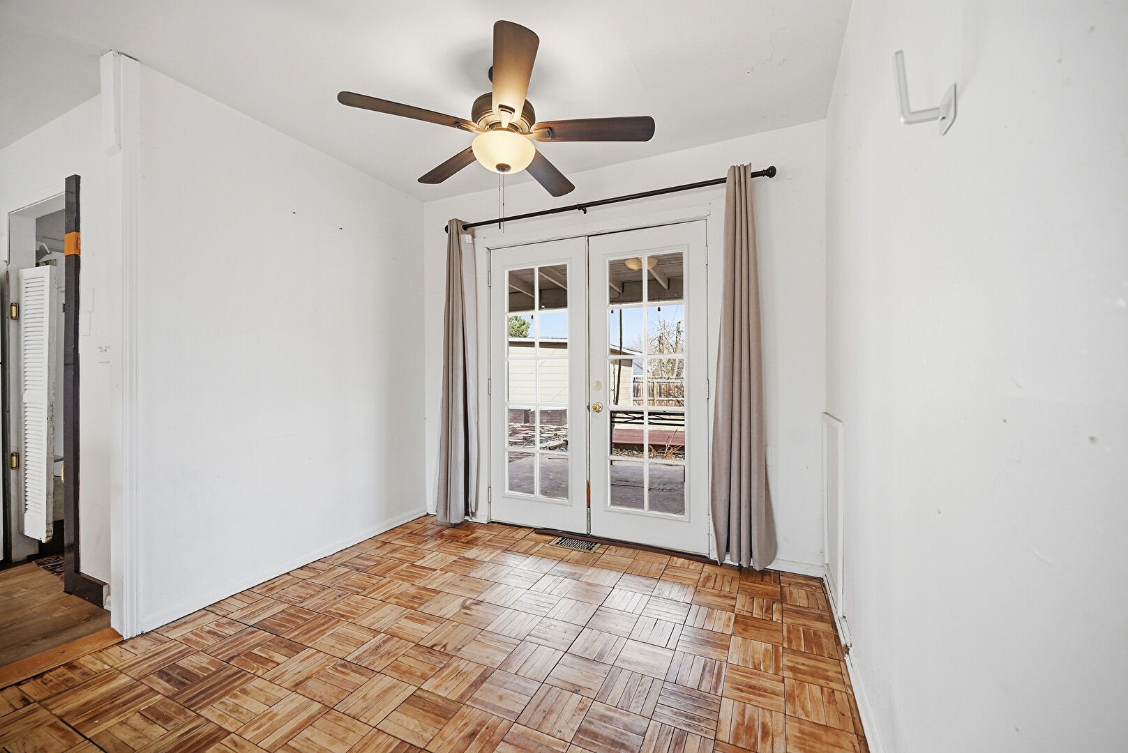 Baseboards Wall, Ceiling Fan, Drywall, French Doors, Natural Light, Wood Finish Floor