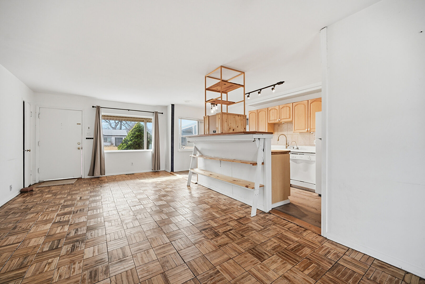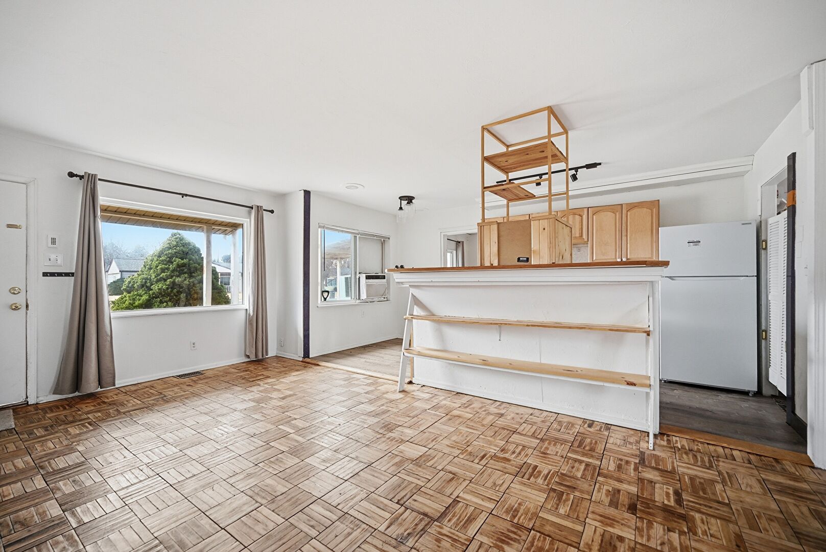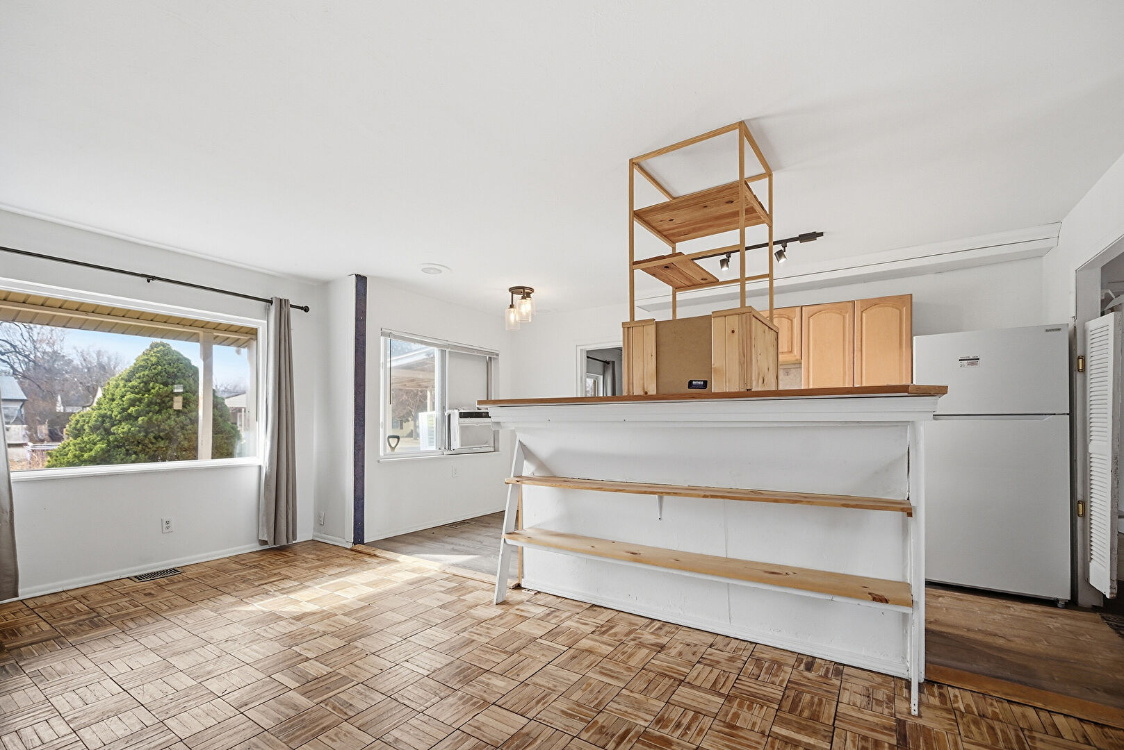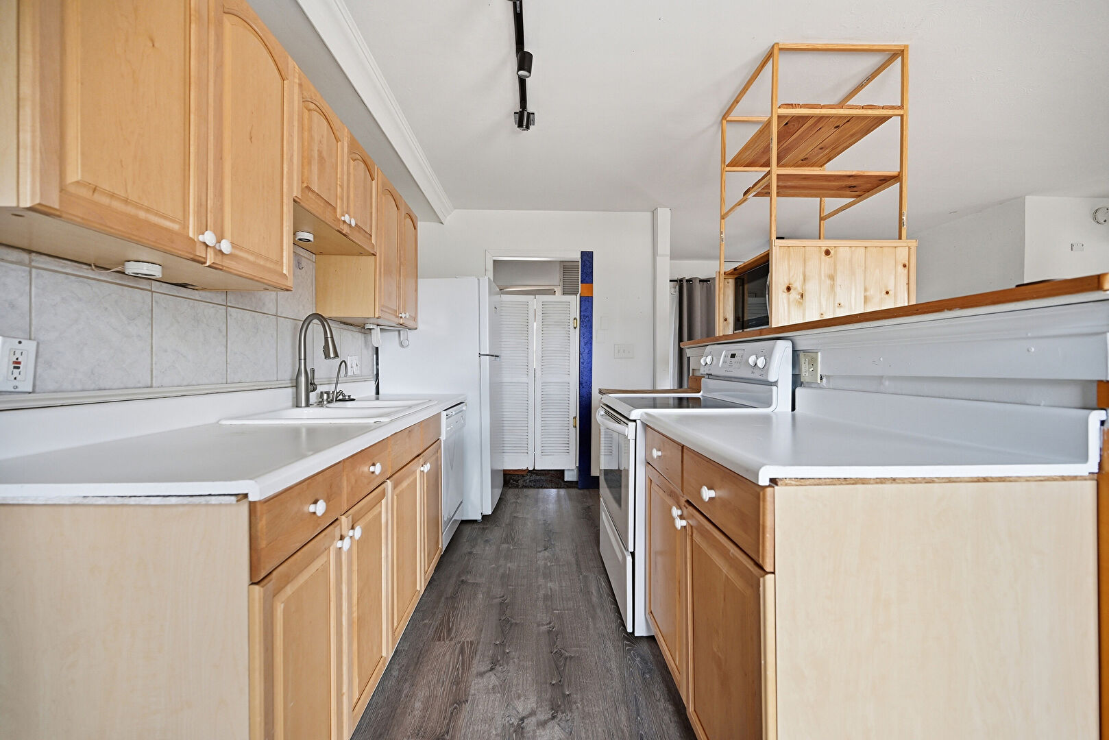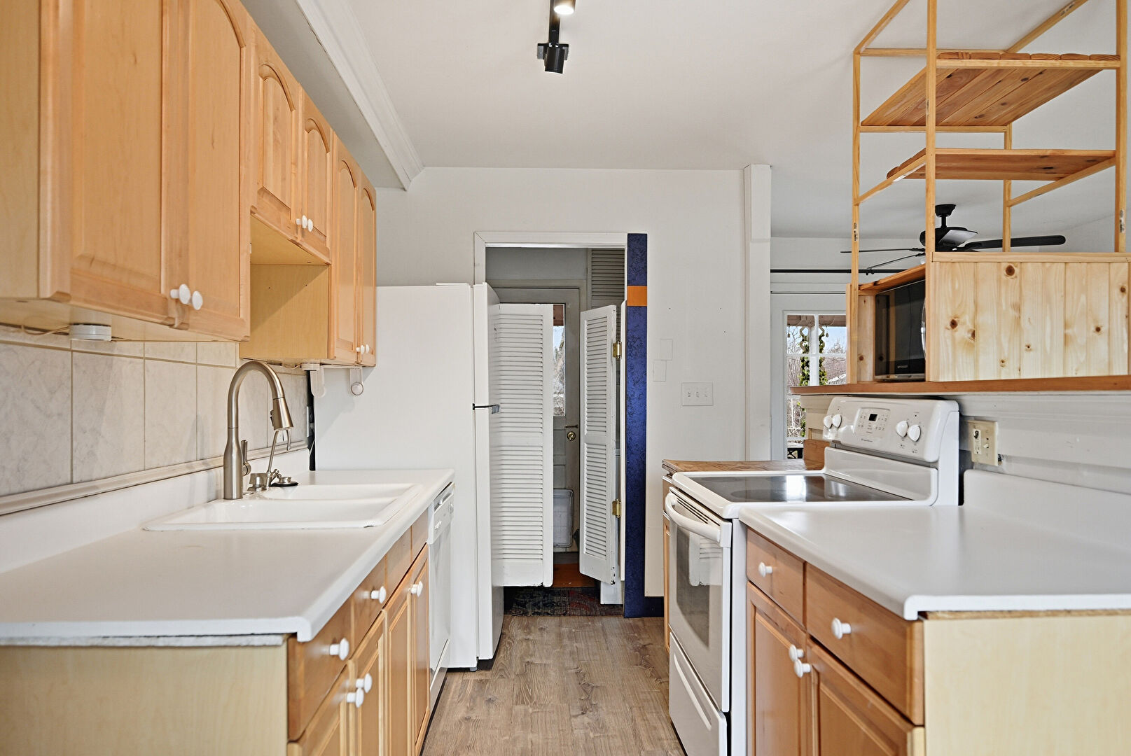 Arched Cabinets, Baseboards Wall, Butcher Block Countertops, Ceiling Fan, Crown Molding, Drywall, Galley Kitchen, Kitchen Island, Natural Light, Raised Cabinets, Track Lighting, Vent, Wall Furnace, Window Mounted Ac, Wood Finish Floor, Arched Cabinets, Baseboards Wall, Drywall, Raised Cabinets, Track Lighting