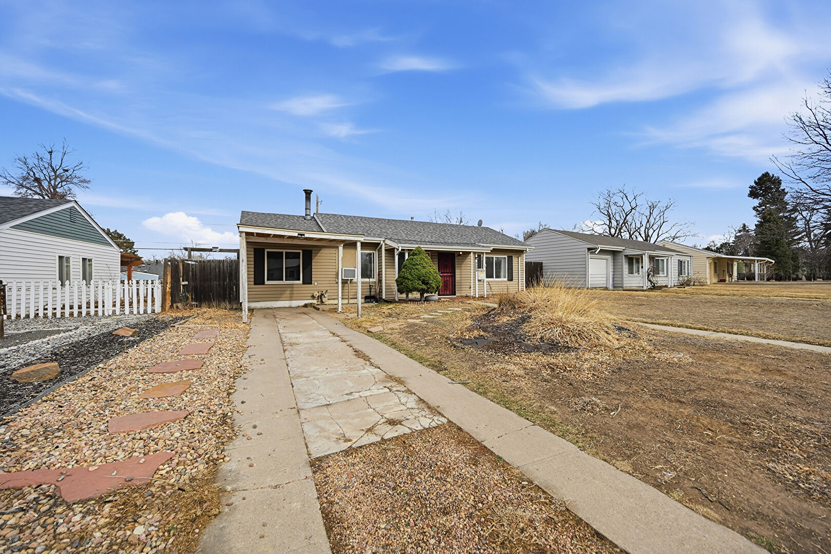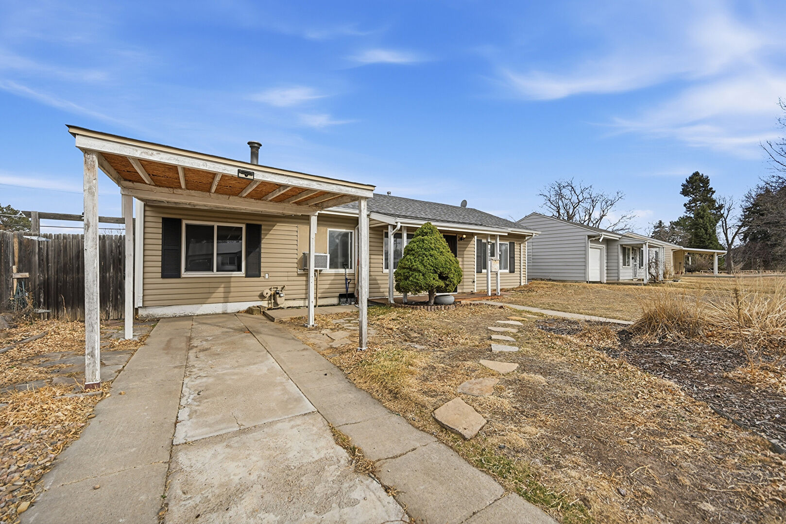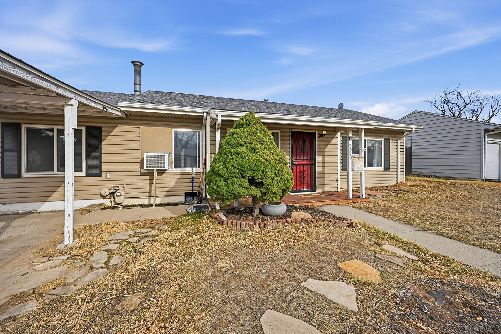 Attached Carport, Concrete Foundation, Downspout, Driveway, Fence, Horizontal Siding, Porch, Shingle Roof, Wall Mounted Ac, Window Mounted Ac, Fence, Gutters, Horizontal Siding