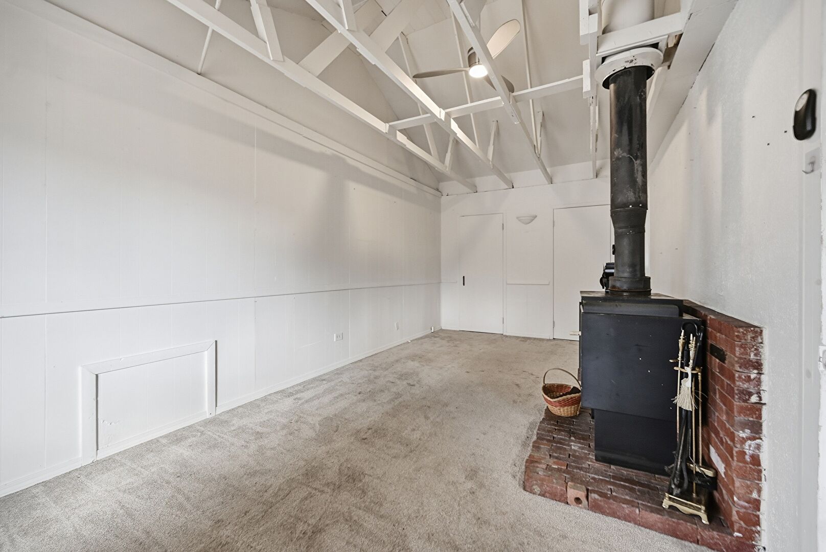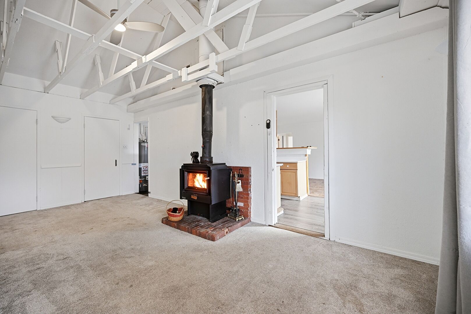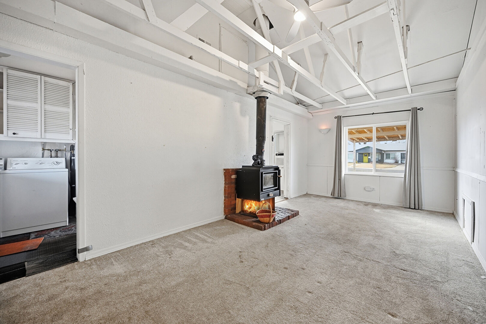 Baseboards Wall, Carpet, Ceiling Fan, Drywall, French Doors, High Ceiling, Laundry, Natural Light, Track Lighting, Vaulted Ceiling, Washer Dryer, Washer Hookup, Window Mounted Ac, Wood Finish Floor, Wood Stove, Baseboards Wall, Carpet, Natural Light, Vaulted Ceiling, Wood Finish Floor