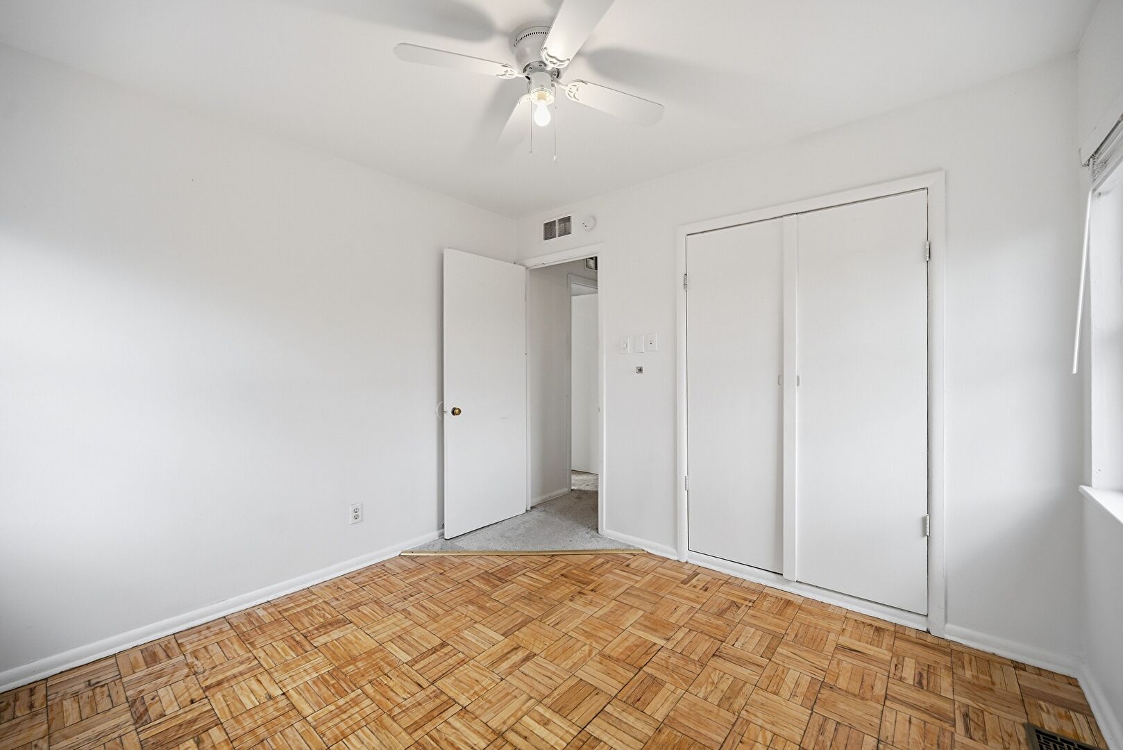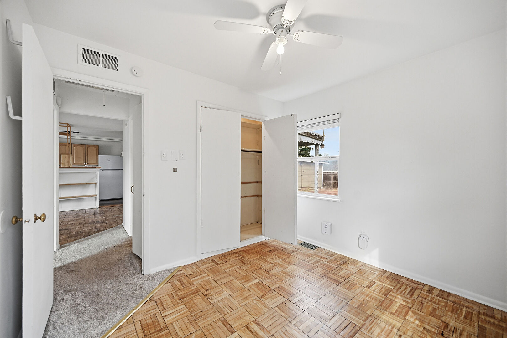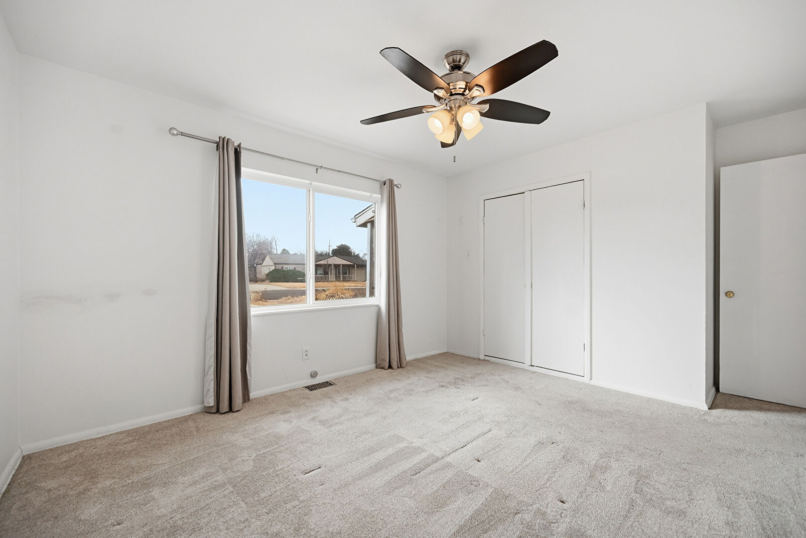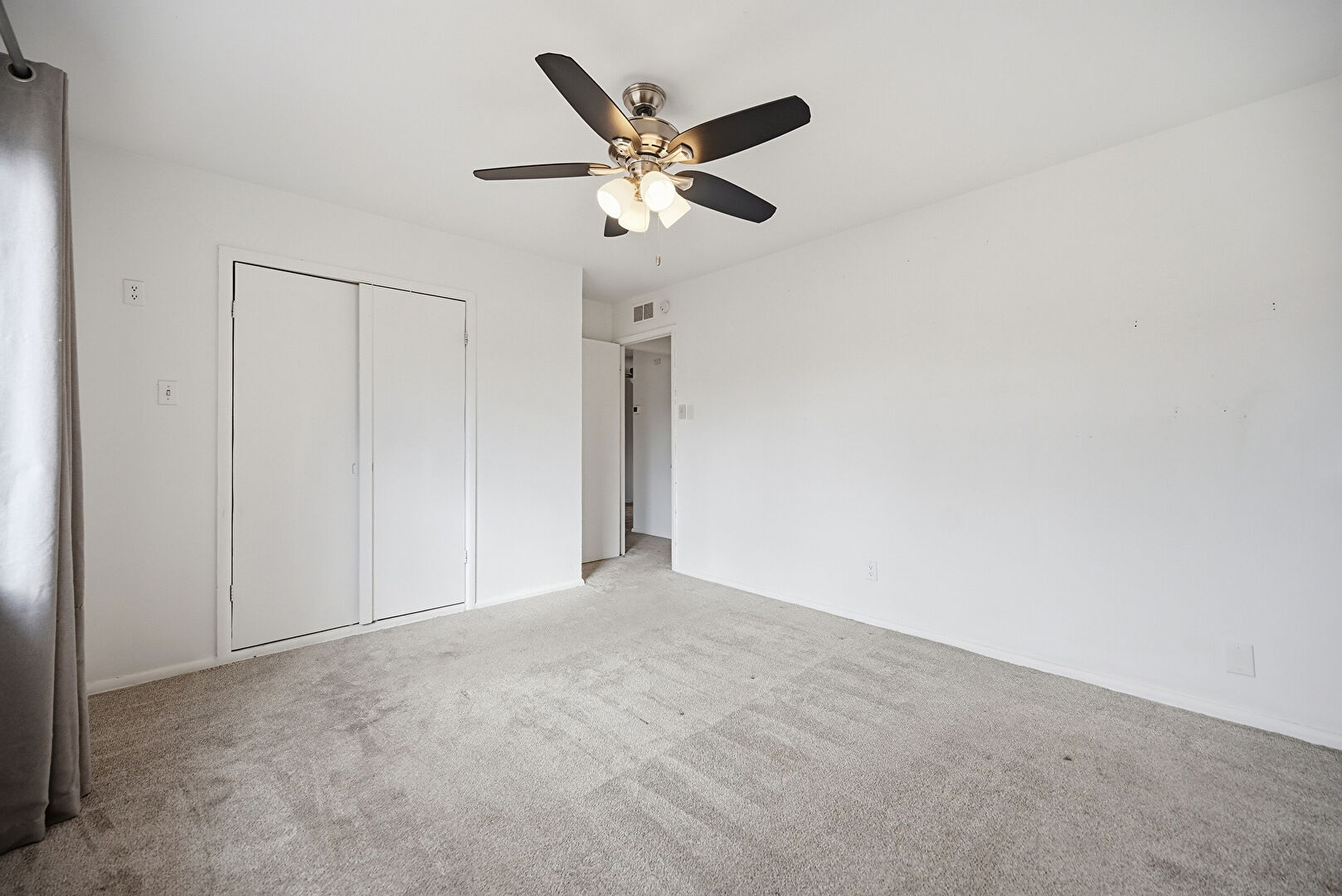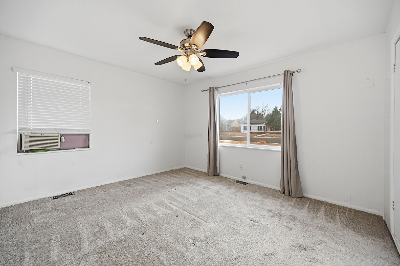 Baseboards Wall, Carpet, Ceiling Fan, Closet, Drywall, Natural Light, Vent, Window Mounted Ac, Baseboards Wall, Carpet, Closet
