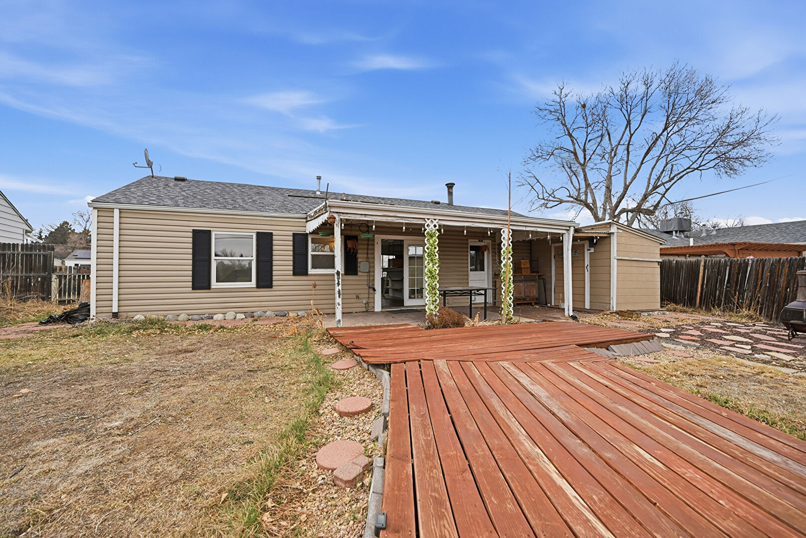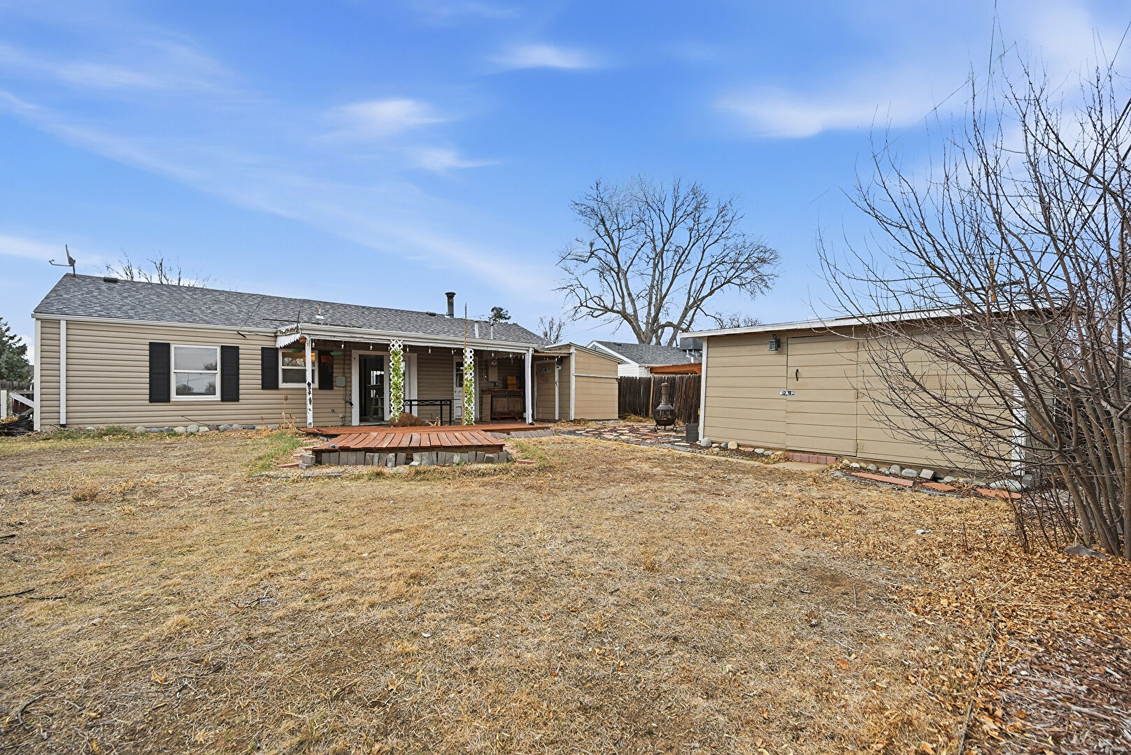 Deck, Downspout, Fence, Horizontal Siding, Lawn, Outdoor Structure, Patio, Shed, Shingle Roof, Deck, Satellite Dish
