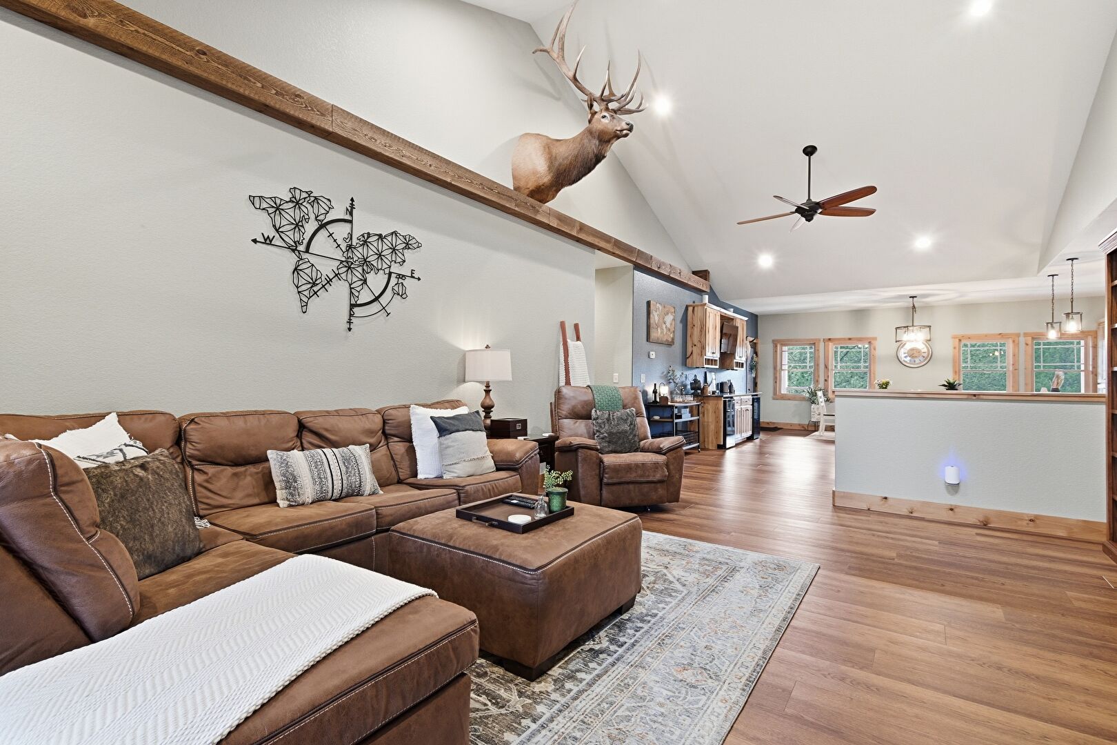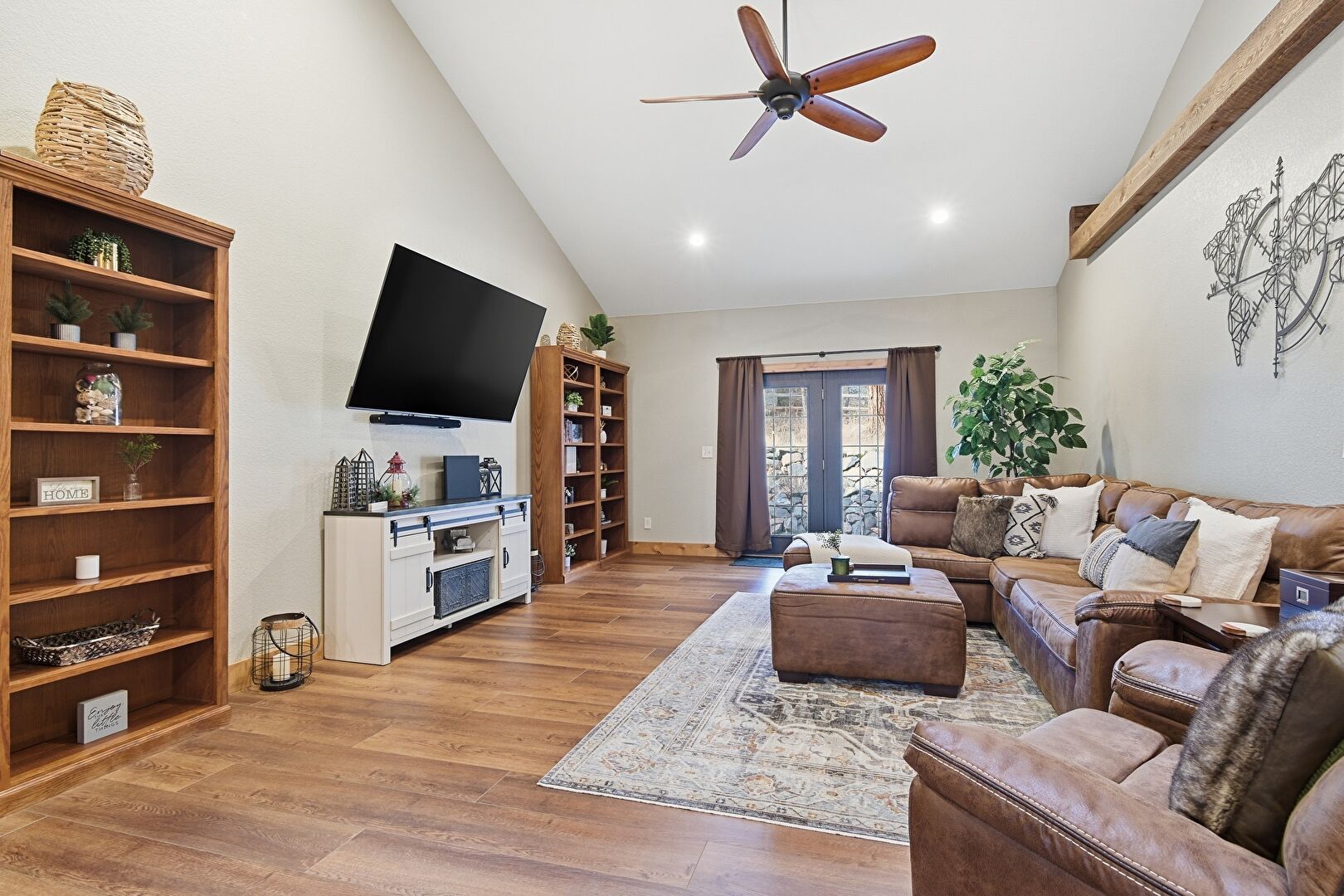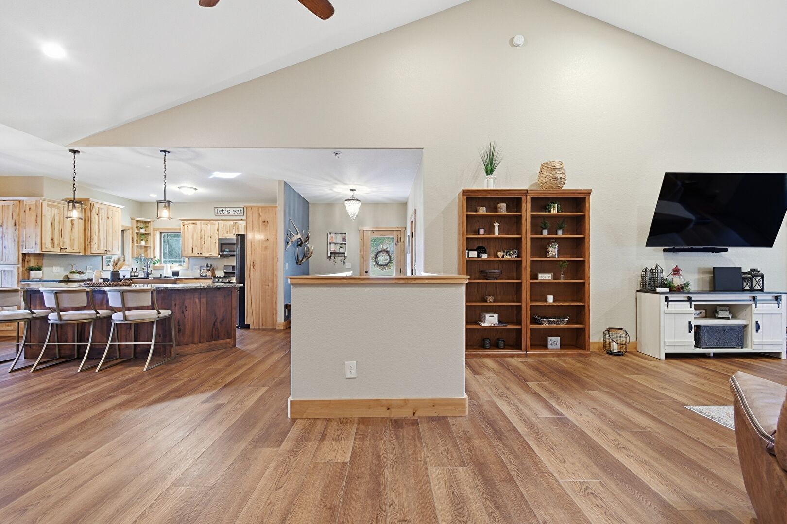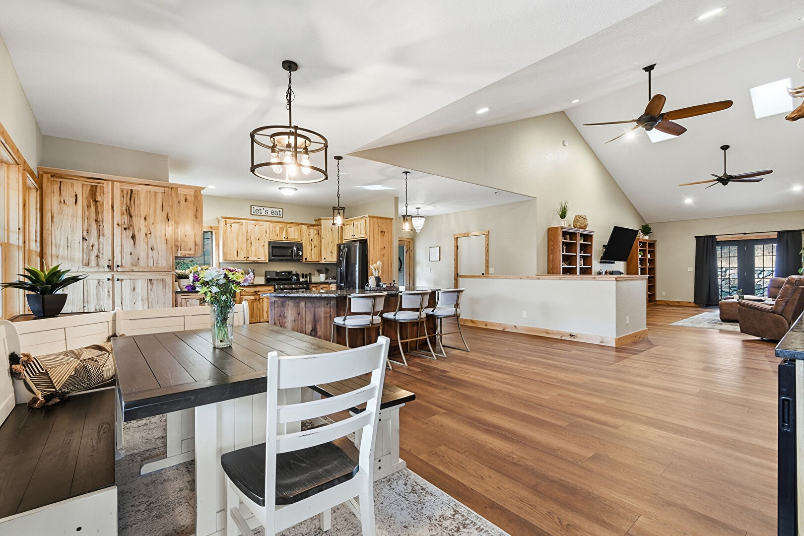 Baseboards Wall, Cathedral Ceiling, Ceiling Fan, Drywall, French Doors, High Ceiling, Natural Light, Recessed Lighting, U Shaped Kitchen, Vaulted Ceiling, Wood Finish Floor, Recessed Lighting, Vaulted Ceiling