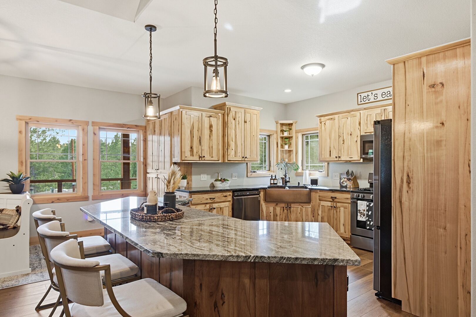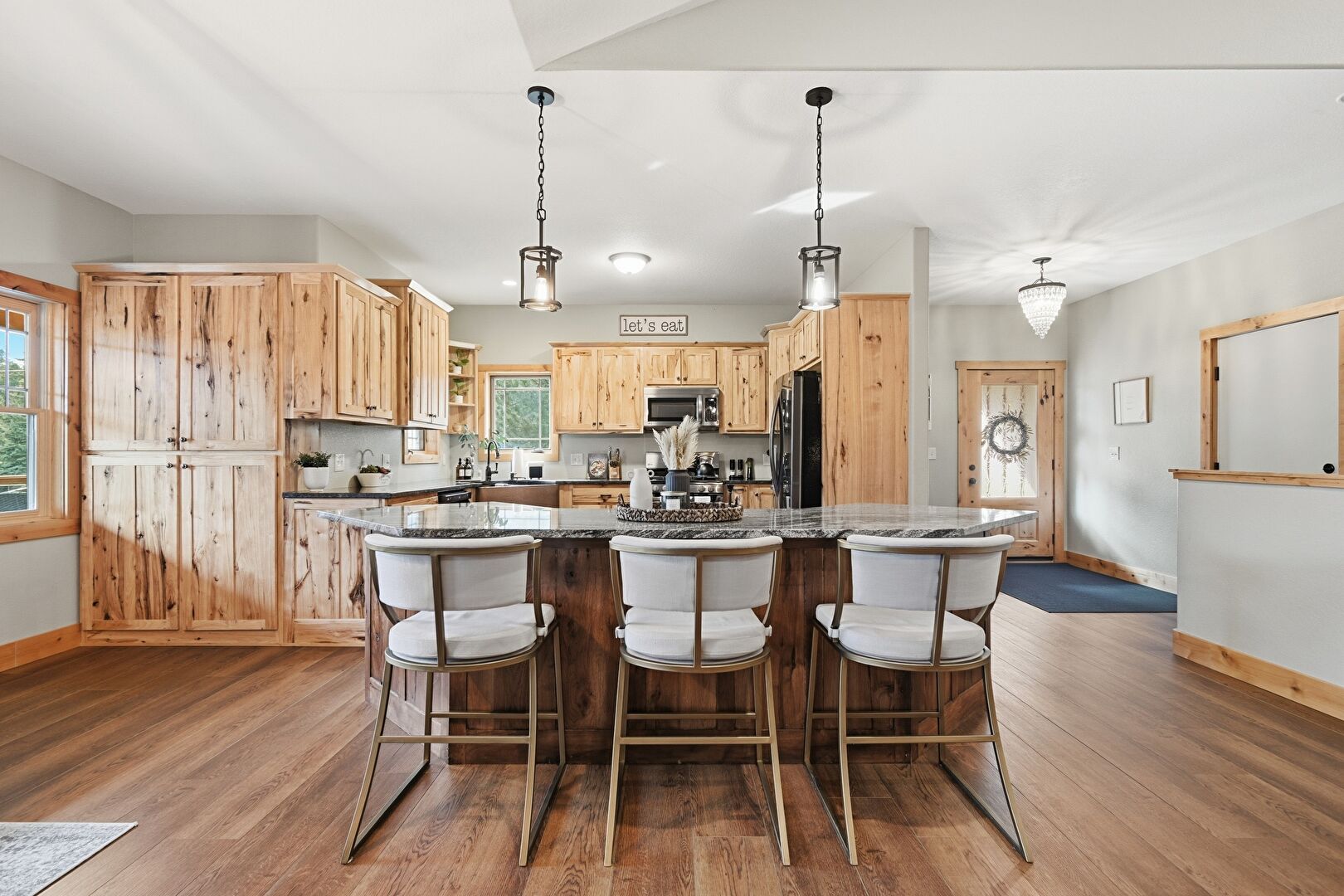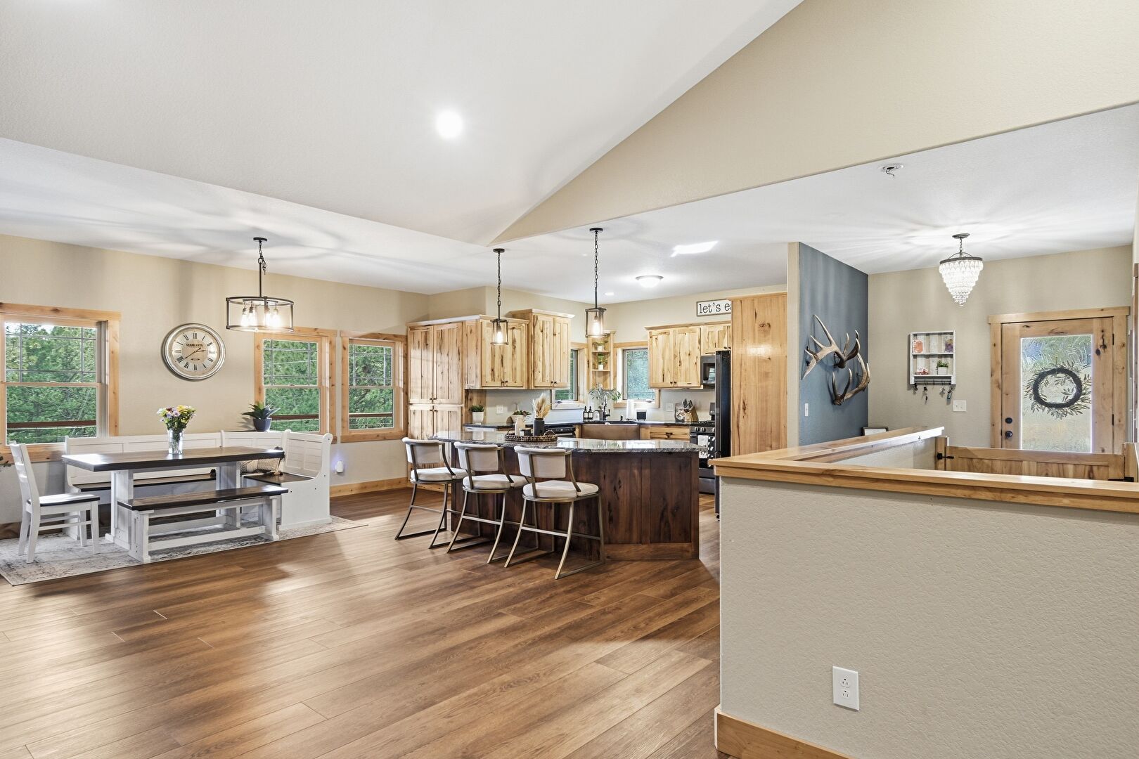 Baseboards Wall, Ceiling Fan, Crown Molding Cabinets, Drywall, G Shaped Kitchen, High Ceiling, Kitchen Bar, Kitchen Island, Kitchen Peninsula, L Shaped Kitchen, Medium Brown Cabinets, Natural Light, Open Shelves, Pendant Lighting, Recessed Lighting, Shaker Cabinets, Stone Countertops, Vaulted Ceiling, Wine Cooler, Wood Finish Floor, Crown Molding Cabinets, High Ceiling, Natural Light, Notable Chandelier, Pendant Lighting, Wood Finish Floor
