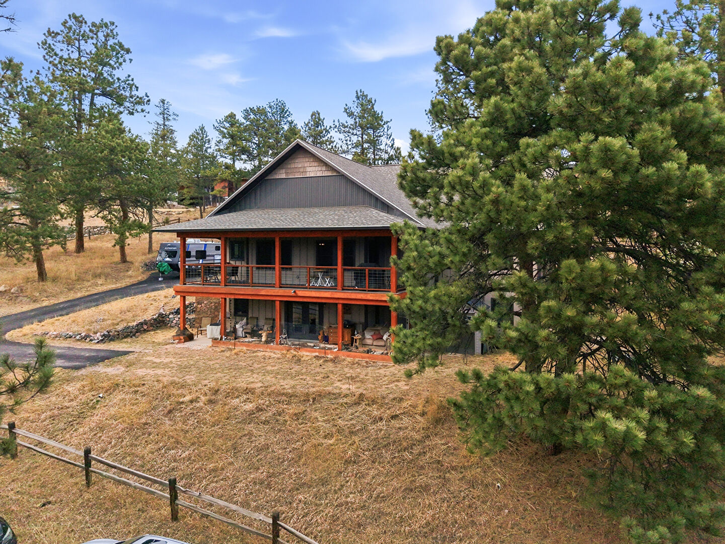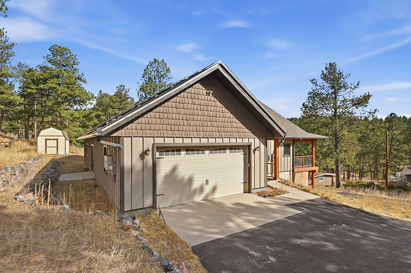 Basement Walk Out, Board Batten Siding, Downspout, Driveway, Electric Meter, Fence, Gutters, Outdoor Structure, Porch, Shake Shingle Siding, Shed, Vertical Siding, Woods View, Concrete Foundation, Gutters, Lawn