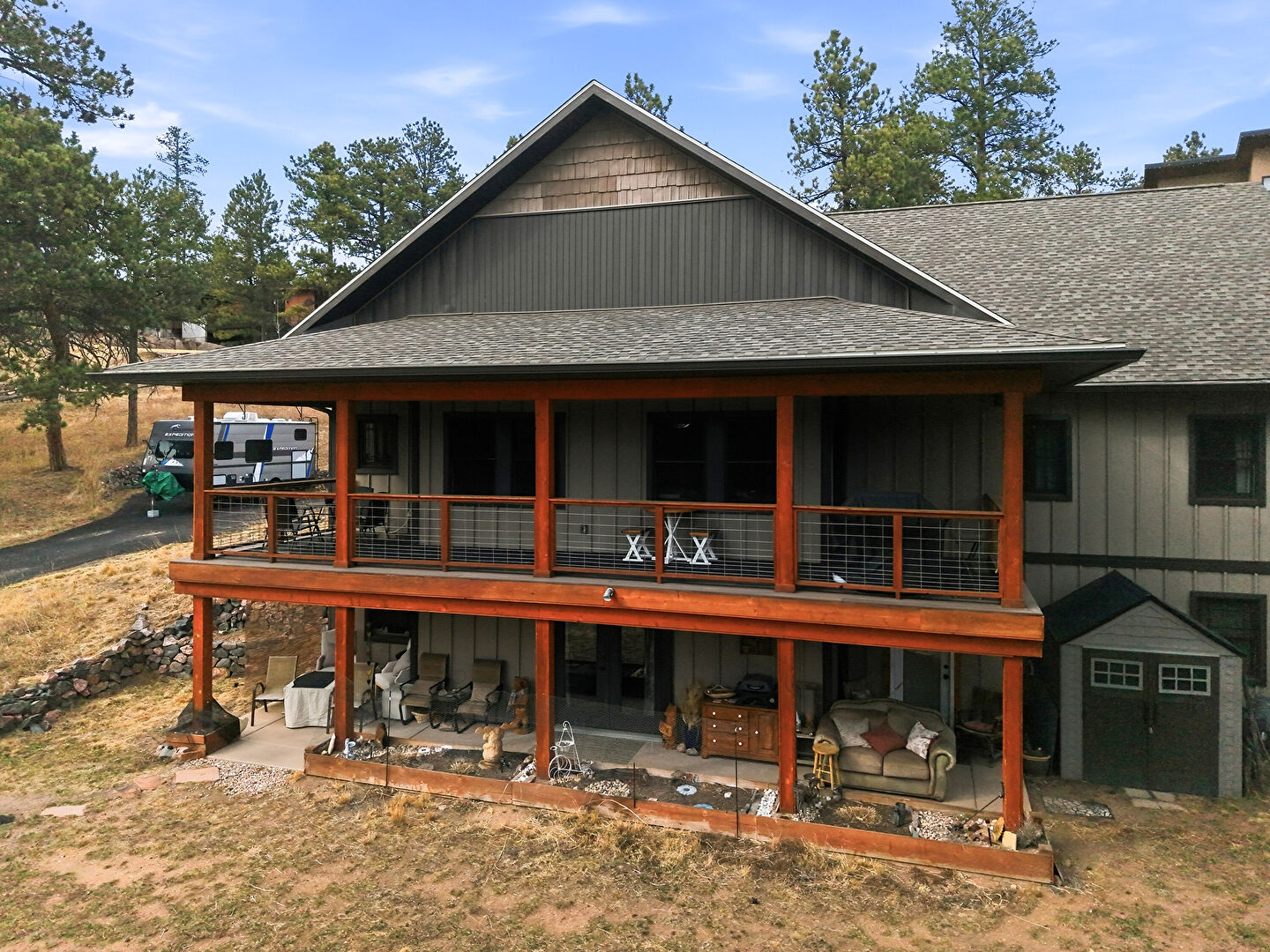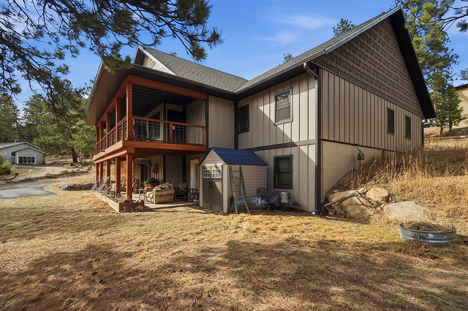 Basement Walk Out, Board Batten Siding, Concrete Foundation, Downspout, Lawn, Outdoor Structure, Patio, Shake Shingle Siding, Shed, Shingle Roof, Vertical Siding, Gutters