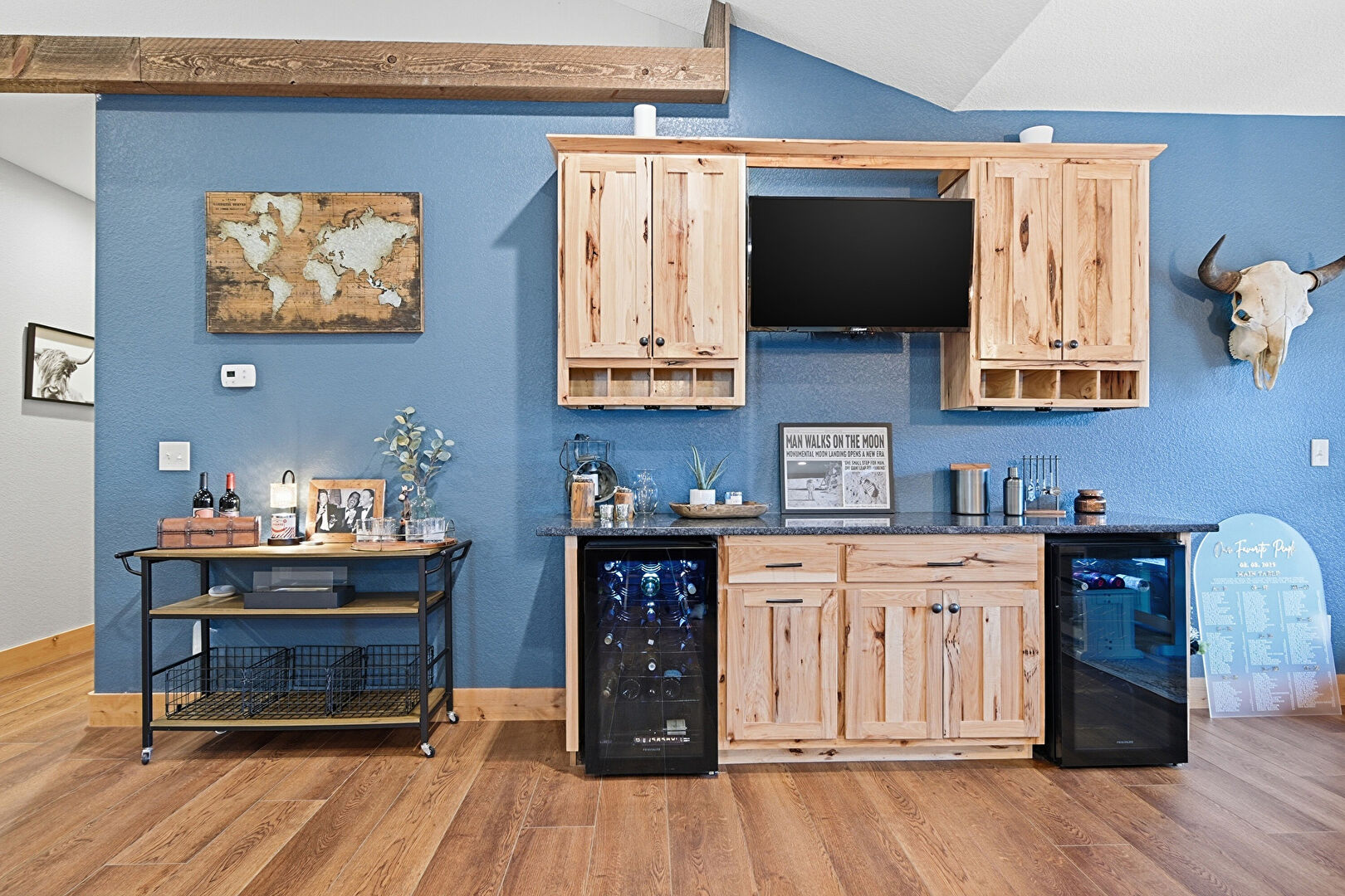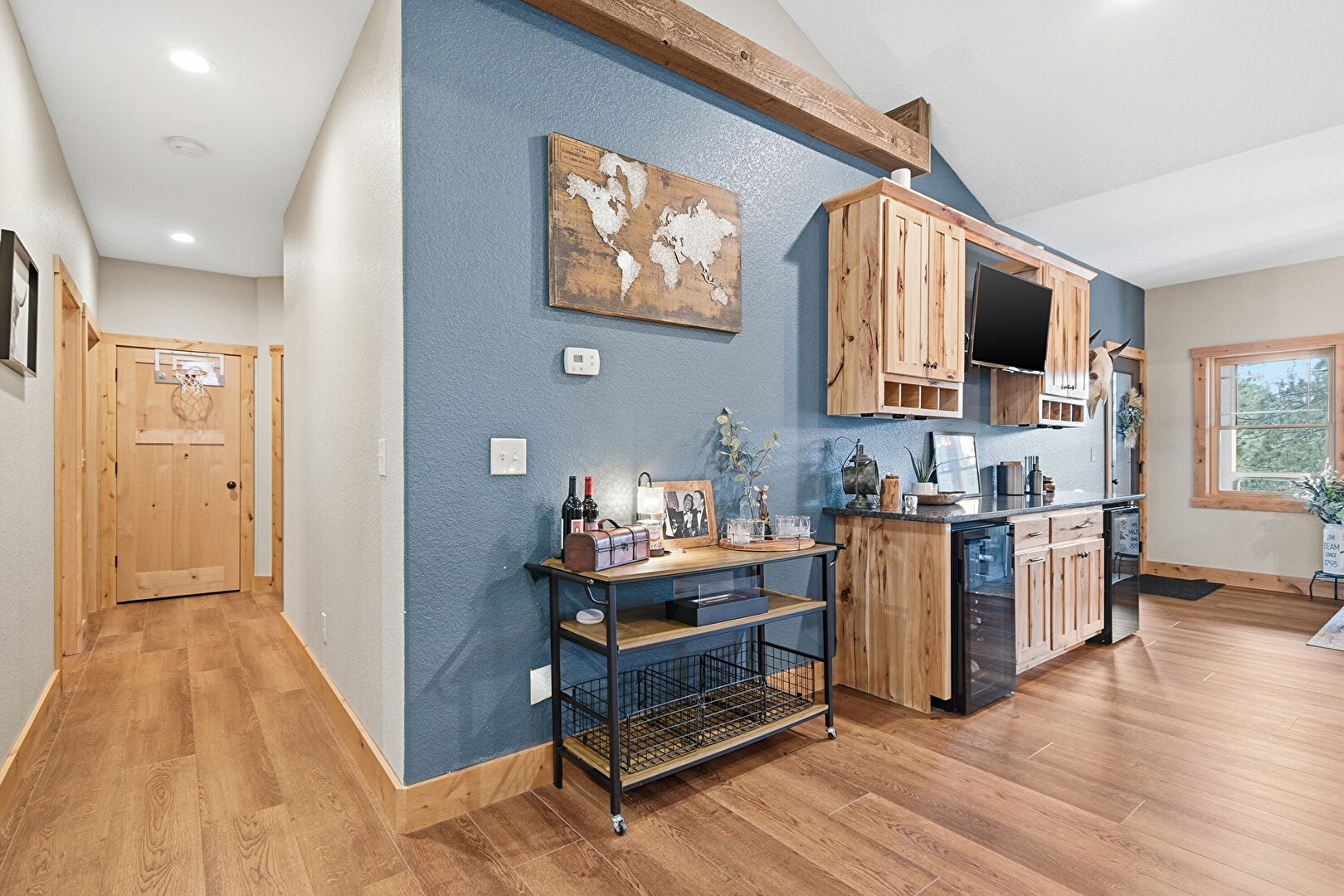 Baseboards Wall, Crown Molding Cabinets, Drywall, Indoor Bar, Recessed Lighting, Shaker Cabinets, Stone Countertops, Textured Wall, Vaulted Ceiling, Wine Cooler, Wood Finish Floor, Natural Light, Open Shelves