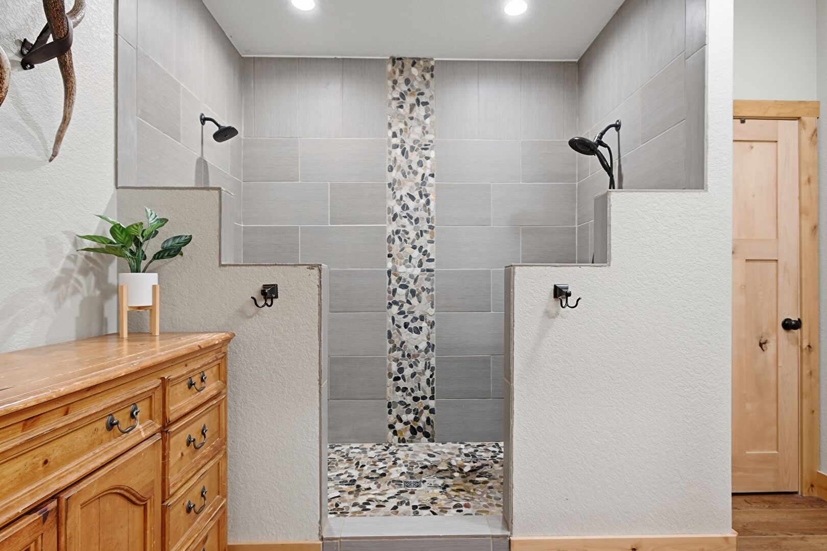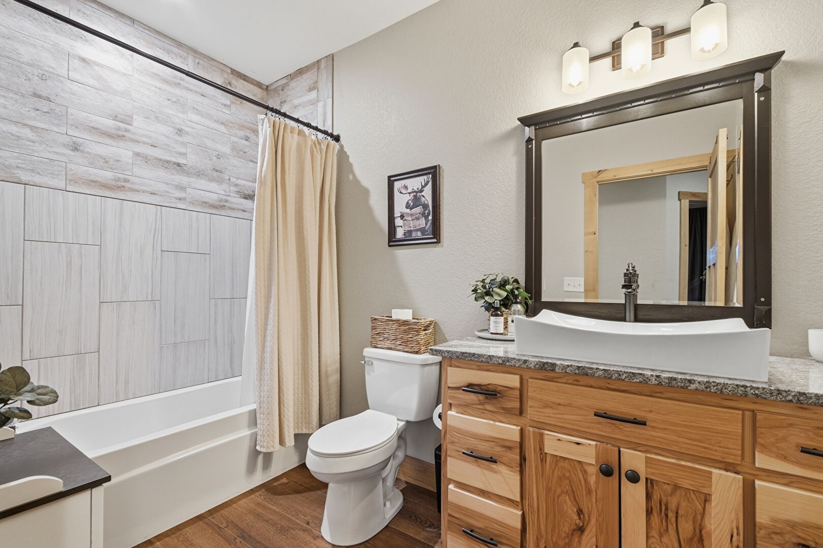Baseboards Wall, Ceiling Fan, Combined Bath Shower, Double Vanity, Drywall, Ensuite Bathroom, Full Bathroom, Natural Light, Textured Wall, Vanity, Wood Finish Floor, Recessed Lighting, Wood Finish Floor