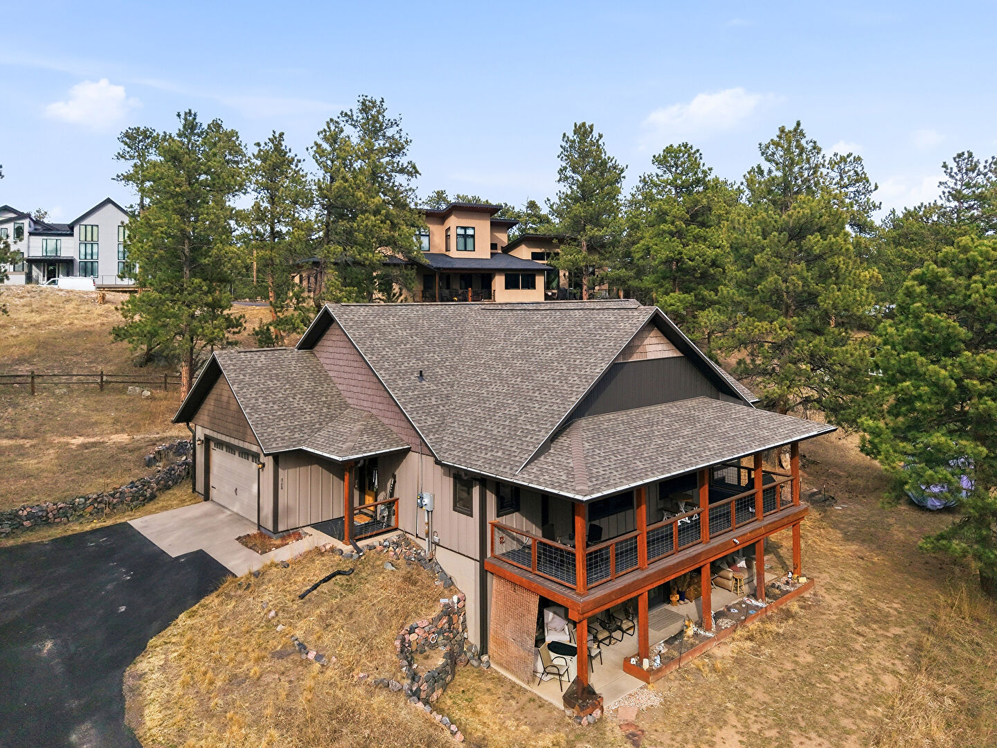 Basement Walk Out, Patio, Shake Shingle Siding, Shingle Roof, Vertical Siding, Board Batten Siding