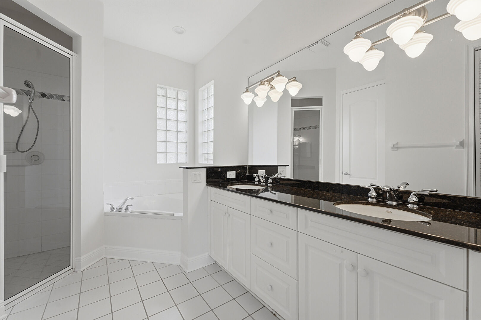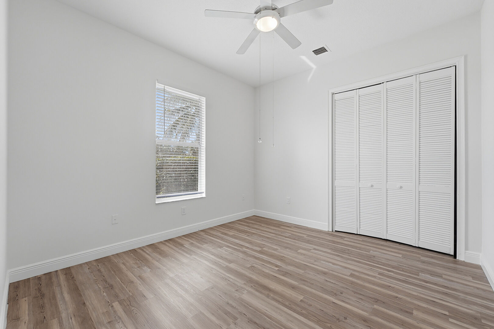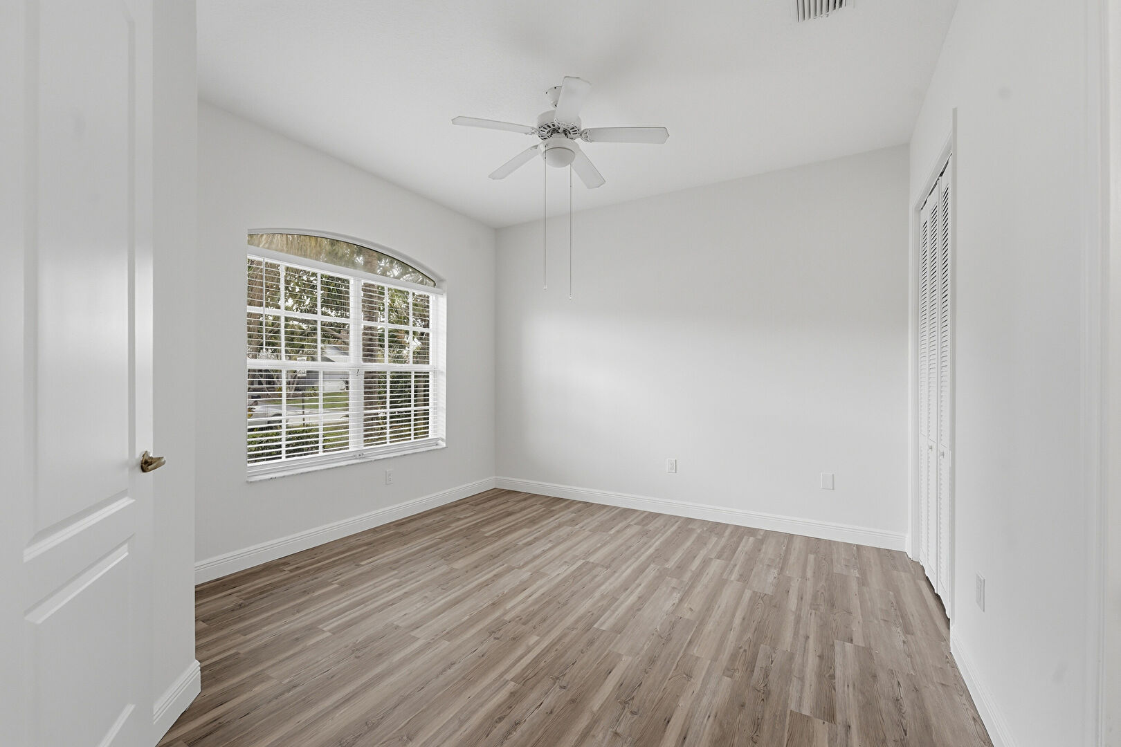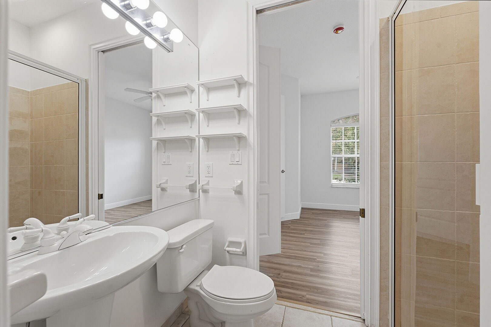 Baseboards Wall, Ceiling Fan, Closet, Double Vanity, Drywall, Full Bathroom, Natural Light, Tile Floor, Vent, Water Closet, Wood Finish Floor, Baseboards Wall, Full Bathroom, Natural Light, Tile Floor