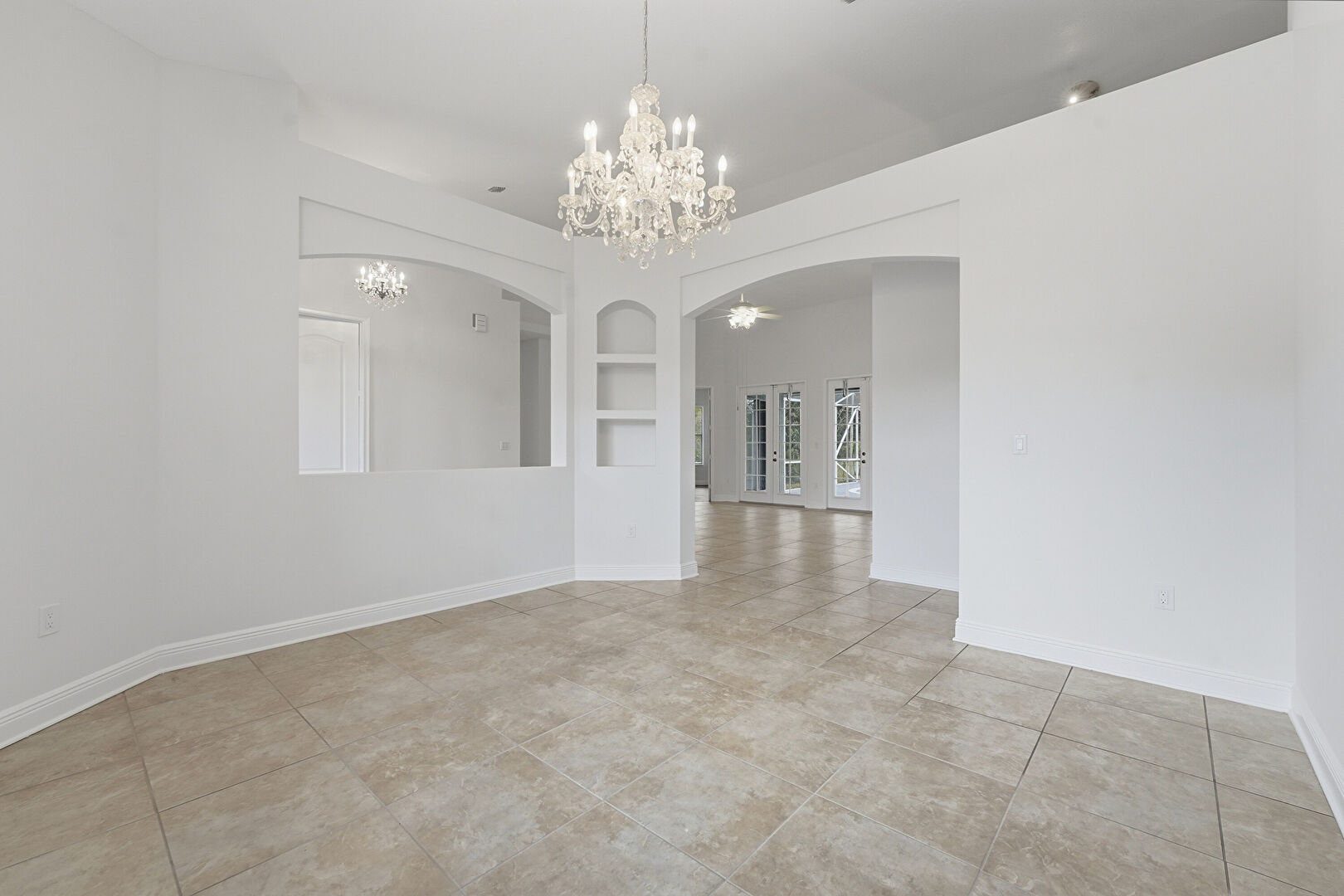 Arched Walkways, Baseboards Wall, Ceiling Fan, Drywall, French Doors, Natural Light, Notable Chandelier, Tile Floor, Vaulted Ceiling, Vent, High Ceiling