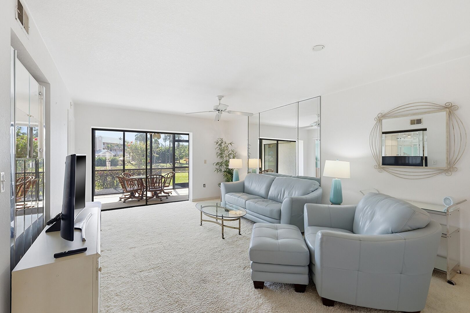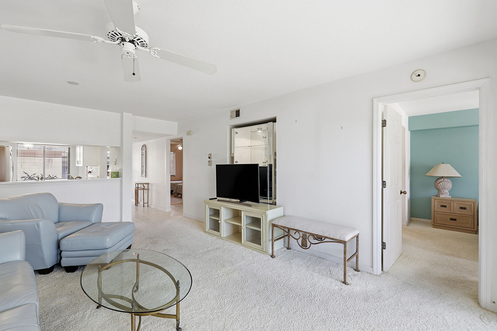 Baseboards Wall, Carpet, Ceiling Fan, Drywall, Natural Light, Vent, Drywall, Smoke Carbon Monoxide Detector, Sunroom