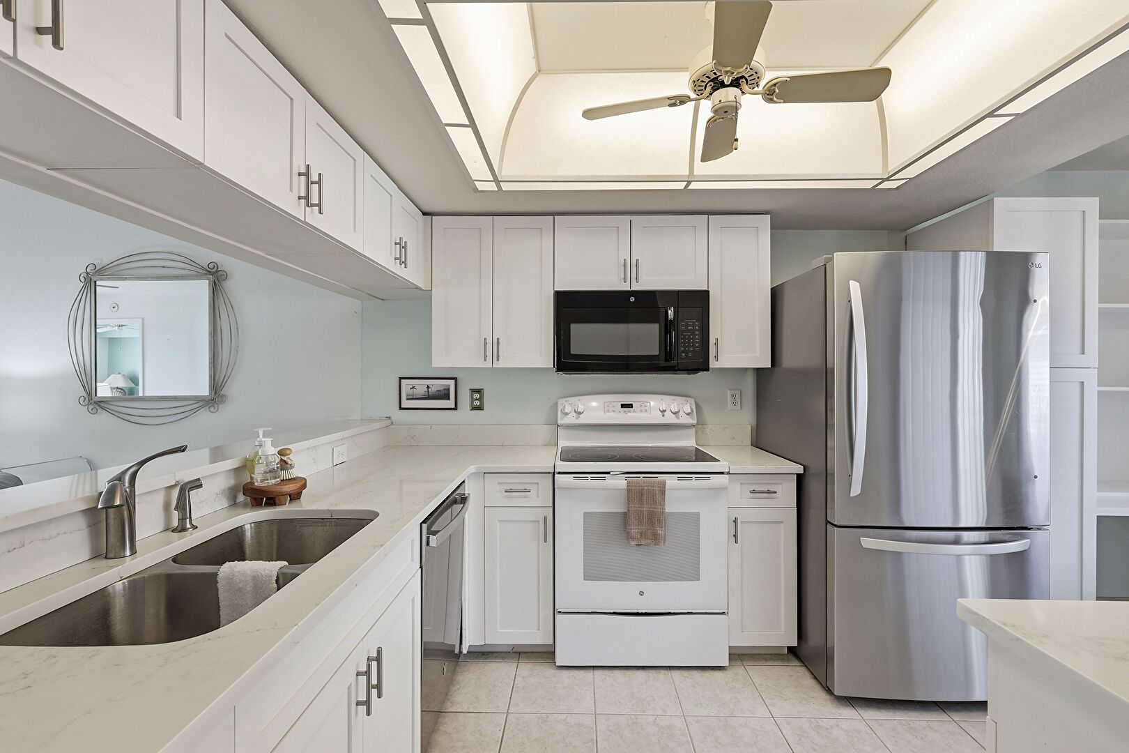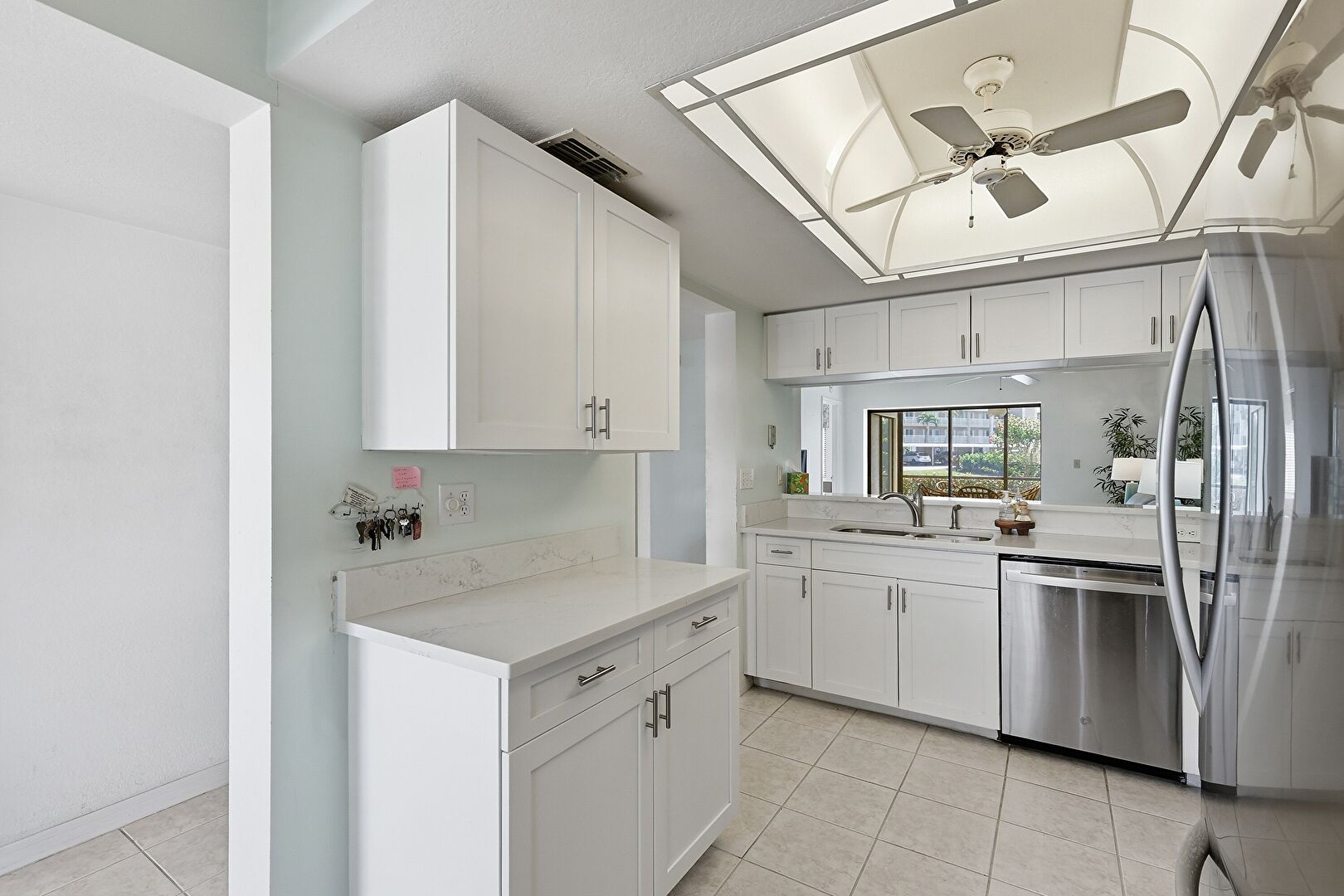 Baseboards Wall, Built In Desk, Carpet, Ceiling Fan, Drywall, Kitchen Peninsula, Natural Light, Notable Chandelier, Office Area, Open Shelves, Opens To Living Area, Pass Through Window, Pendant Lighting, Recessed Lighting, Shaker Cabinets, Stone Countertops, Tile Floor, U Shaped Kitchen, Vent, Drywall, Kitchen Peninsula, Shaker Cabinets, Tile Floor