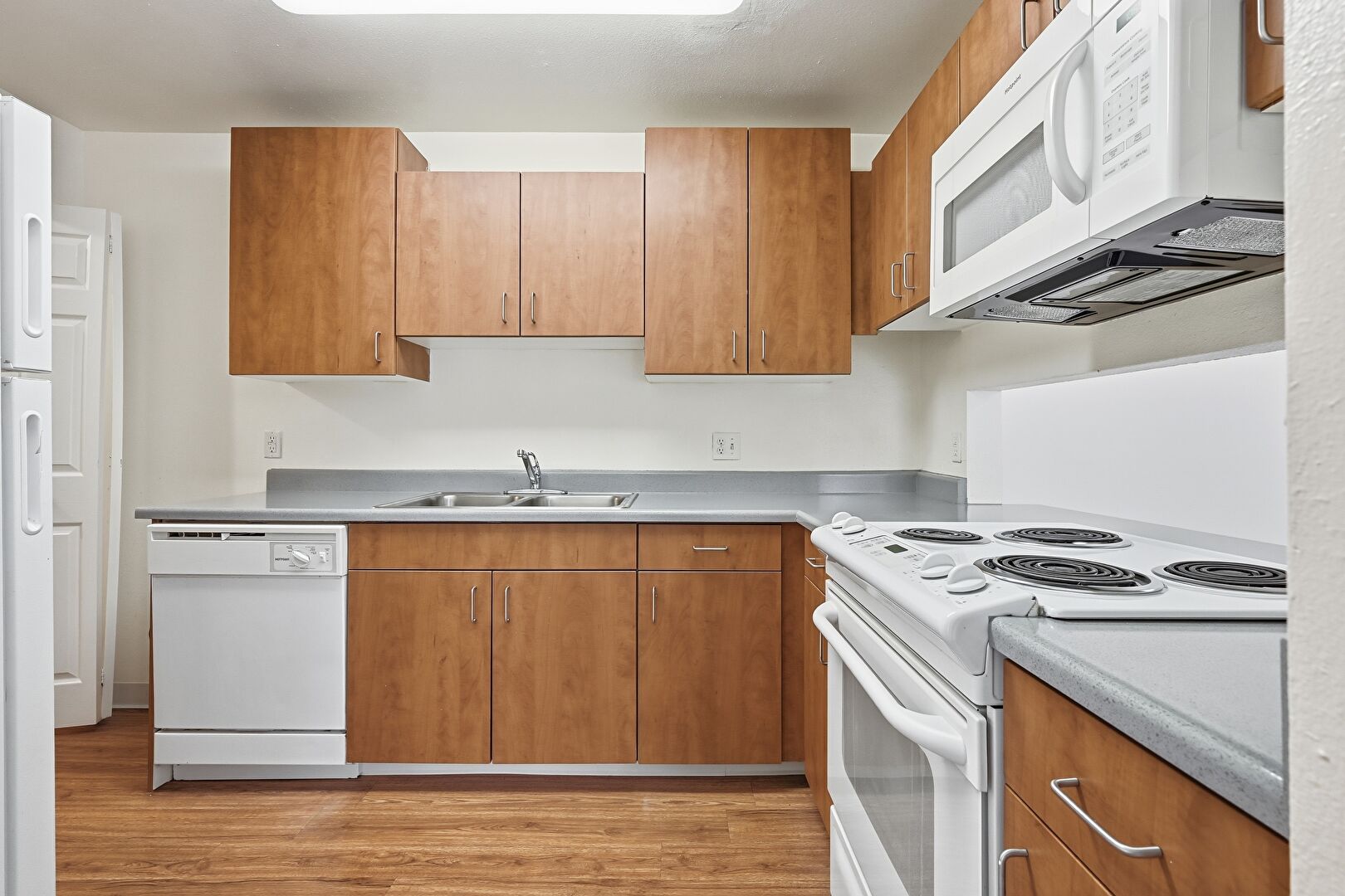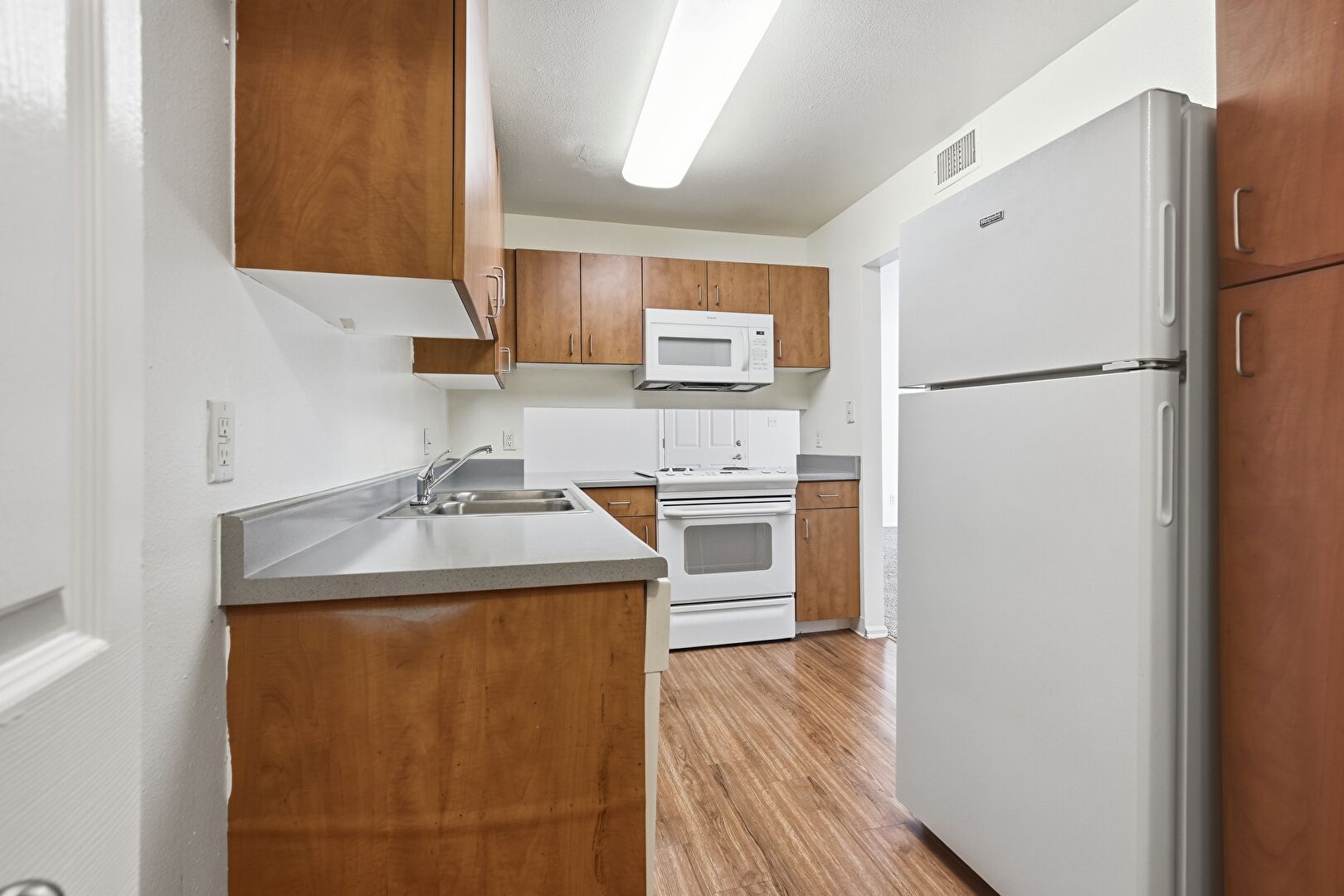 Drywall, Medium Brown Cabinets, U Shaped Kitchen, Vent, Wood Finish Floor, Medium Brown Cabinets, Wood Finish Floor