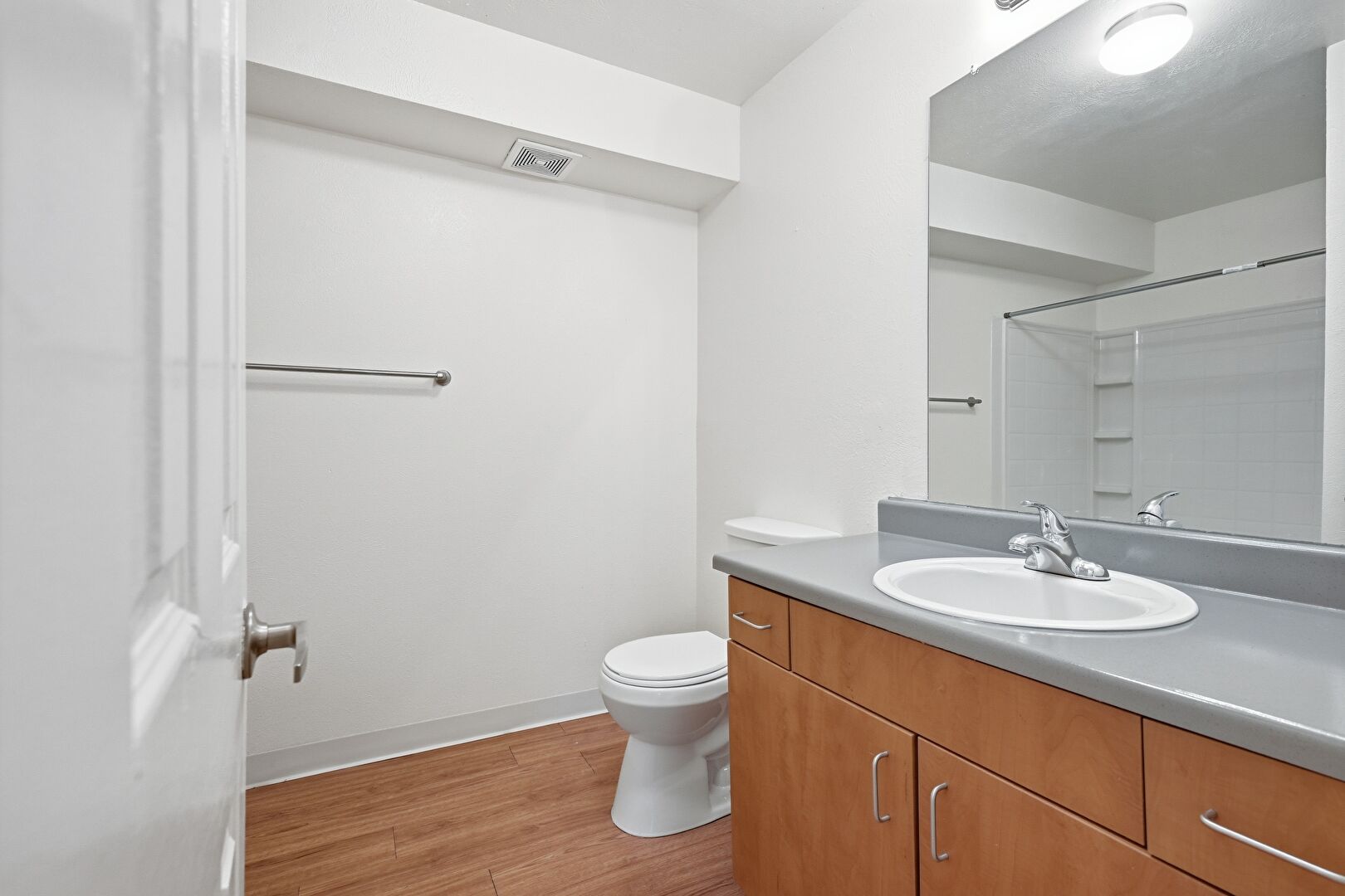Baseboards Wall, Drywall, Full Bathroom, Vanity, Vent, Wood Finish Floor