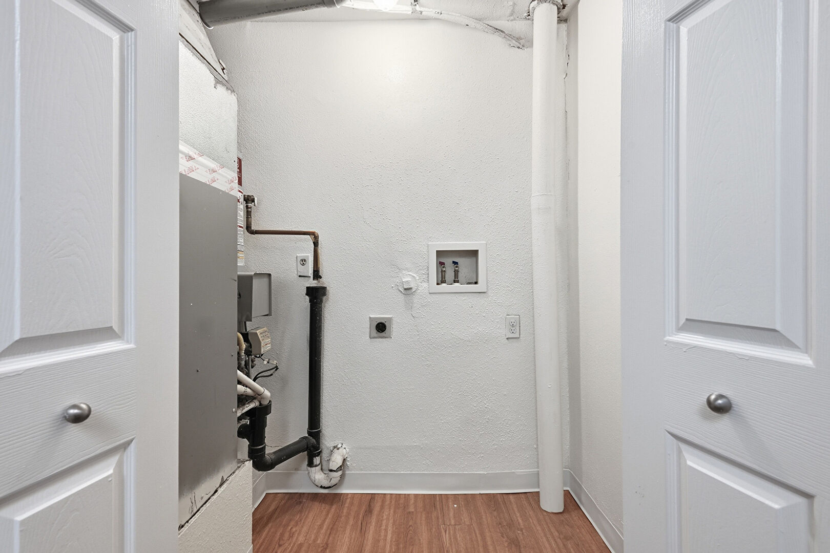 Baseboards Wall, Electric Dryer Hookup, Gas Dryer Hookup, Laundry, Textured Wall, Washer Hookup, Wood Finish Floor, Furnace
