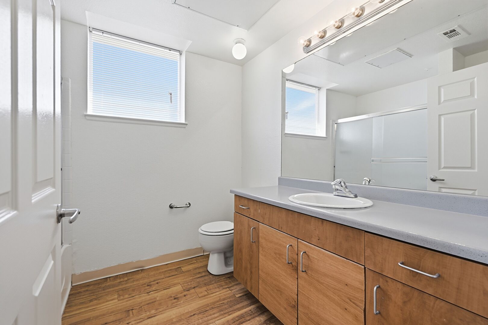 Baseboards Wall, Drywall, Full Bathroom, Natural Light, Vent, Wood Finish Floor, Vanity