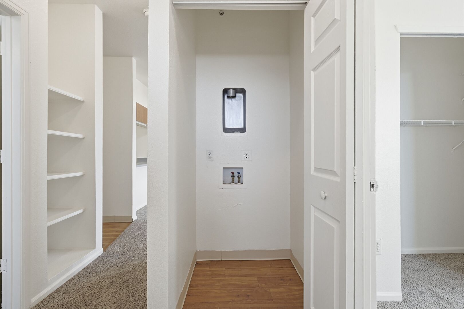 Baseboards Wall, Carpet, Laundry, Washer Hookup, Wood Finish Floor, Drywall