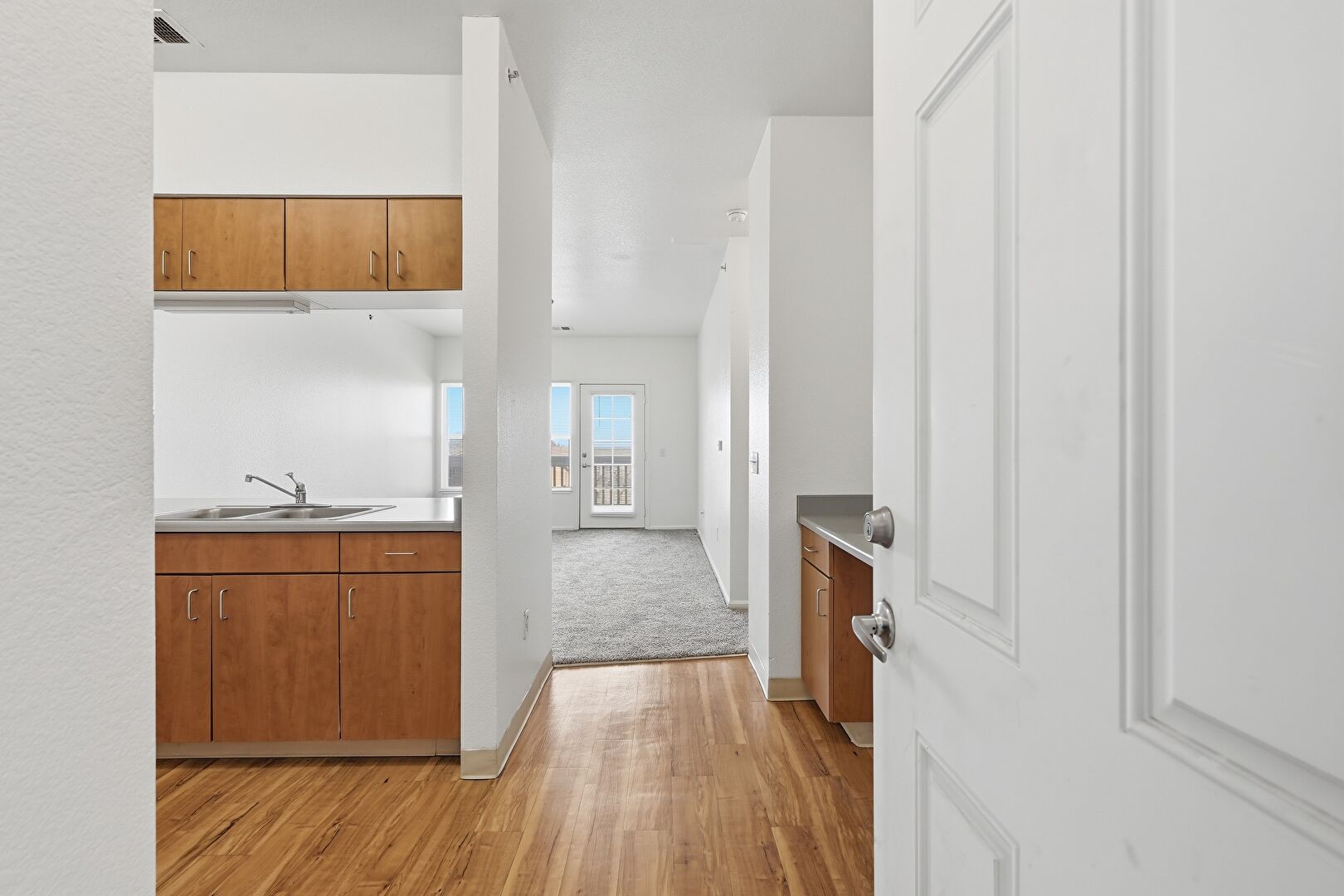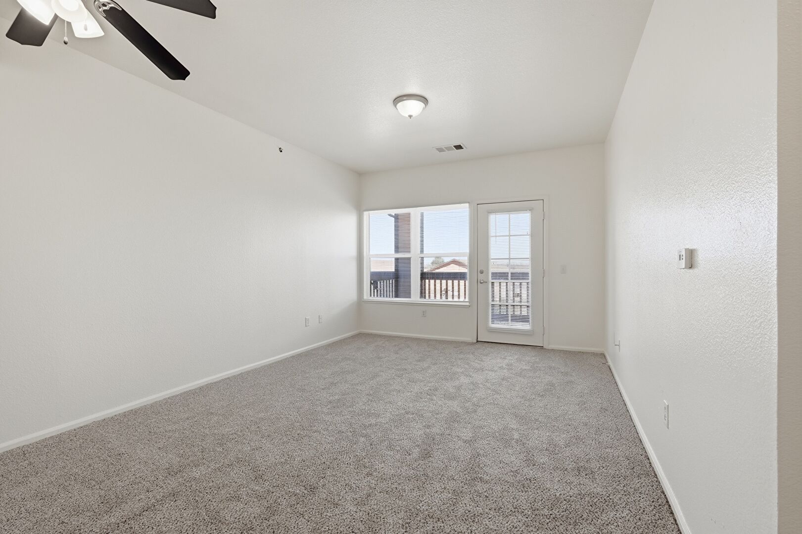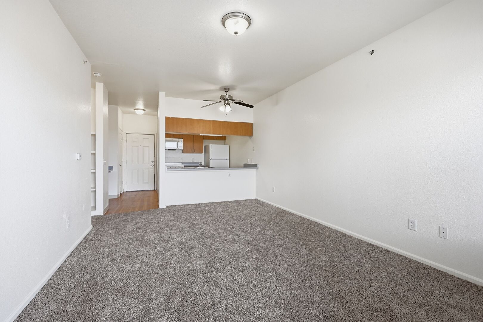 Baseboards Wall, Carpet, Ceiling Fan, Drywall, Natural Light, Vent, Carpet, Galley Kitchen