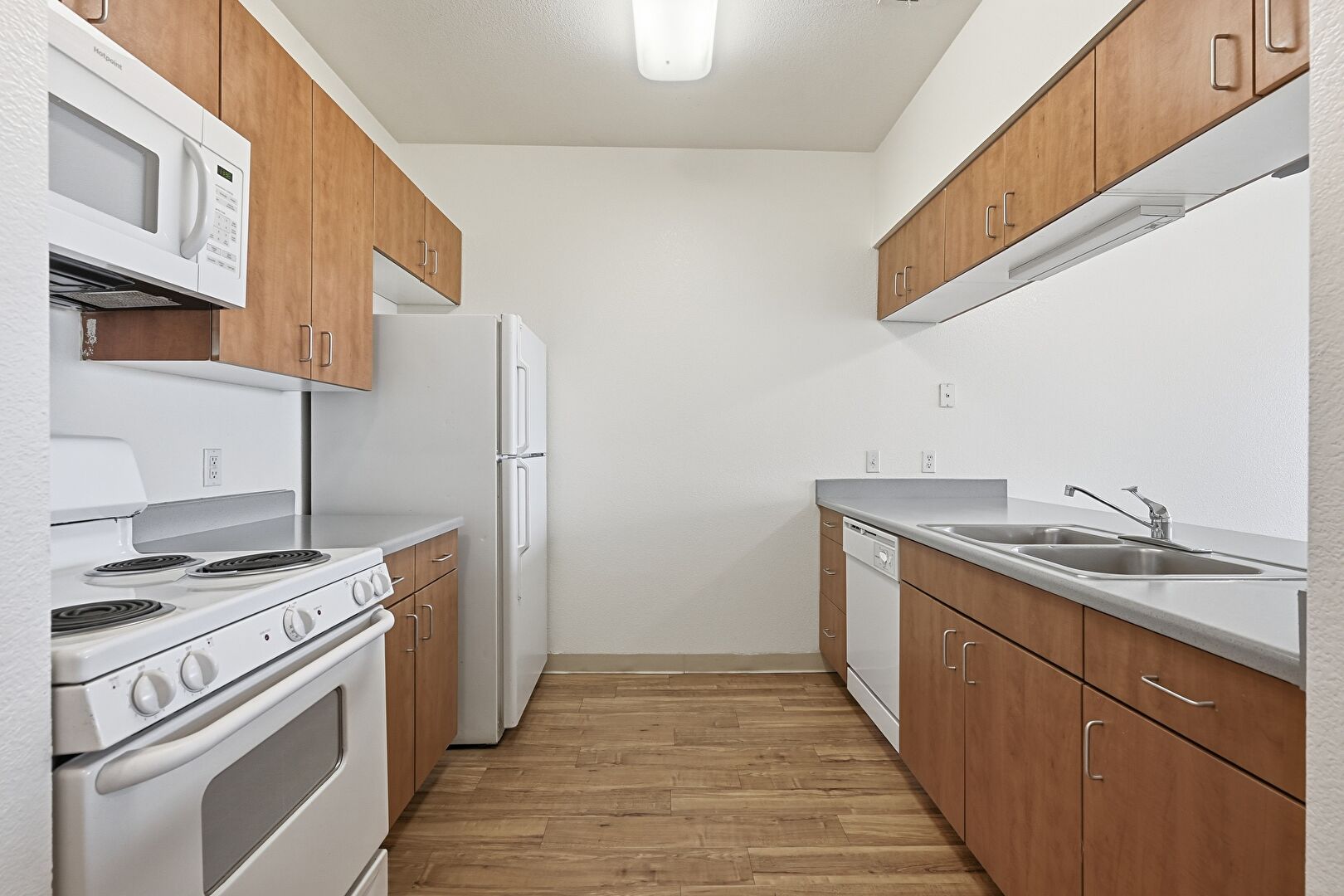Baseboards Wall, Drywall, Medium Brown Cabinets, Wood Finish Floor, Galley Kitchen