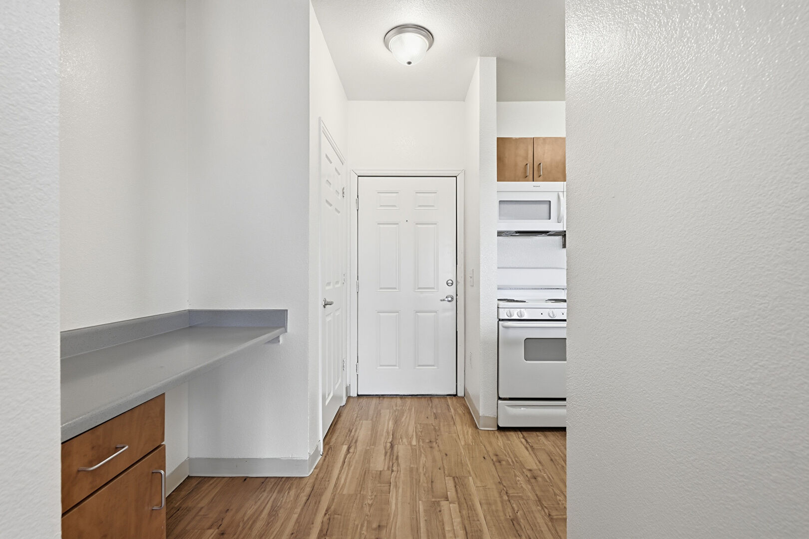 Baseboards Wall, Built In Desk, Medium Brown Cabinets, Textured Wall, Wood Finish Floor, Office Area