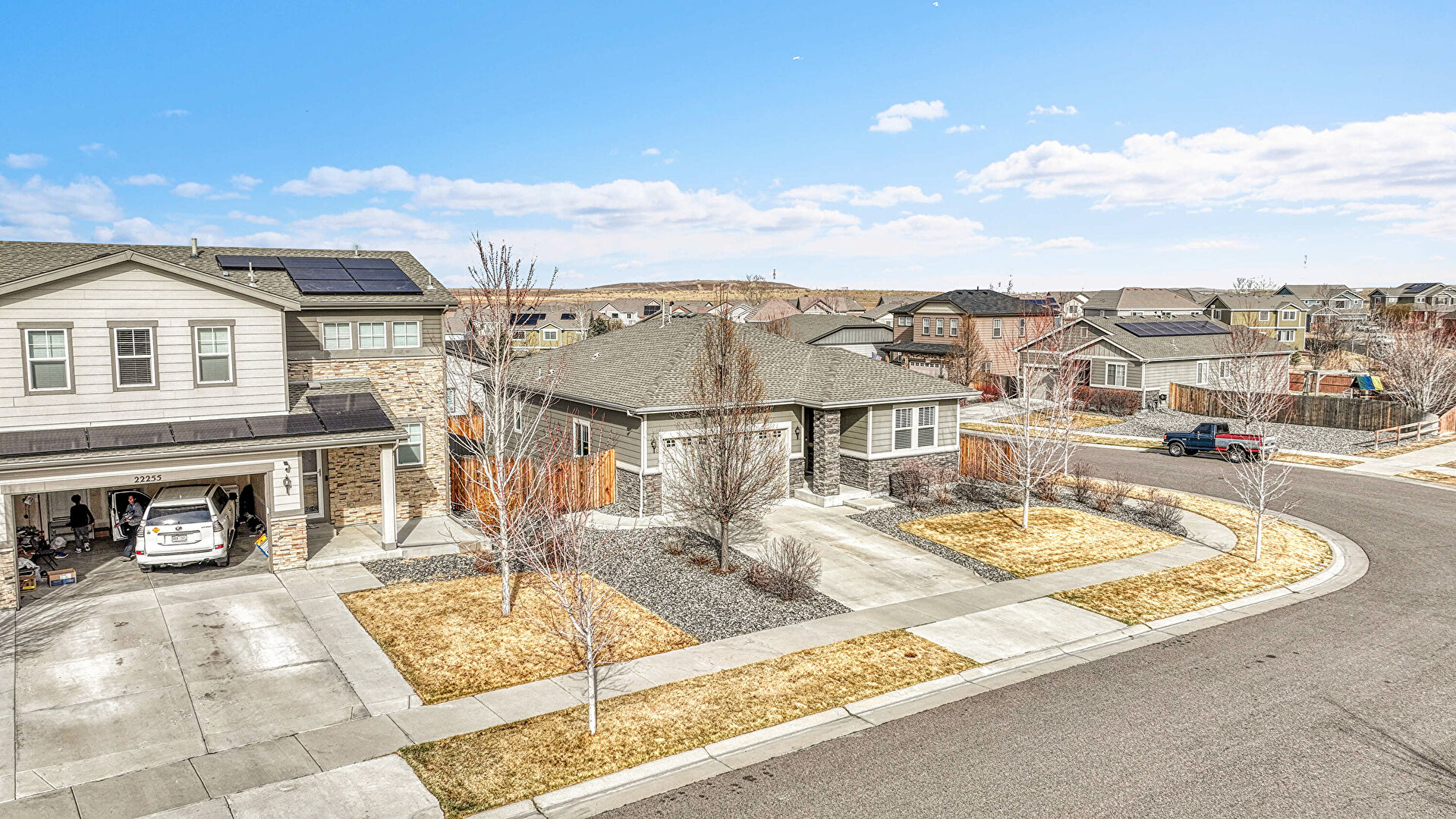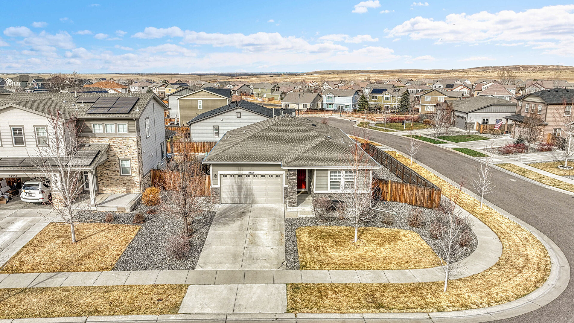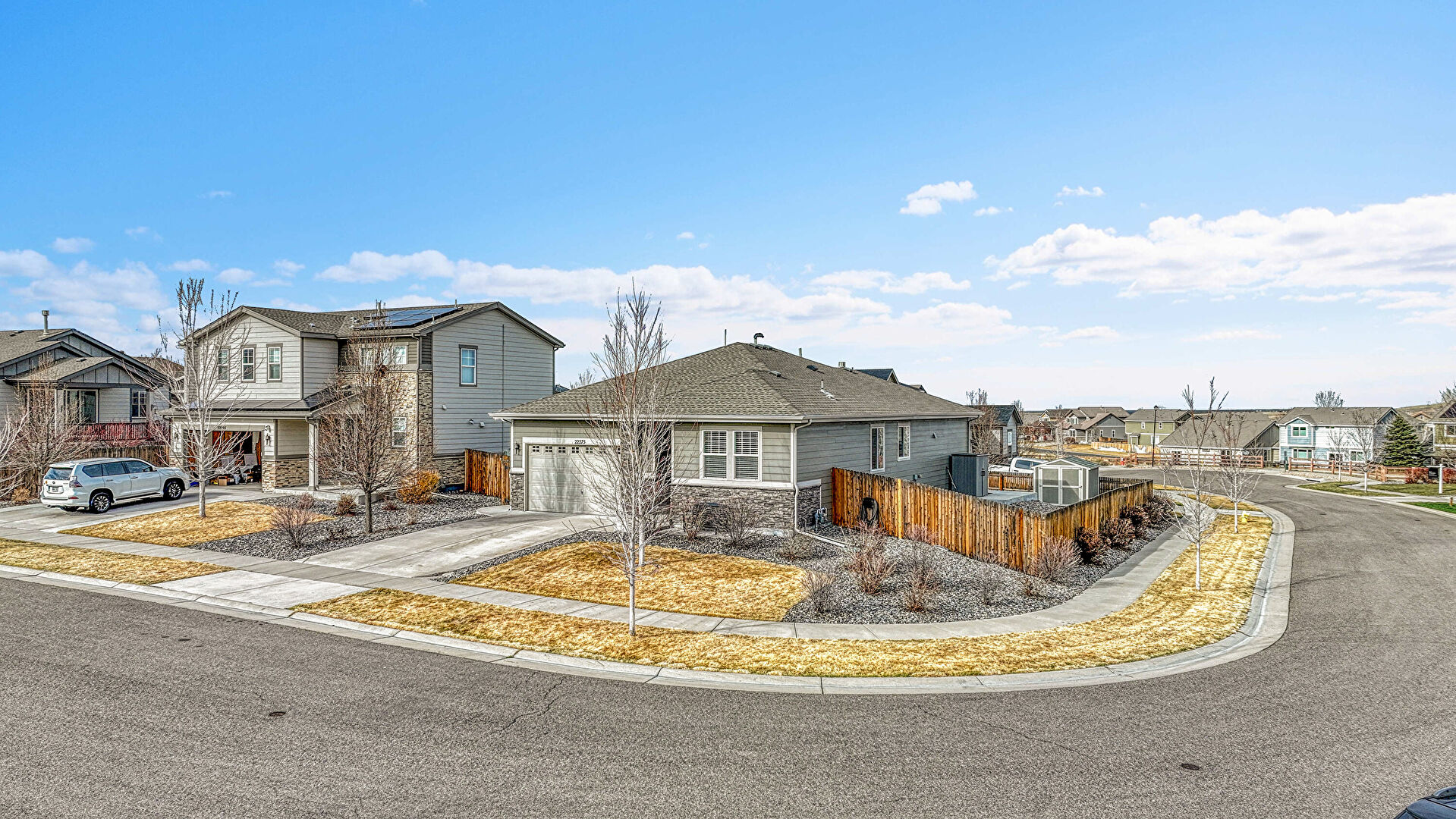 Concrete Foundation, Downspout, Driveway, Fence, Gutters, Horizontal Siding, Lawn, Residential View, Shingle Roof, Stone Siding, Concrete Foundation, Horizontal Siding, Lawn, Solar Panels