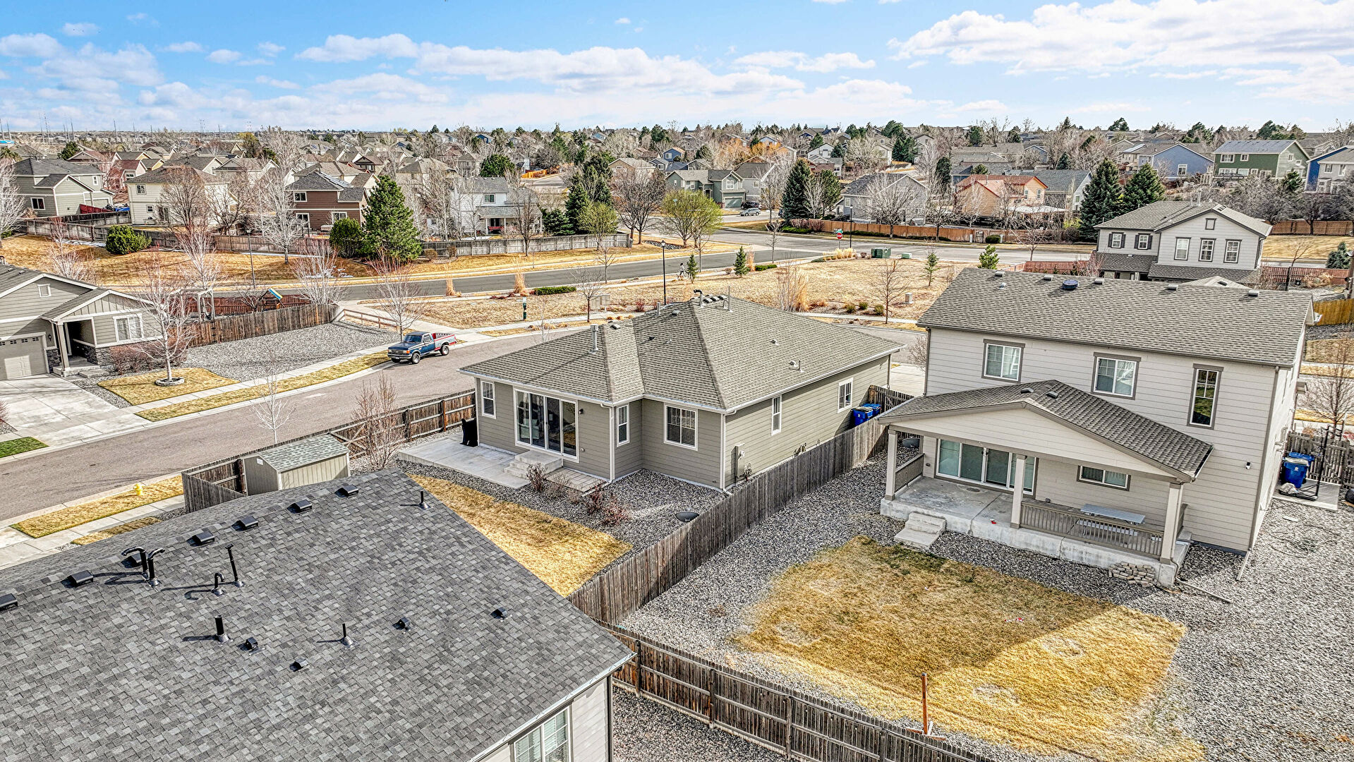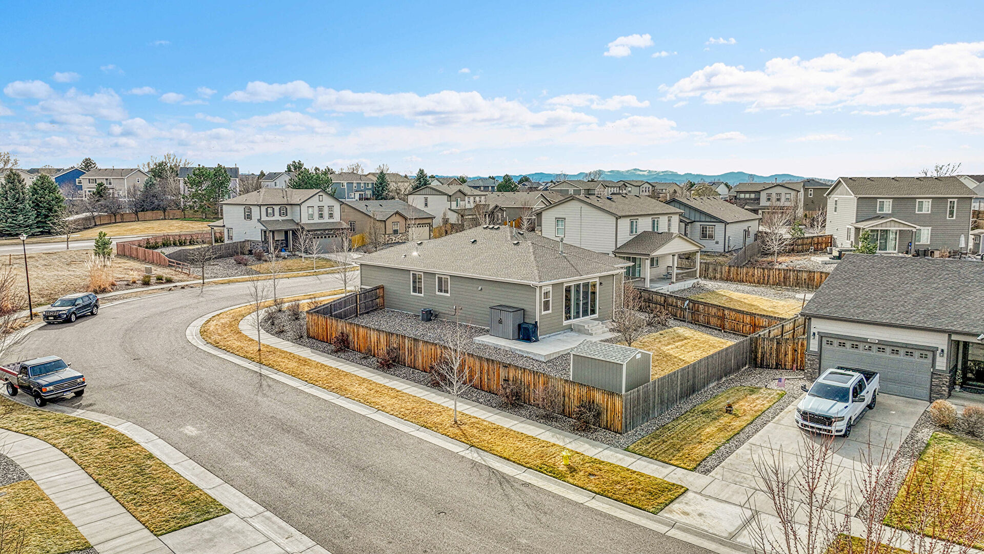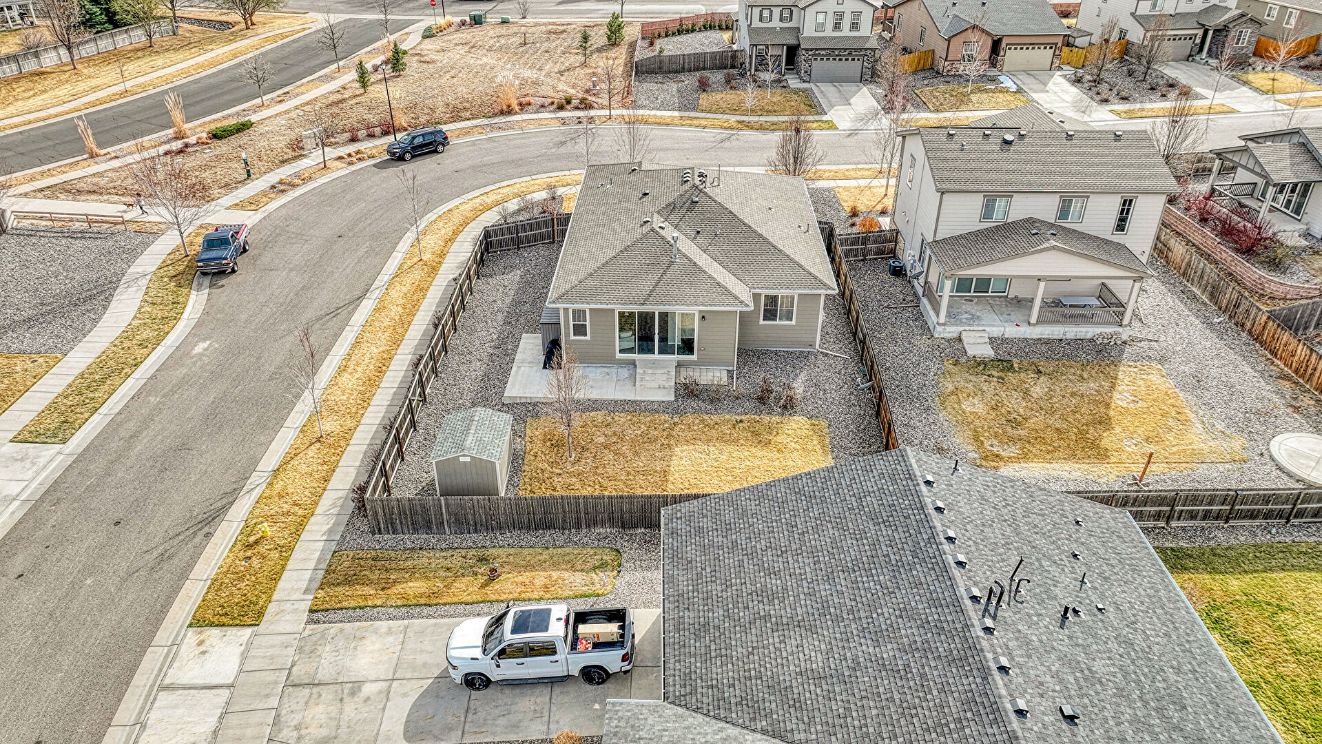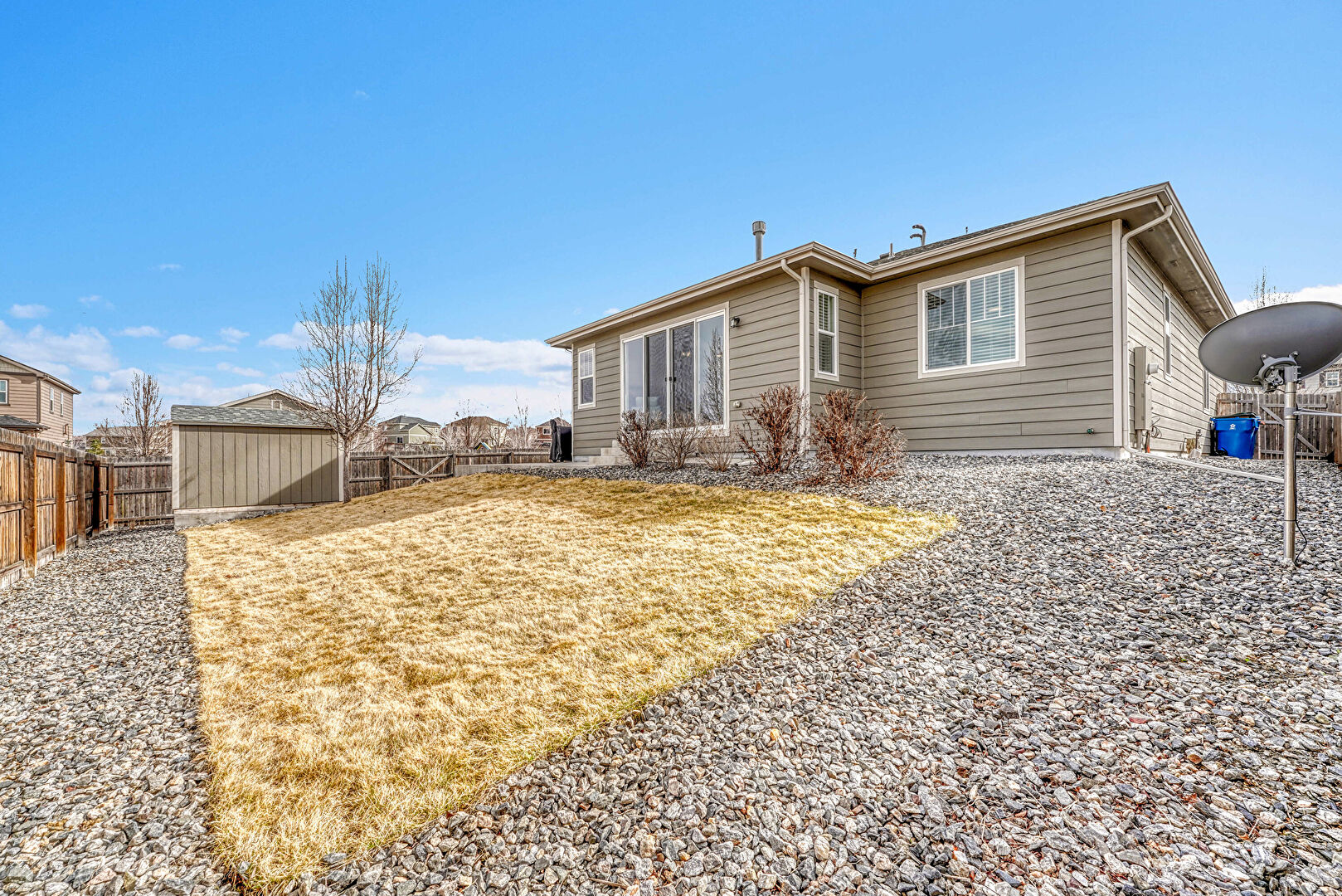 Concrete Foundation, Downspout, Fence, Gutters, Horizontal Siding, Lawn, Parking Pad, Residential View, Satellite Dish, Shed, Concrete Foundation, Outdoor Structure