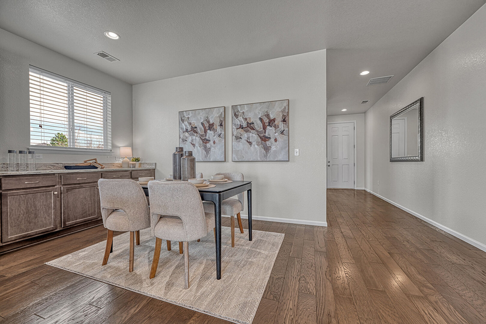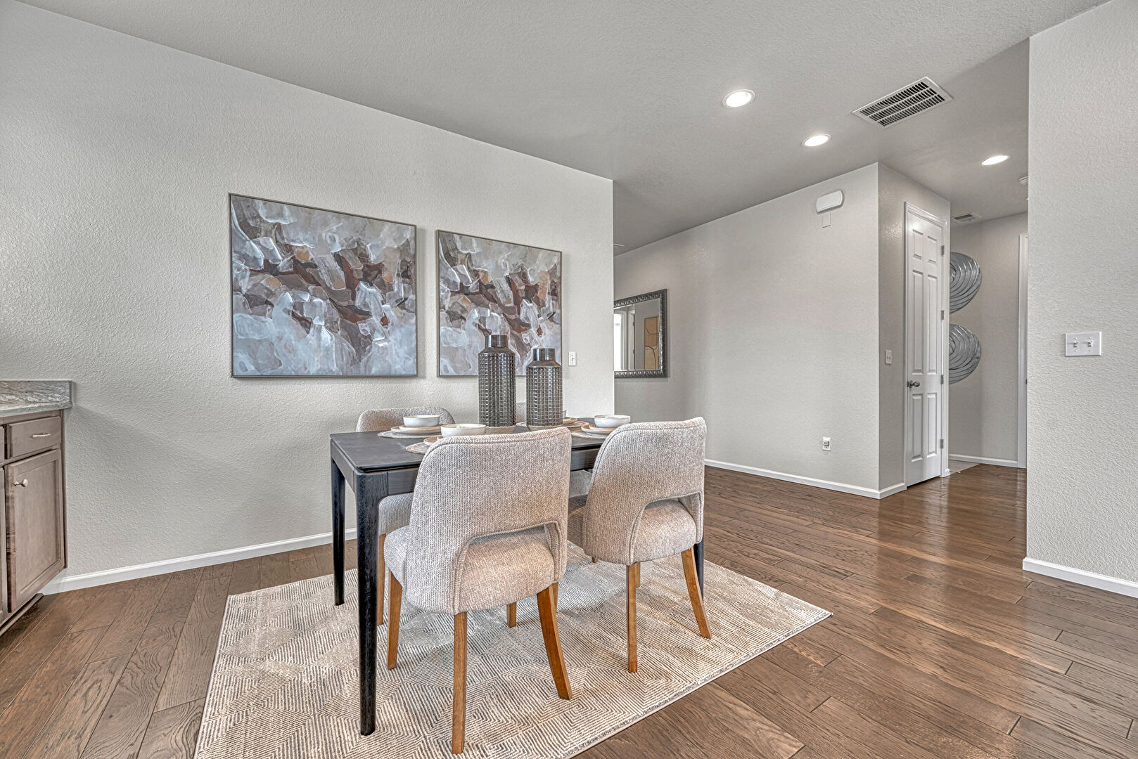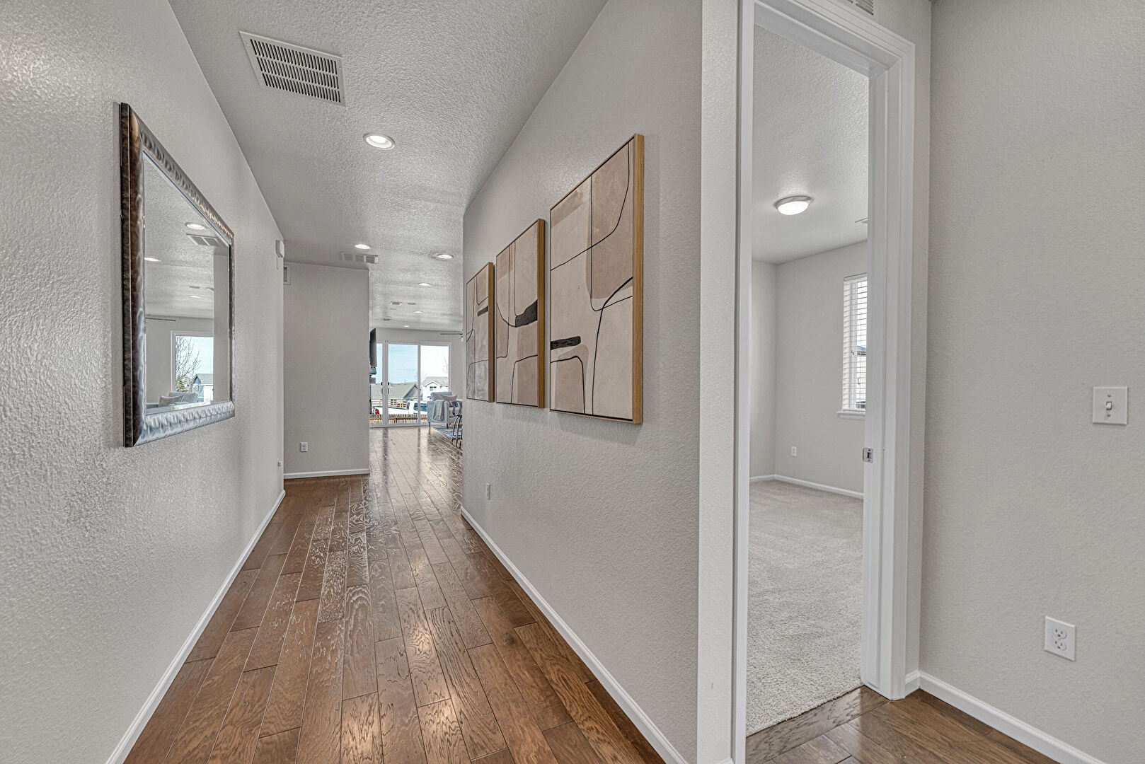 Baseboards Wall, Recessed Lighting, Textured Ceiling, Textured Wall, Vent, Wood Finish Floor, Natural Light