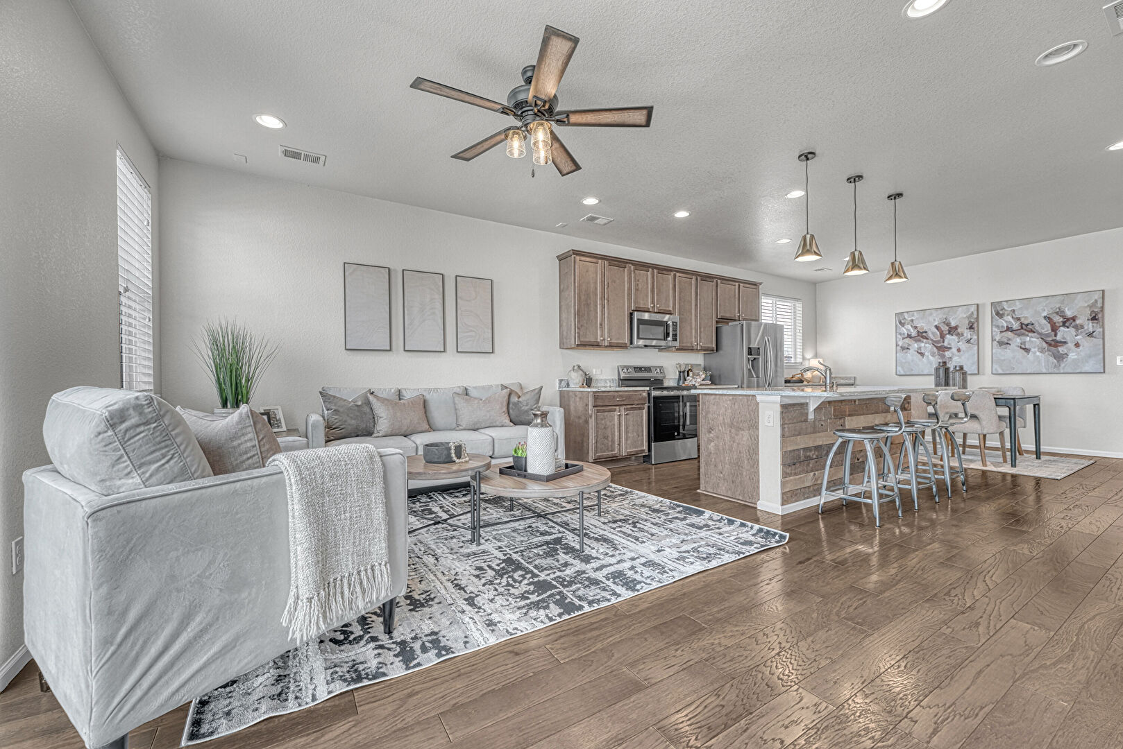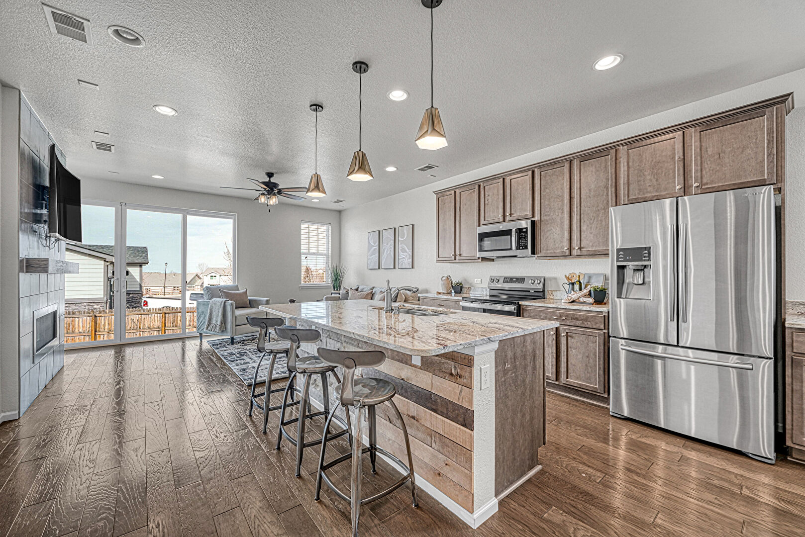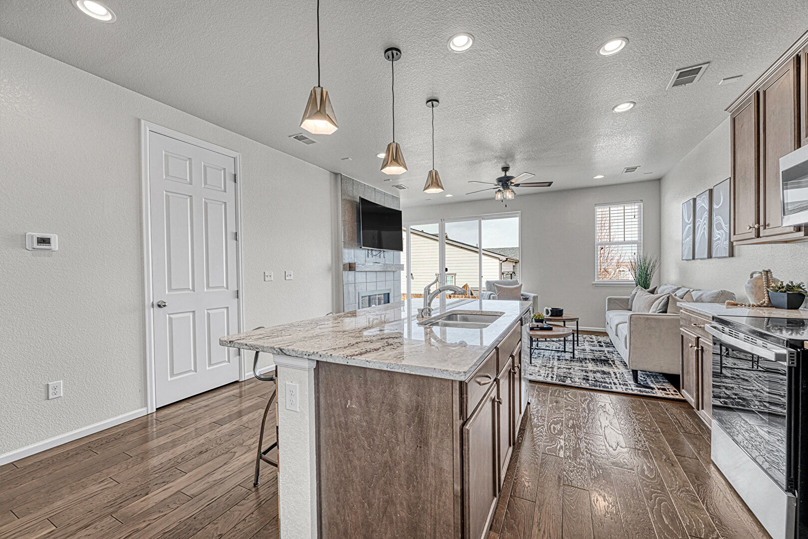 Baseboards Wall, Ceiling Fan, Crown Molding Cabinets, Drywall, Fireplace, Kitchen Bar, Kitchen Island, Medium Brown Cabinets, Natural Light, One Wall Kitchen, Opens To Living Area, Pendant Lighting, Recessed Lighting, Shaker Cabinets, Stone Countertops, Textured Ceiling, Textured Wall, Vent, Wood Finish Floor, Medium Brown Cabinets, Natural Light, Textured Ceiling, Vent