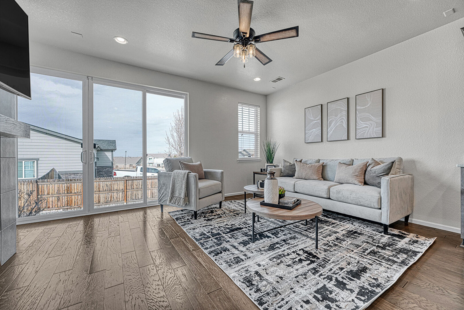 Baseboards Wall, Drywall, Fireplace, Natural Light, Recessed Lighting, Textured Ceiling, Textured Wall, Vent, Wood Finish Floor, Ceiling Fan, Textured Ceiling, Wood Finish Floor