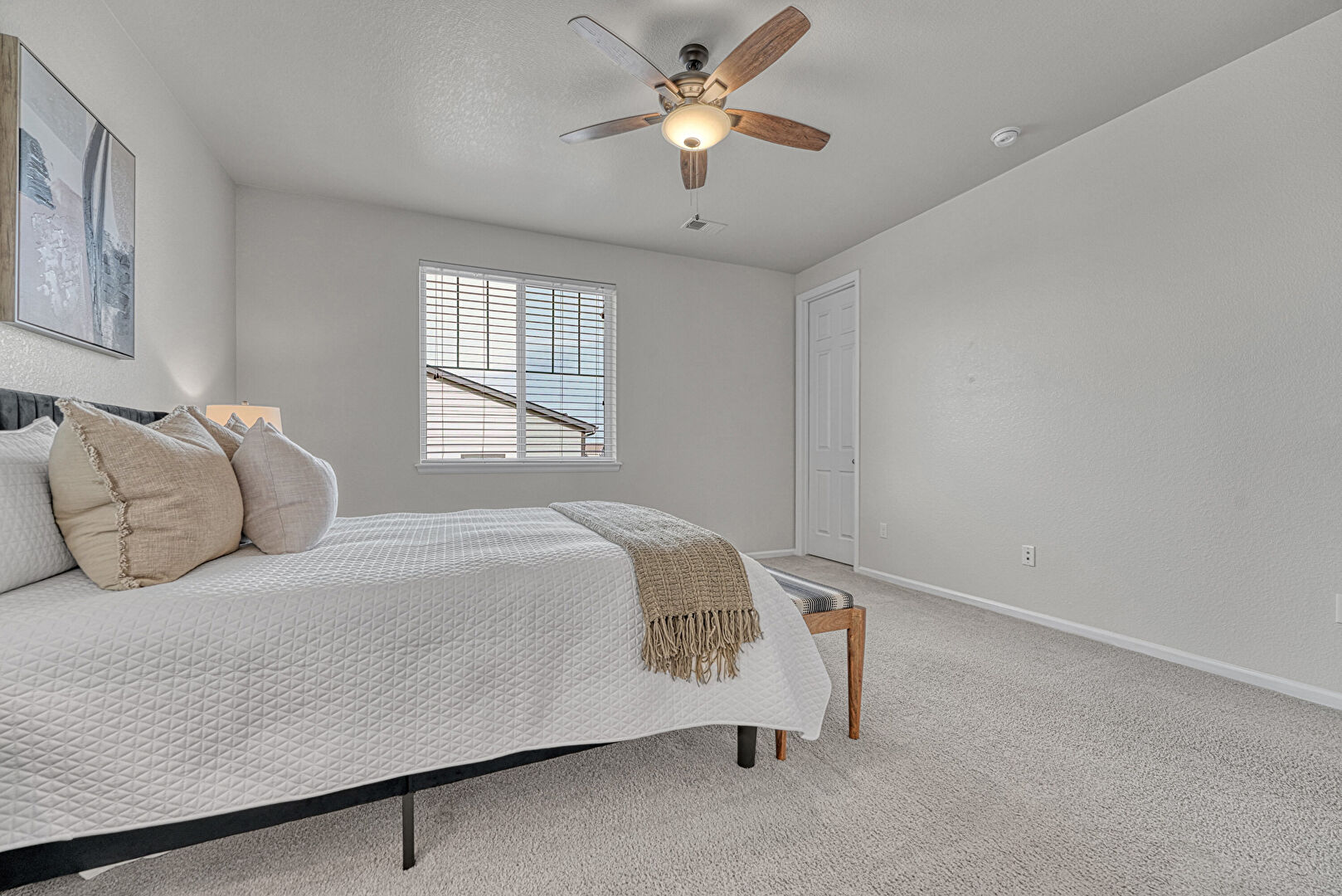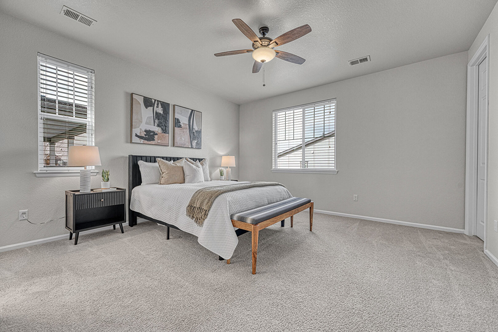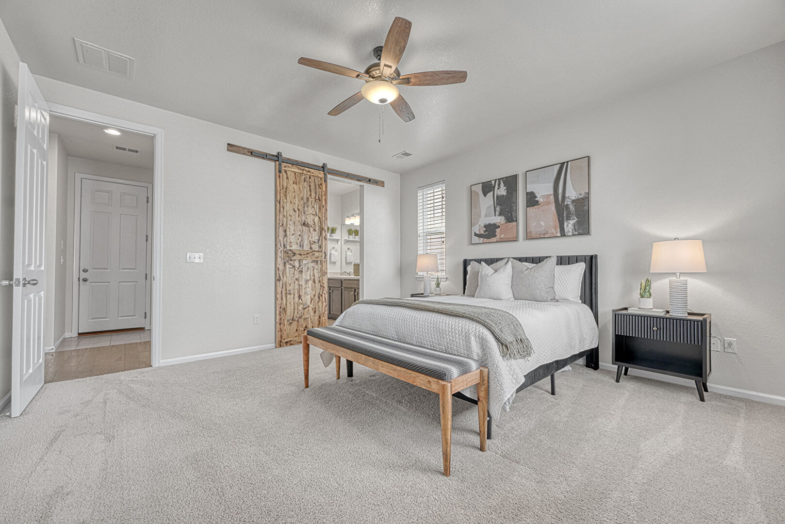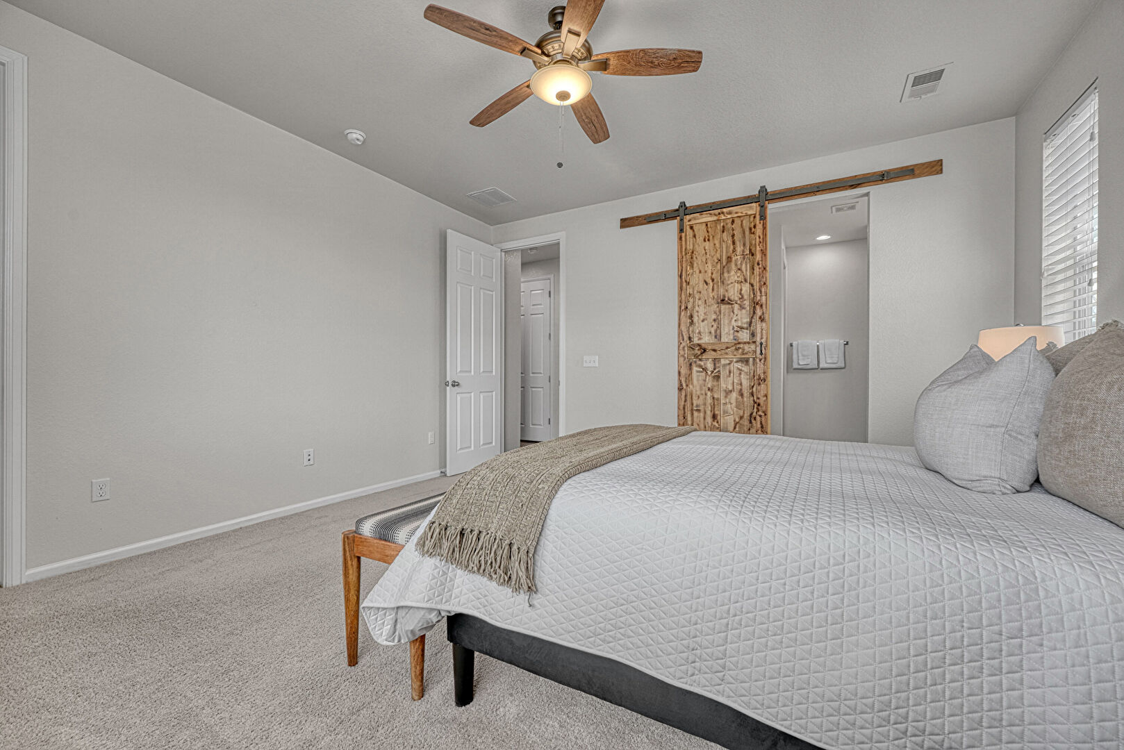 Barn Door, Baseboards Wall, Carpet, Ceiling Fan, Drywall, Ensuite Bathroom, Natural Light, Textured Ceiling, Textured Wall, Vent, Baseboards Wall, Drywall, Natural Light, Textured Ceiling