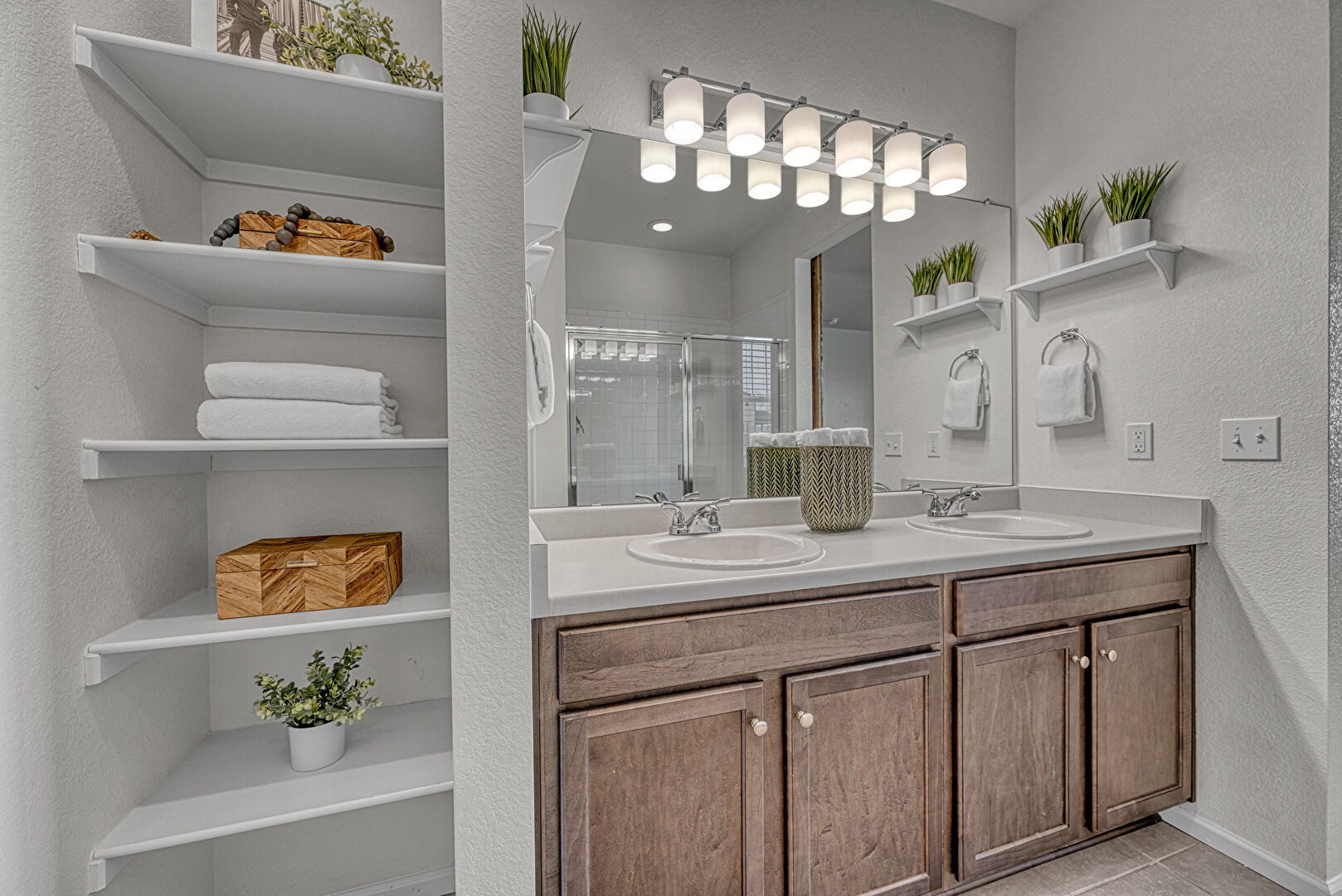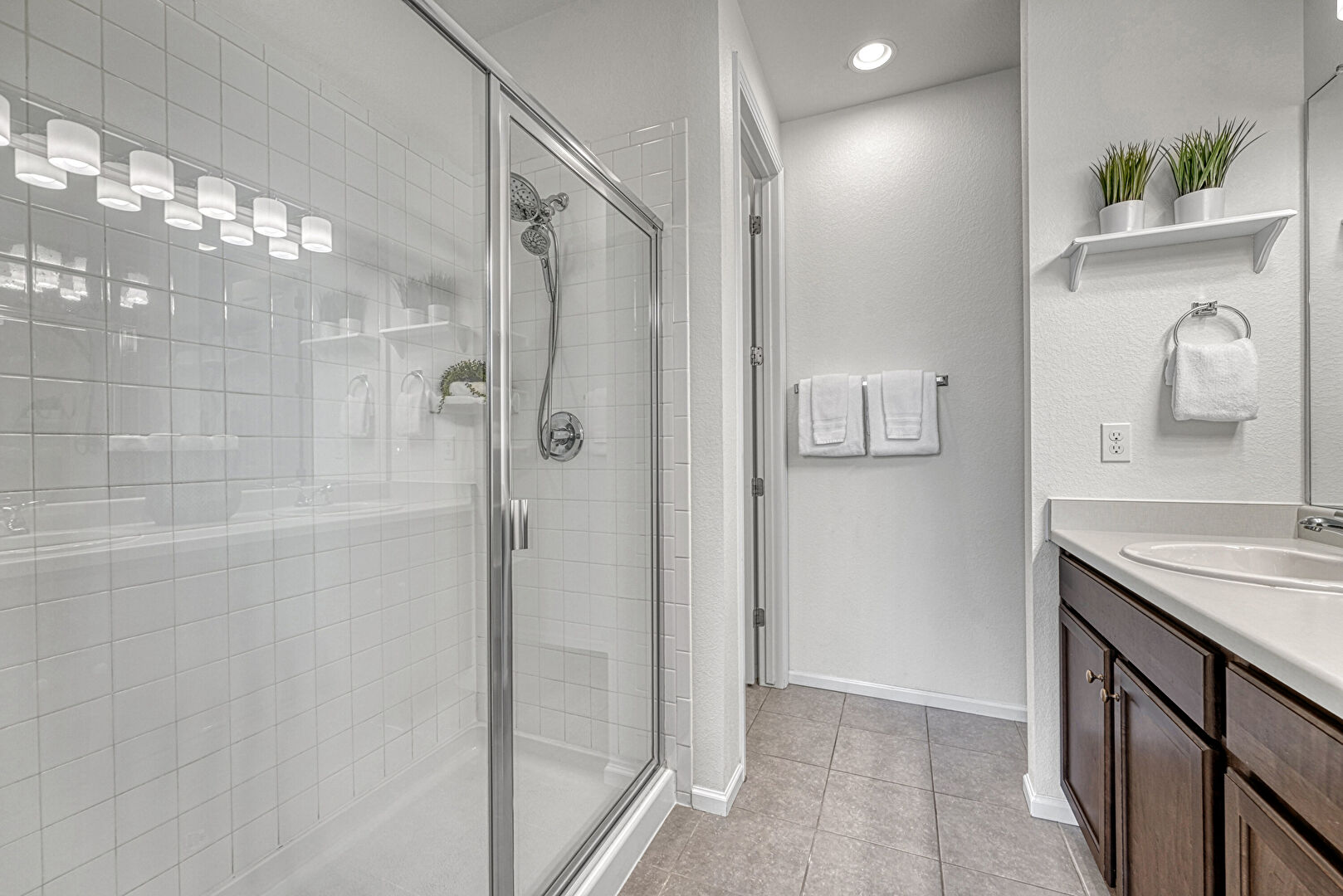 Baseboards Wall, Closet, Double Vanity, Drywall, Full Bathroom, Recessed Lighting, Textured Wall, Tile Floor, Vanity, Full Bathroom, Recessed Lighting, Tile Floor