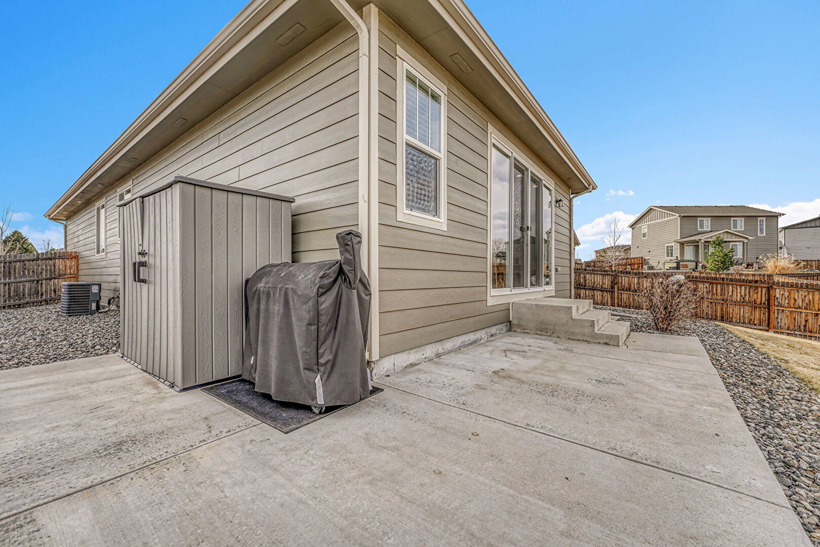 Central Ac, Concrete Foundation, Downspout, Entry Steps, Fence, Gate, Grill, Gutters, Horizontal Siding, Outdoor Structure, Residential View, Shed, Patio