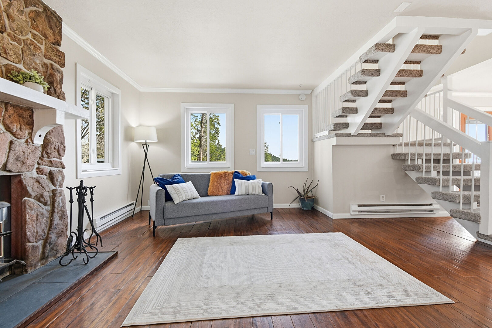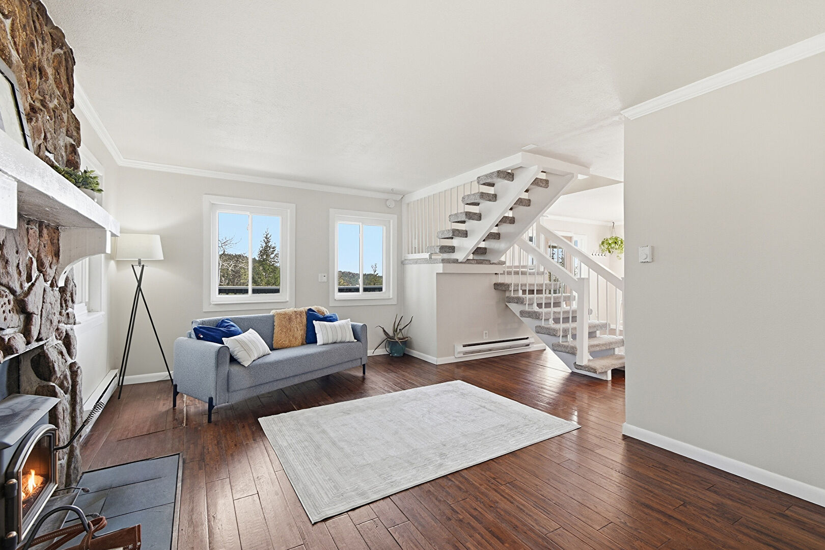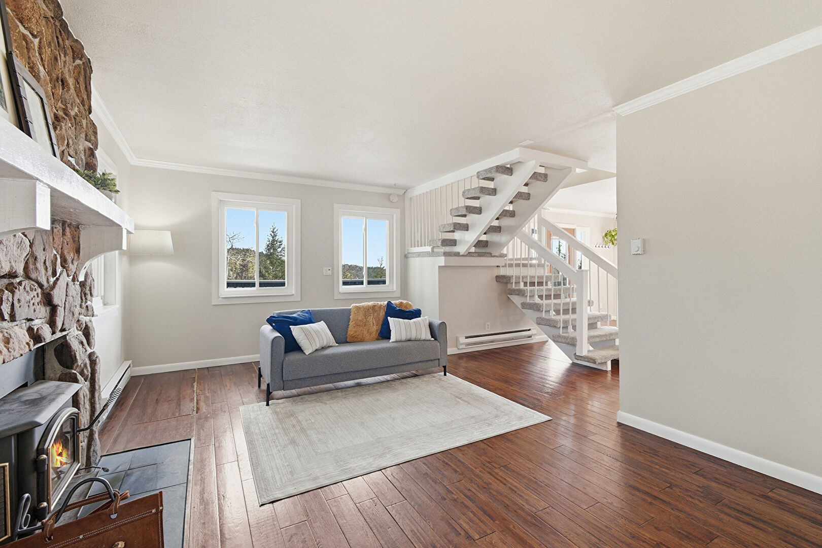 Baseboard Radiator, Baseboards Wall, Crown Molding, Drywall, Fireplace, Natural Light, Stairs, Wood Finish Floor