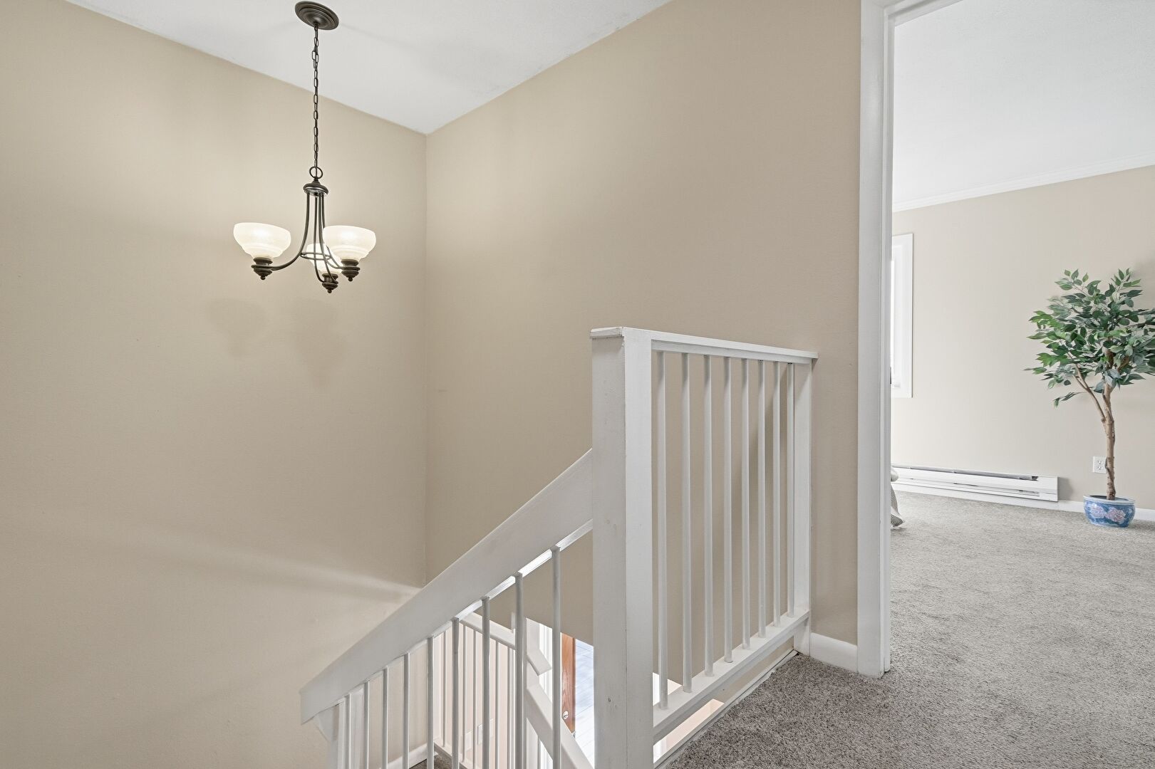 Baseboard Radiator, Baseboards Wall, Drywall, Notable Chandelier, Upstairs Landing, Carpet