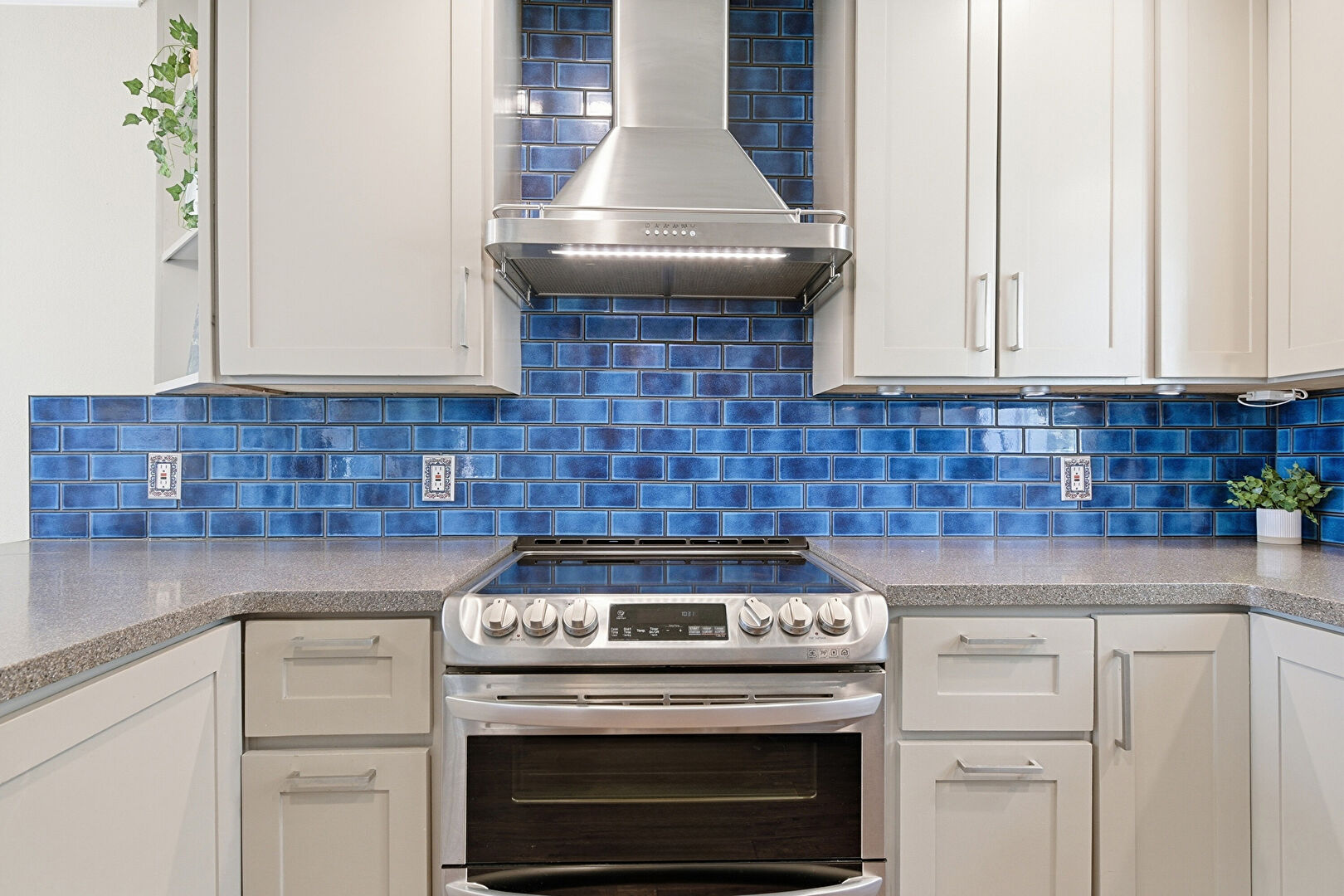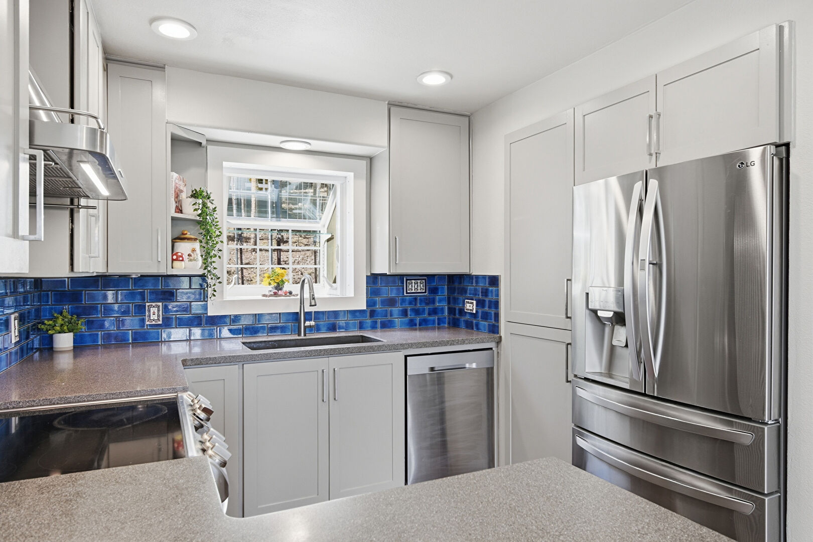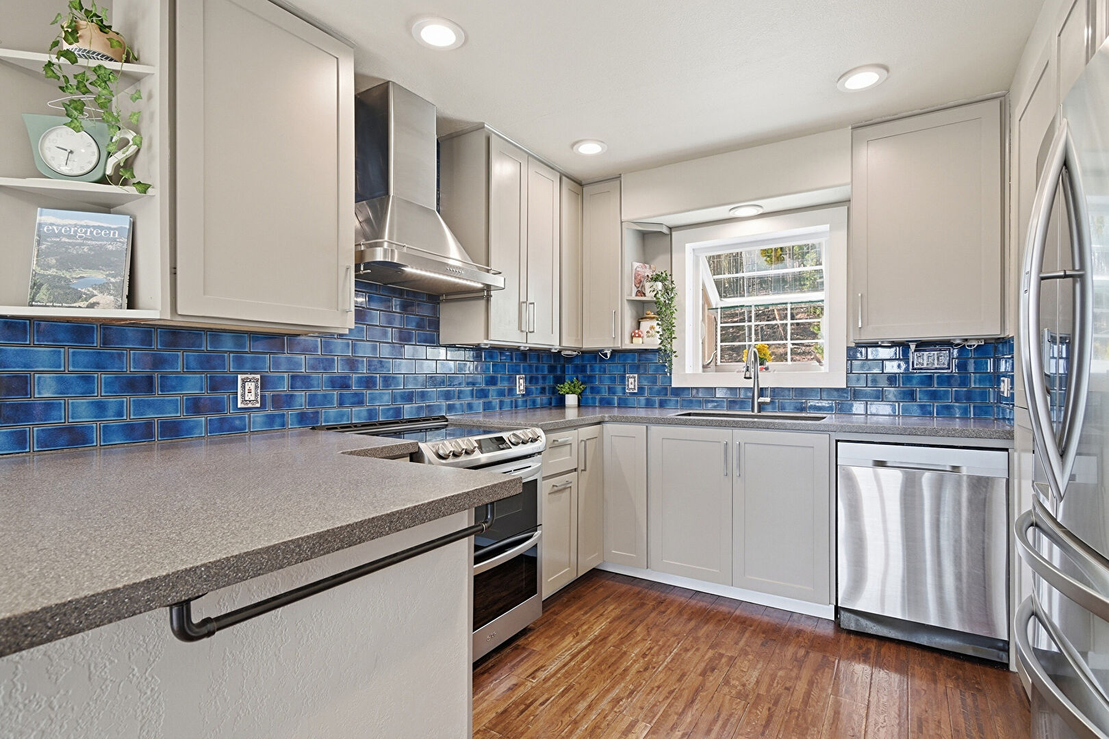 Baseboard Radiator, Baseboards Wall, Crown Molding, Drywall, G Shaped Kitchen, Gray Cabinets, Kitchen Bar, Kitchen Peninsula, Natural Light, Open Shelves, Recessed Lighting, Shaker Cabinets, Stone Countertops, Wood Finish Floor, G Shaped Kitchen, Recessed Lighting, Shaker Cabinets, Wood Finish Floor