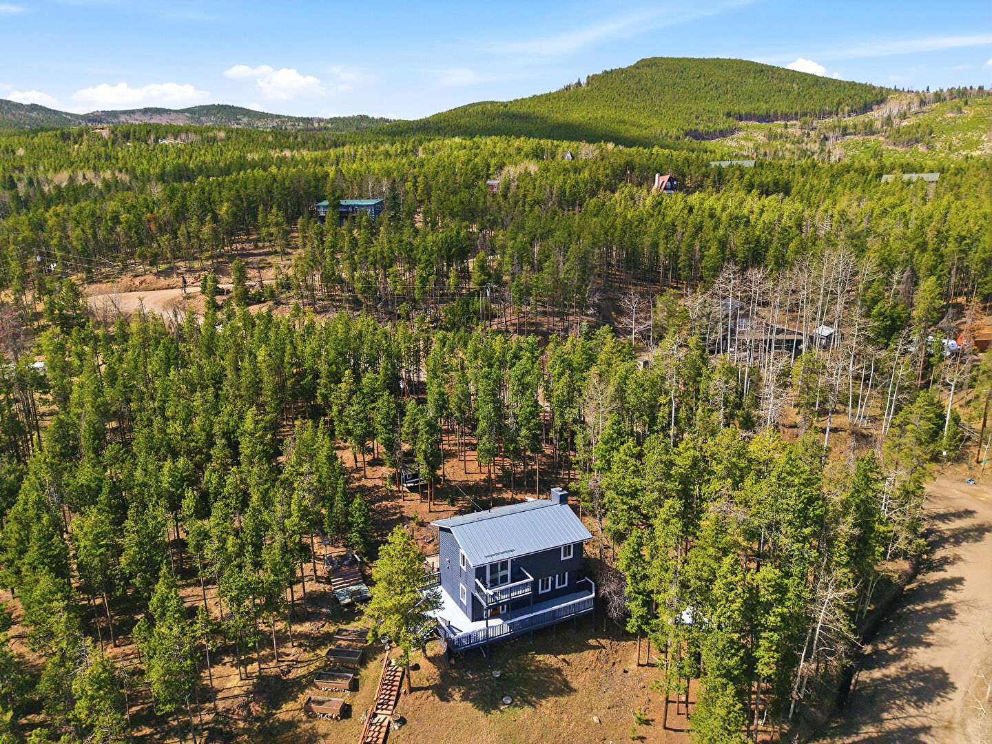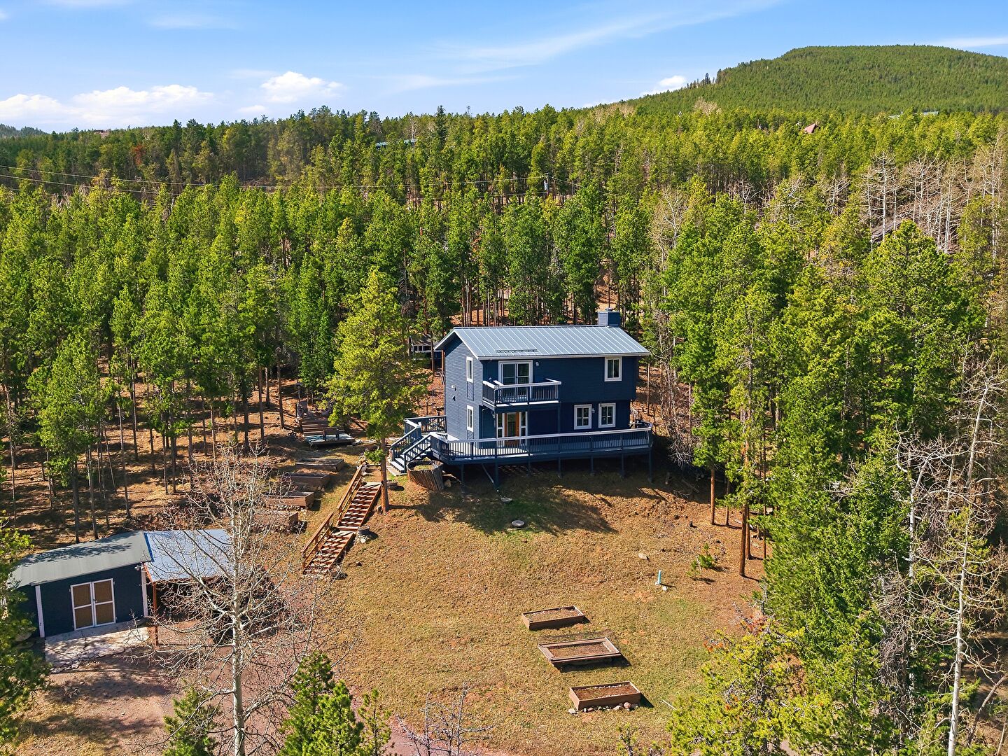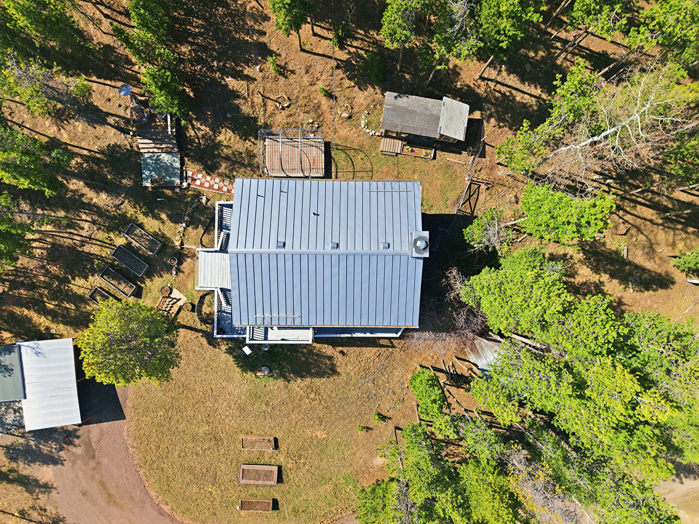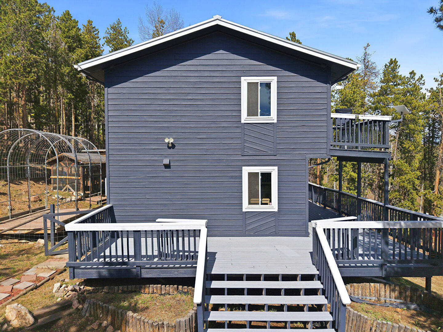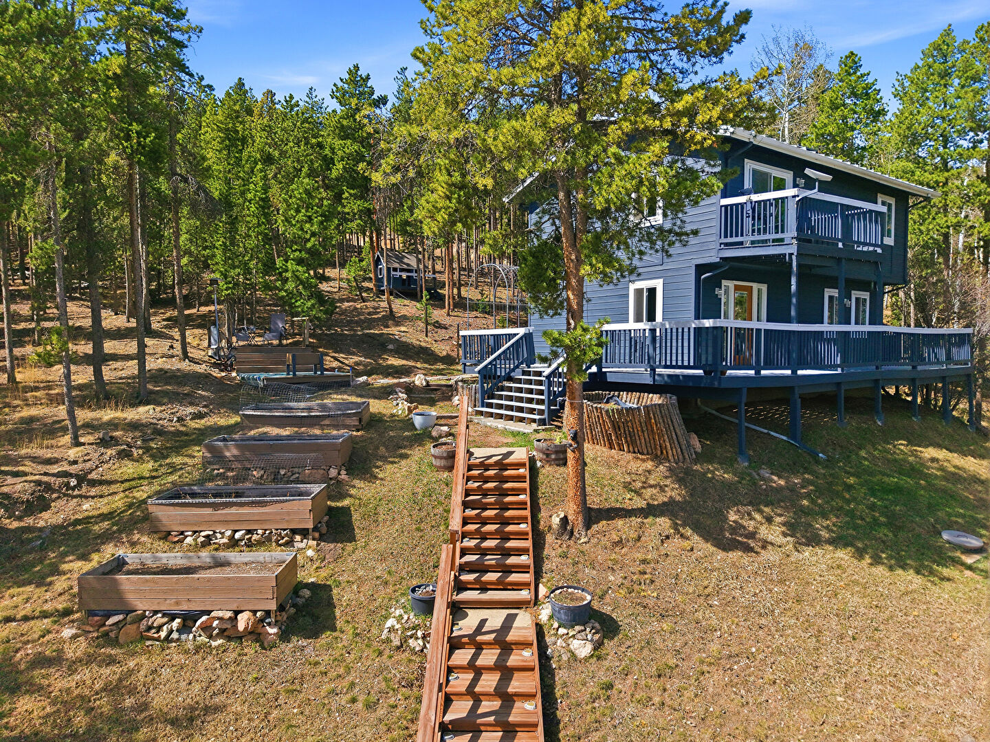 Chimney, Corrugated Roof, Deck, Forest View, Horizontal Siding, Lawn, Metal Roof, Stairs, Woods View, Balcony, Downspout, Metal Roof, Standing Seam Roof