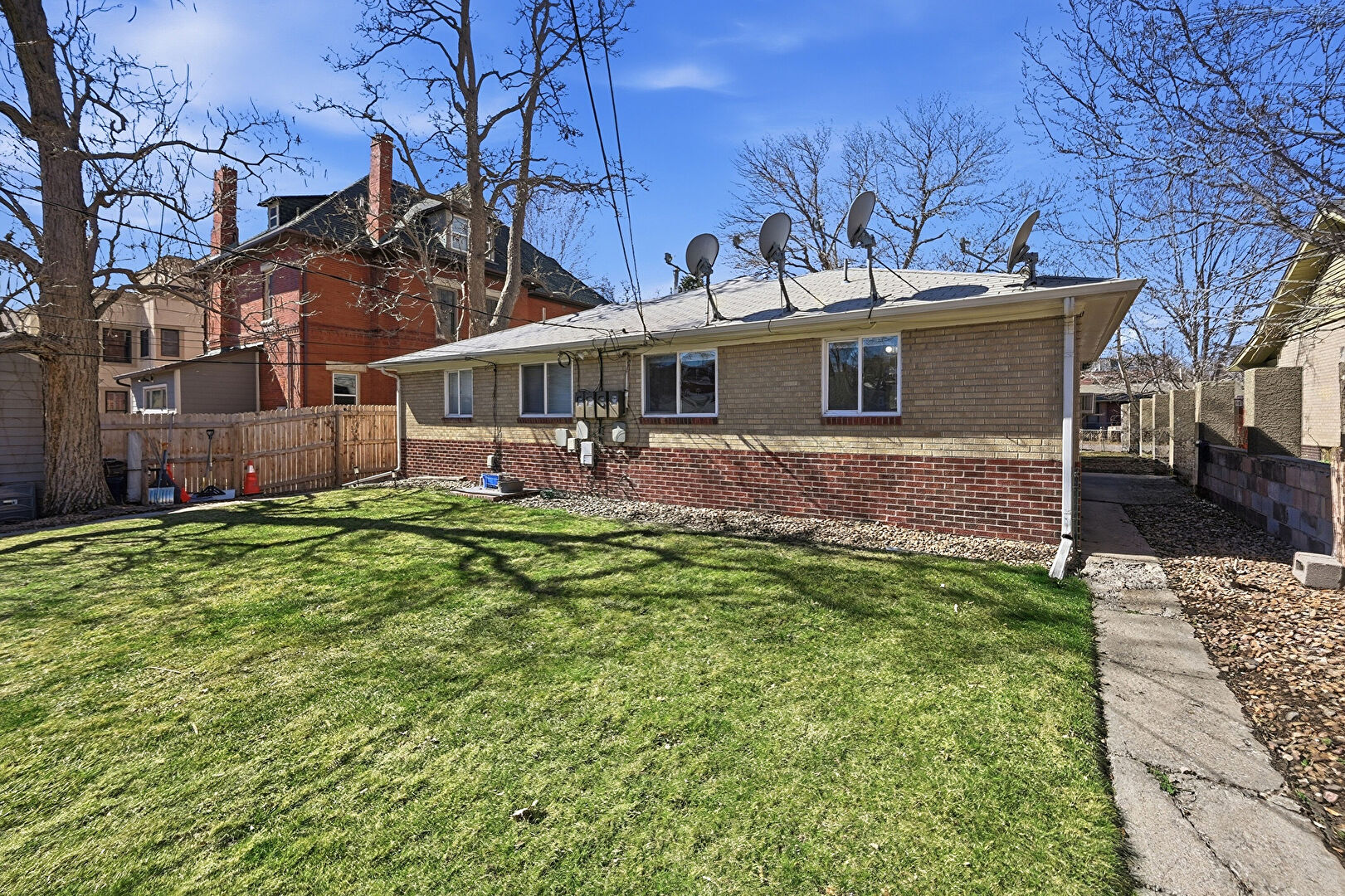 Brick Siding, Downspout, Fence, Gutters, Lawn, Satellite Dish, Downspout, Gutters