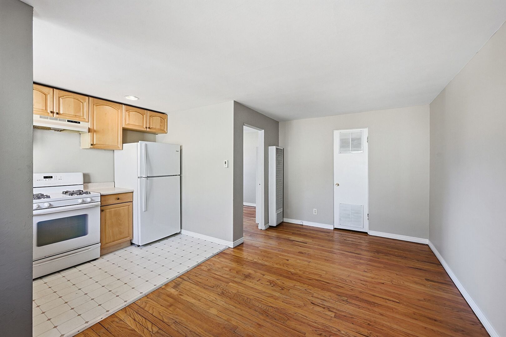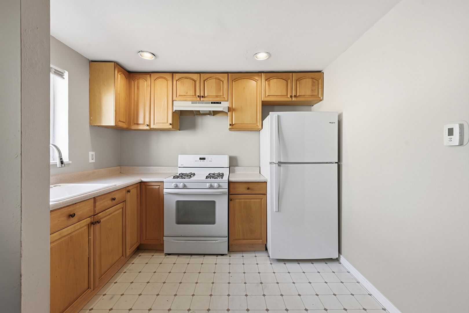 Arched Cabinets, Baseboards Wall, Drywall, L Shaped Kitchen, Medium Brown Cabinets, Natural Light, Raised Cabinets, Recessed Lighting, Vent, Vinyl Floor, Wood Finish Floor, Baseboards Wall, Natural Light, Vinyl Floor, Wood Finish Floor