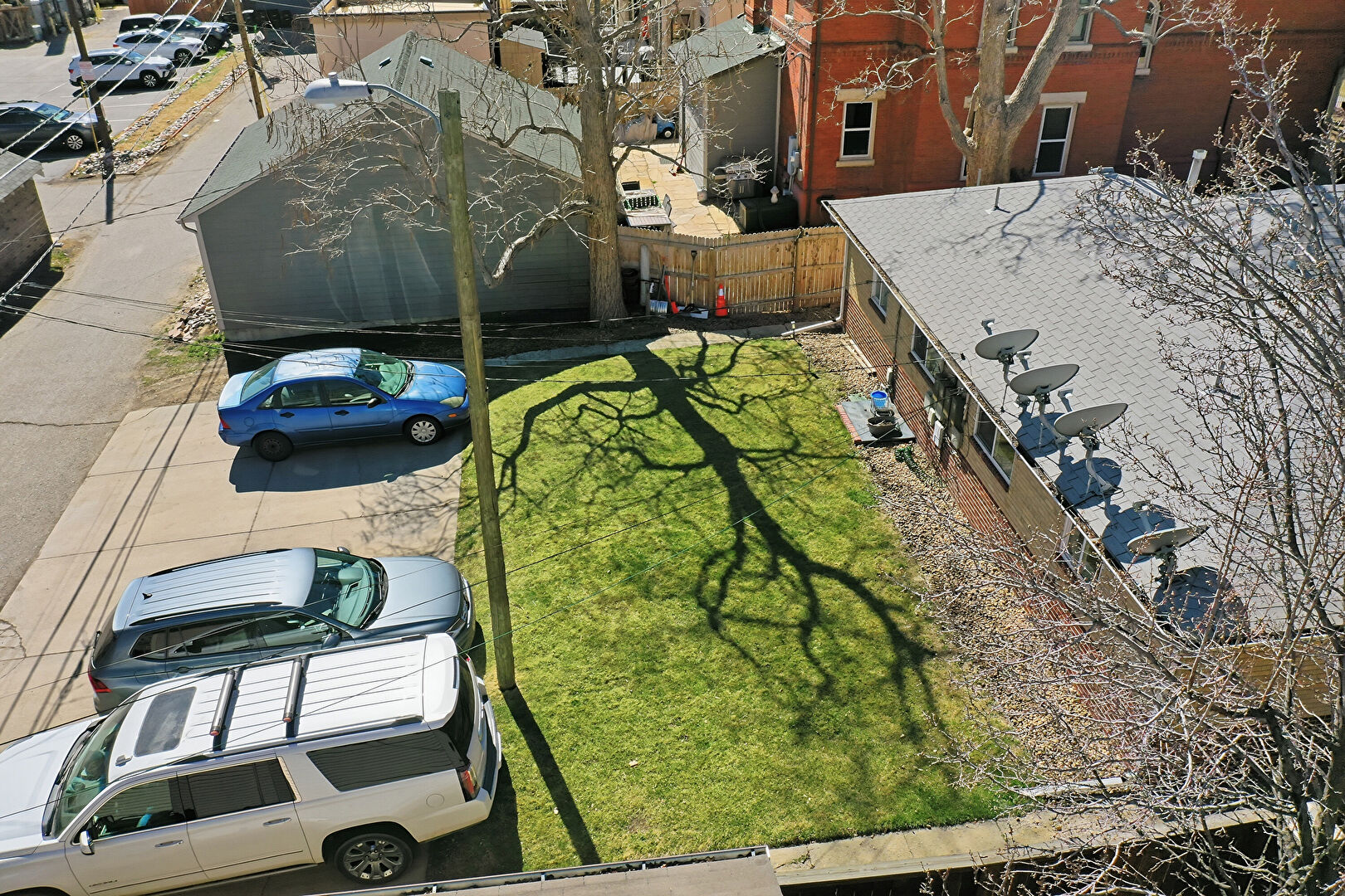 Brick Siding, Downspout, Fence, Gate, Gutters, Lawn, Parking Pad, Shingle Roof, Brick Siding, Fence, Lawn