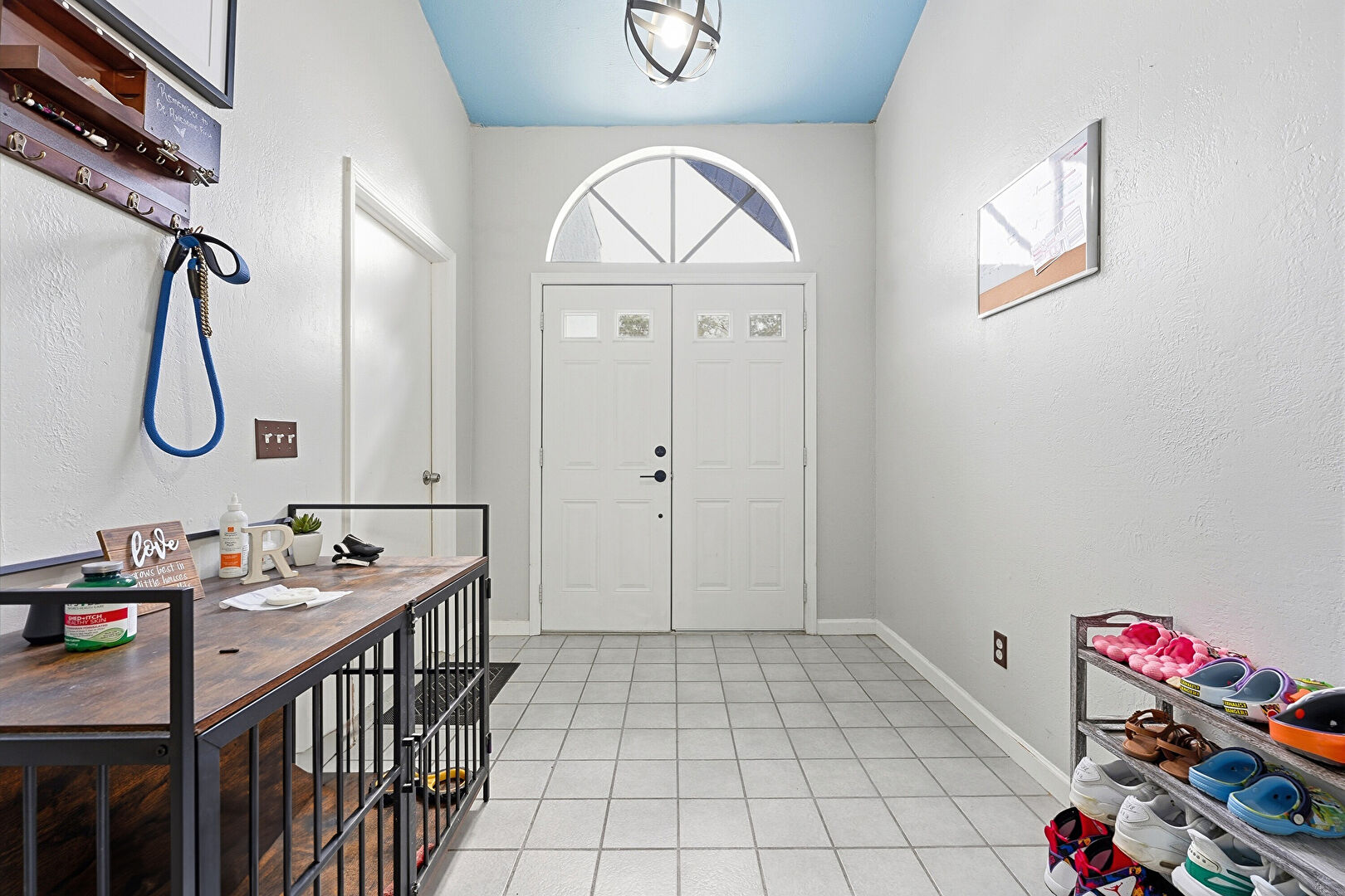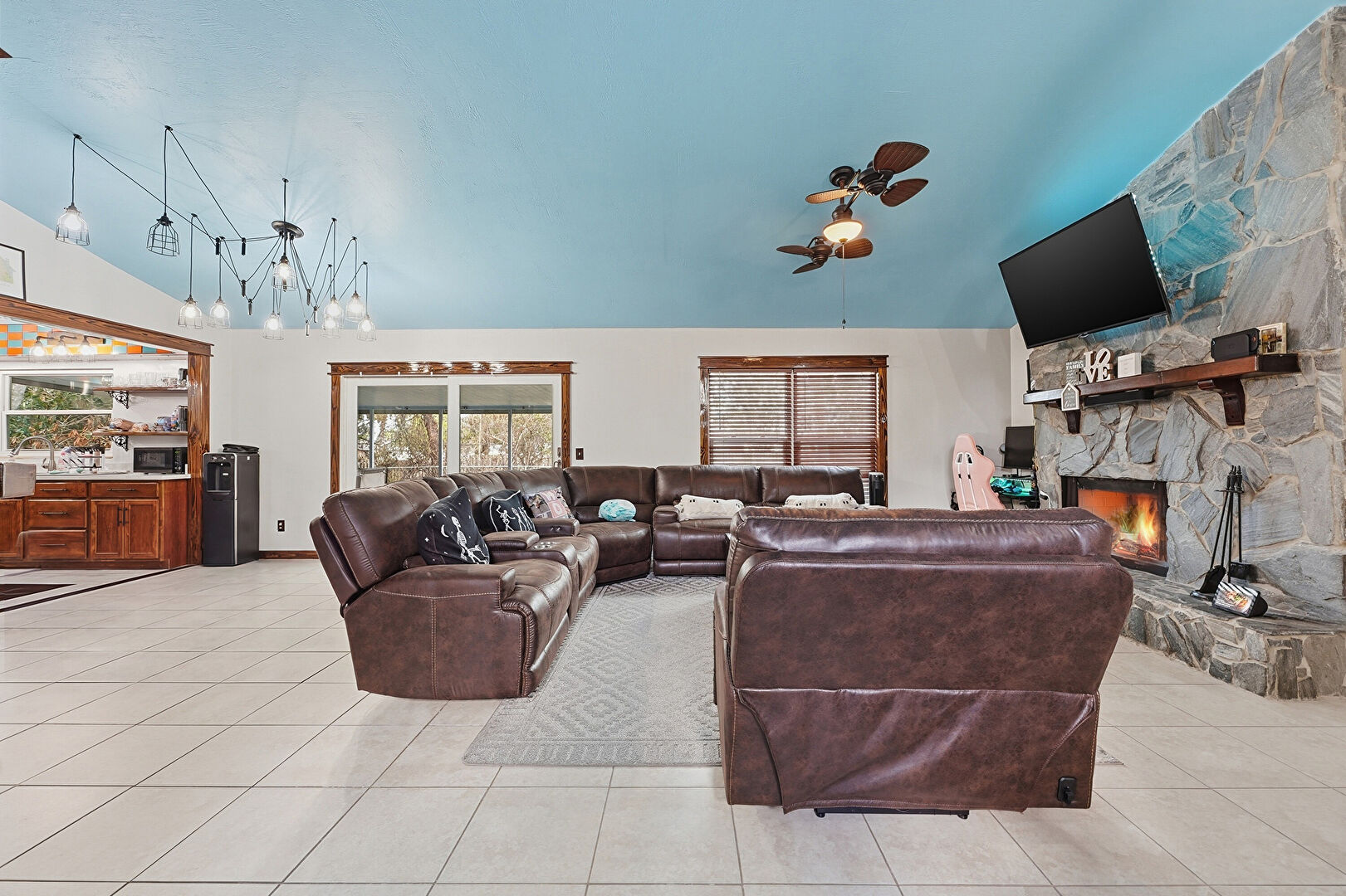 Baseboards Wall, Ceiling Fan, Drywall, Fireplace, High Ceiling, Natural Light, Notable Chandelier, Tile Floor, Vaulted Ceiling, Vent, Natural Light, Tile Floor, Vaulted Ceiling, Vent