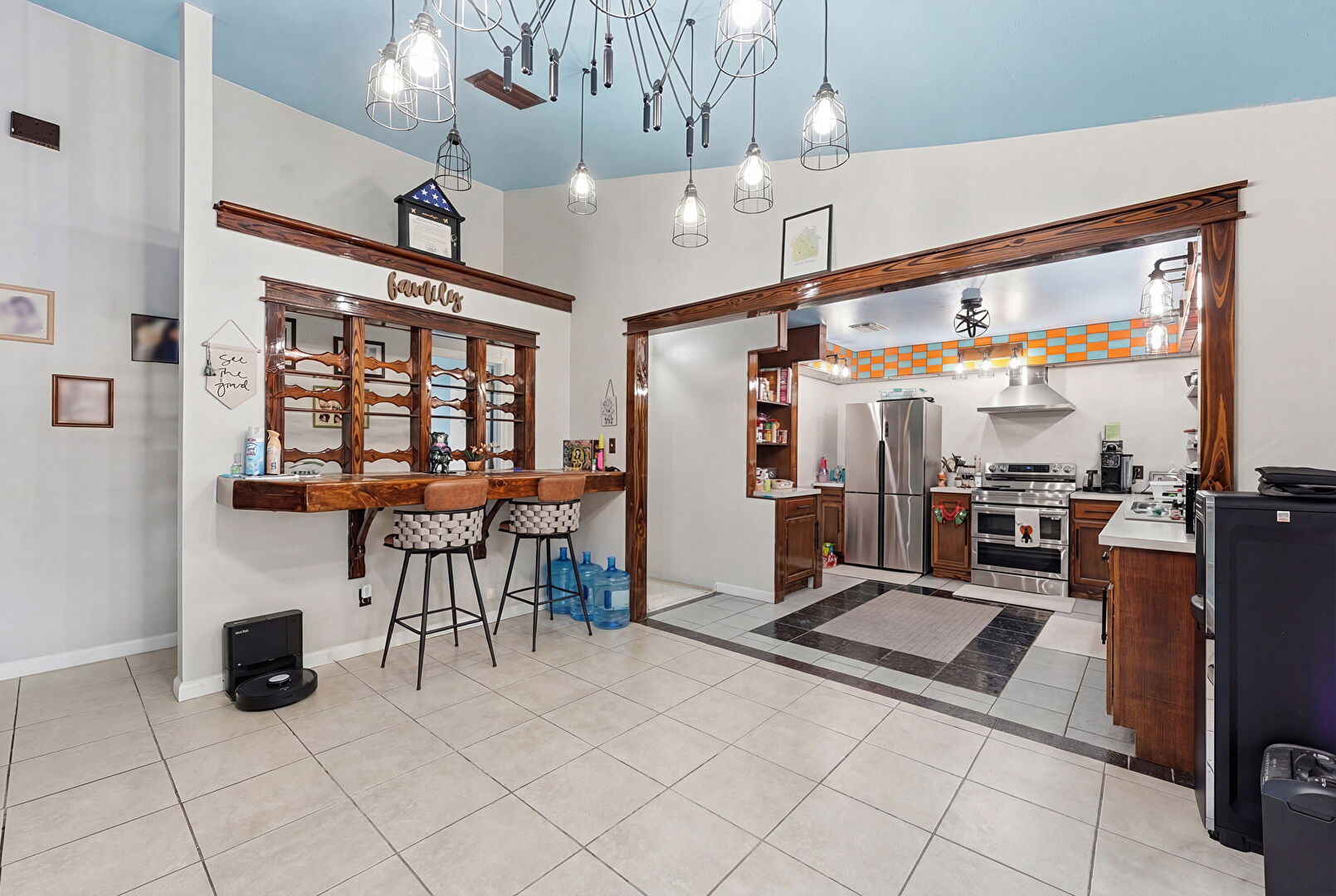 Baseboards Wall, Dark Brown Cabinets, Drywall, High Ceiling, Inlaid Floor, Medium Brown Cabinets, Natural Light, Notable Chandelier, Open Shelves, Pass Through Window, Pendant Lighting, Shaker Cabinets, Tile Floor, U Shaped Kitchen, Vaulted Ceiling, Vent, Kitchen Bar, Natural Light, Shaker Cabinets, Tile Floor