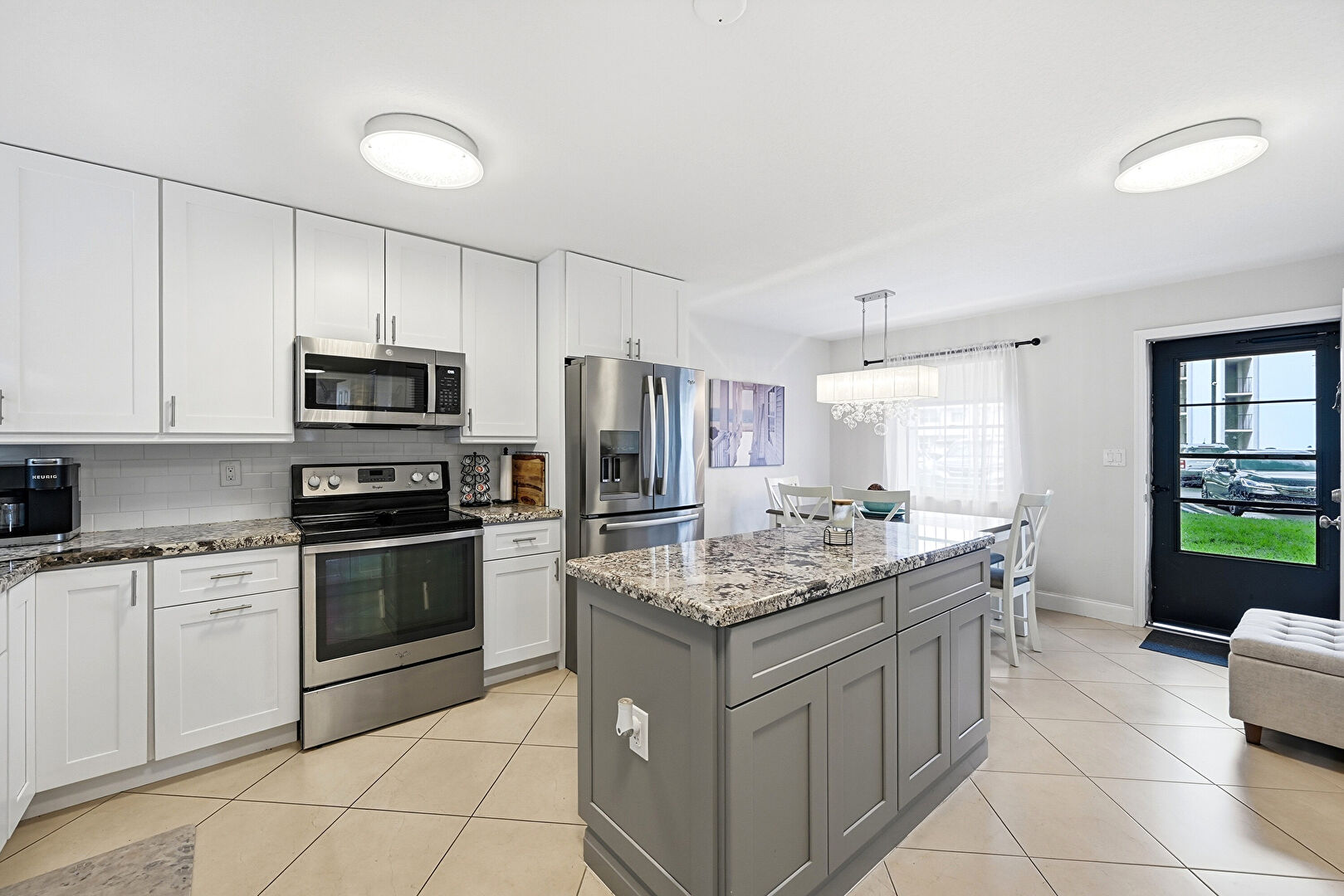 Baseboards Wall, Drywall, Gray Cabinets, Kitchen Island, Natural Light, Notable Chandelier, Opens To Living Area, Pass Through Window, Pendant Lighting, Shaker Cabinets, Stone Countertops, Tile Floor, Vent, Drywall, Pendant Lighting, Shaker Cabinets, Tile Floor