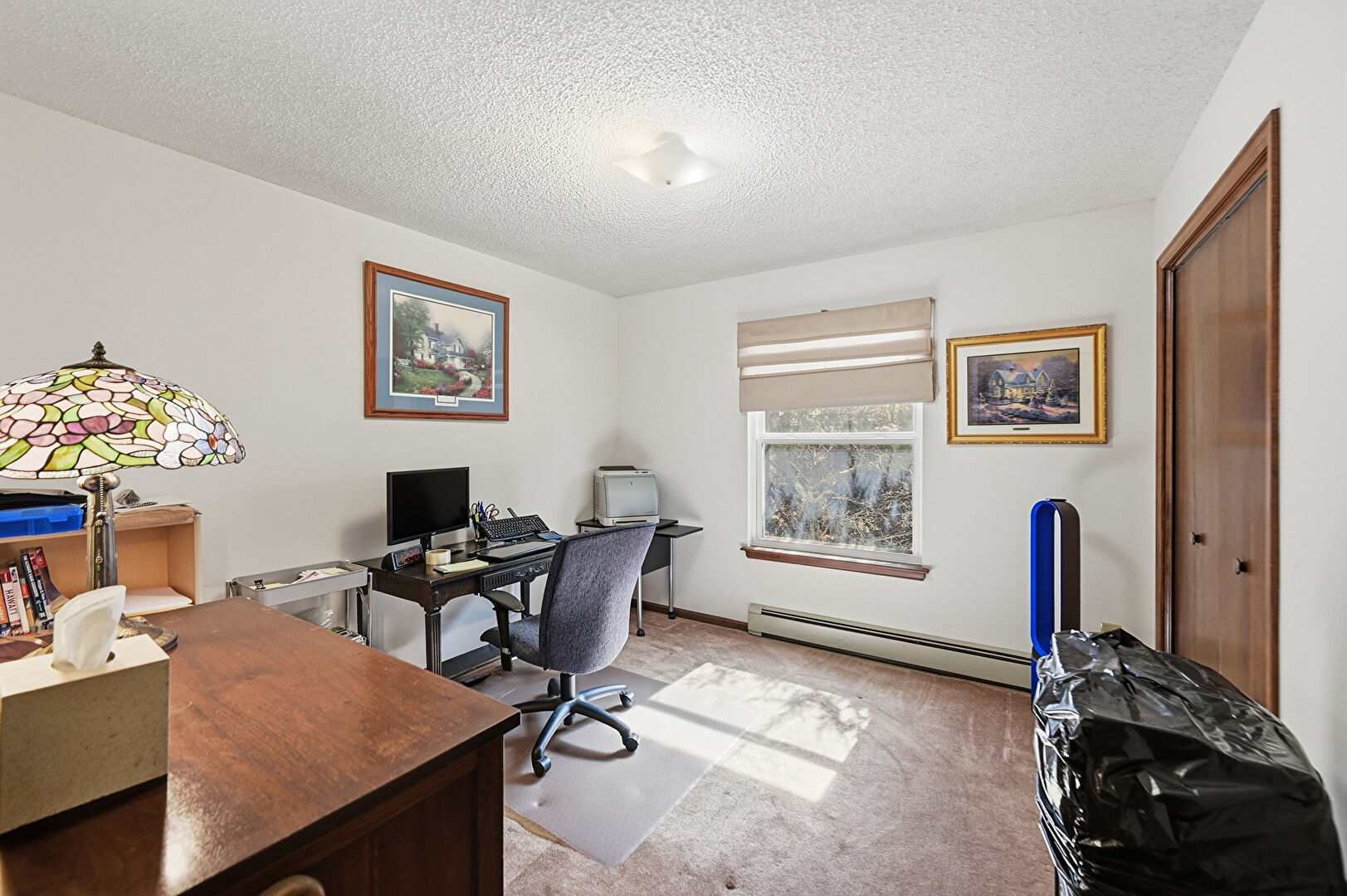 Baseboard Radiator, Baseboards Wall, Carpet, Drywall, Office Area, Textured Ceiling, Natural Light