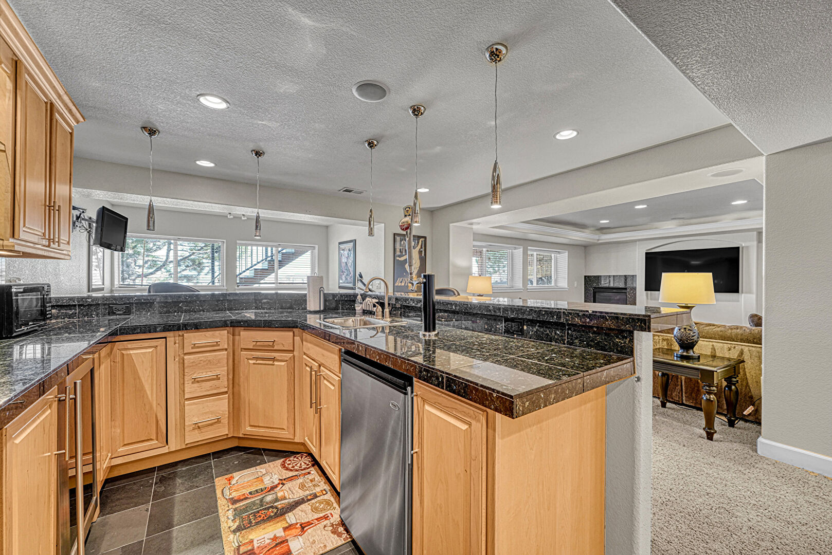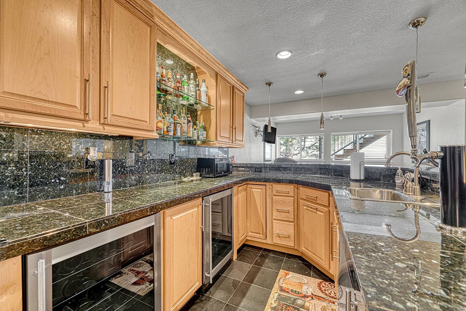 Baseboards Wall, Carpet, Crown Molding Cabinets, Drywall, Kitchen Bar, Kitchen Peninsula, Natural Light, Opens To Living Area, Pendant Lighting, Raised Cabinets, Recessed Lighting, Stone Tile Countertops, Textured Ceiling, Toaster, Wine Cooler, Textured Ceiling, Tray Ceiling