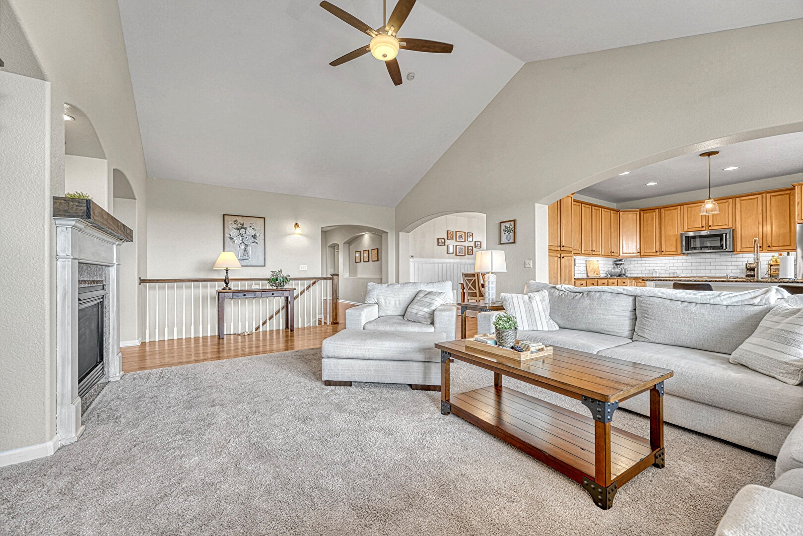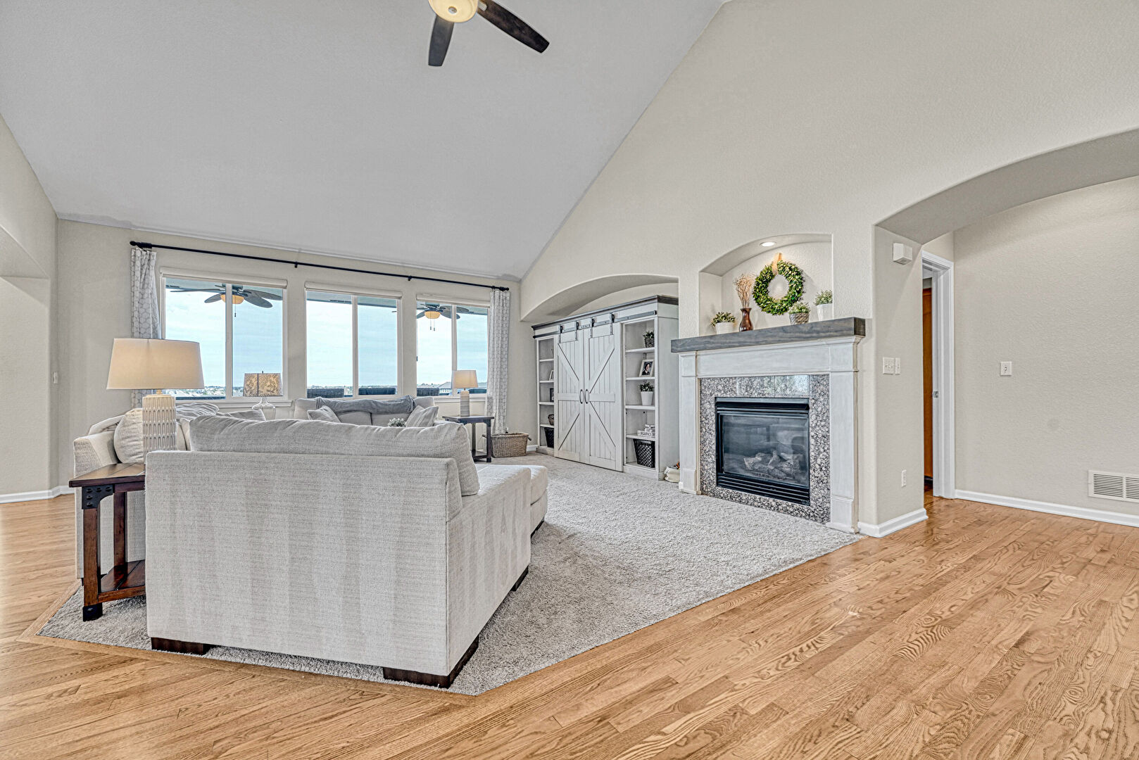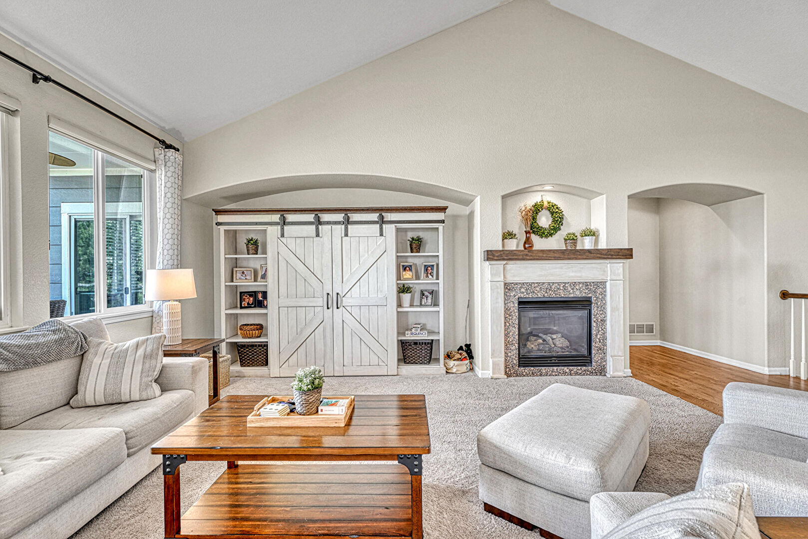 Arched Walkways, Barn Door, Baseboards Wall, Built In Shelves, Carpet, Cathedral Ceiling, Ceiling Fan, Drywall, Fireplace, High Ceiling, Natural Light, Recessed Lighting, Textured Wall, Vaulted Ceiling, Vent, Wood Finish Floor, Arched Walkways, Built In Shelves, High Ceiling, Natural Light, Recessed Lighting