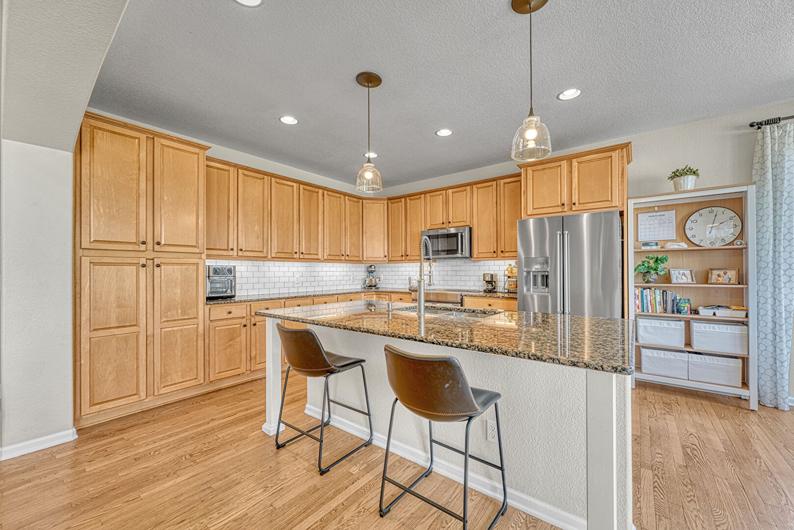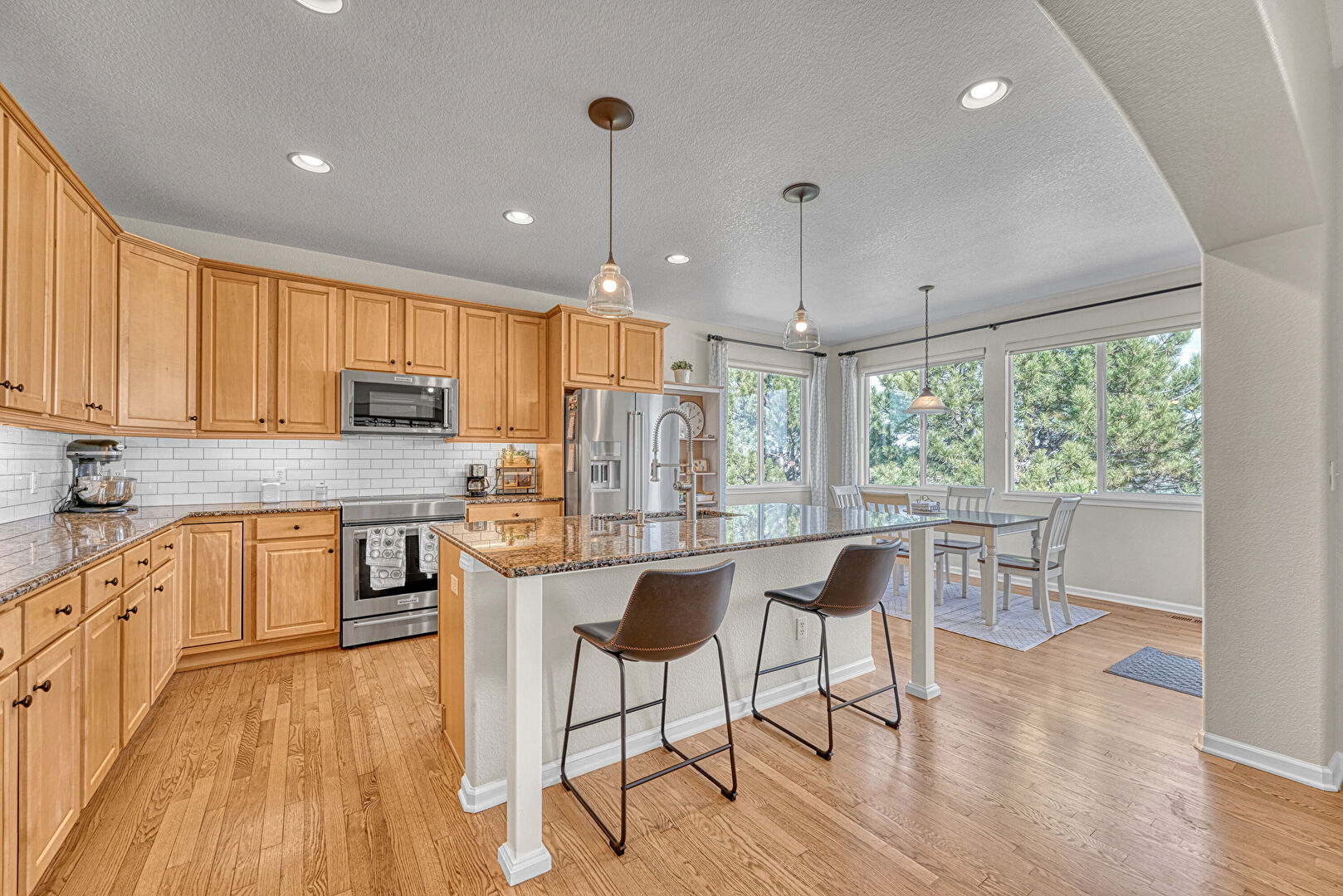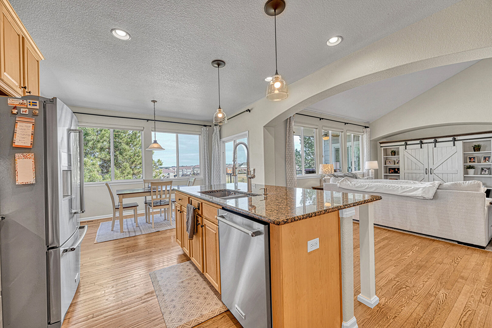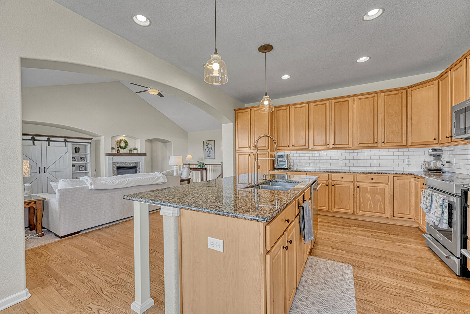Arched Walkways, Barn Door, Baseboards Wall, Ceiling Fan, Crown Molding Cabinets, Drywall, Fireplace, Kitchen Bar, Kitchen Island, L Shaped Kitchen, Natural Light, Opens To Living Area, Pendant Lighting, Raised Cabinets, Recessed Lighting, Stone Countertops, Textured Ceiling, Toaster, Vaulted Ceiling, Wood Finish Floor, Natural Light, Opens To Living Area, Pendant Lighting, Vaulted Ceiling