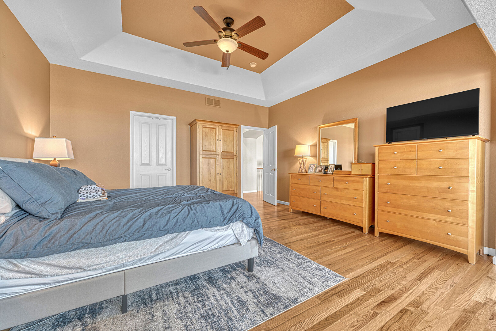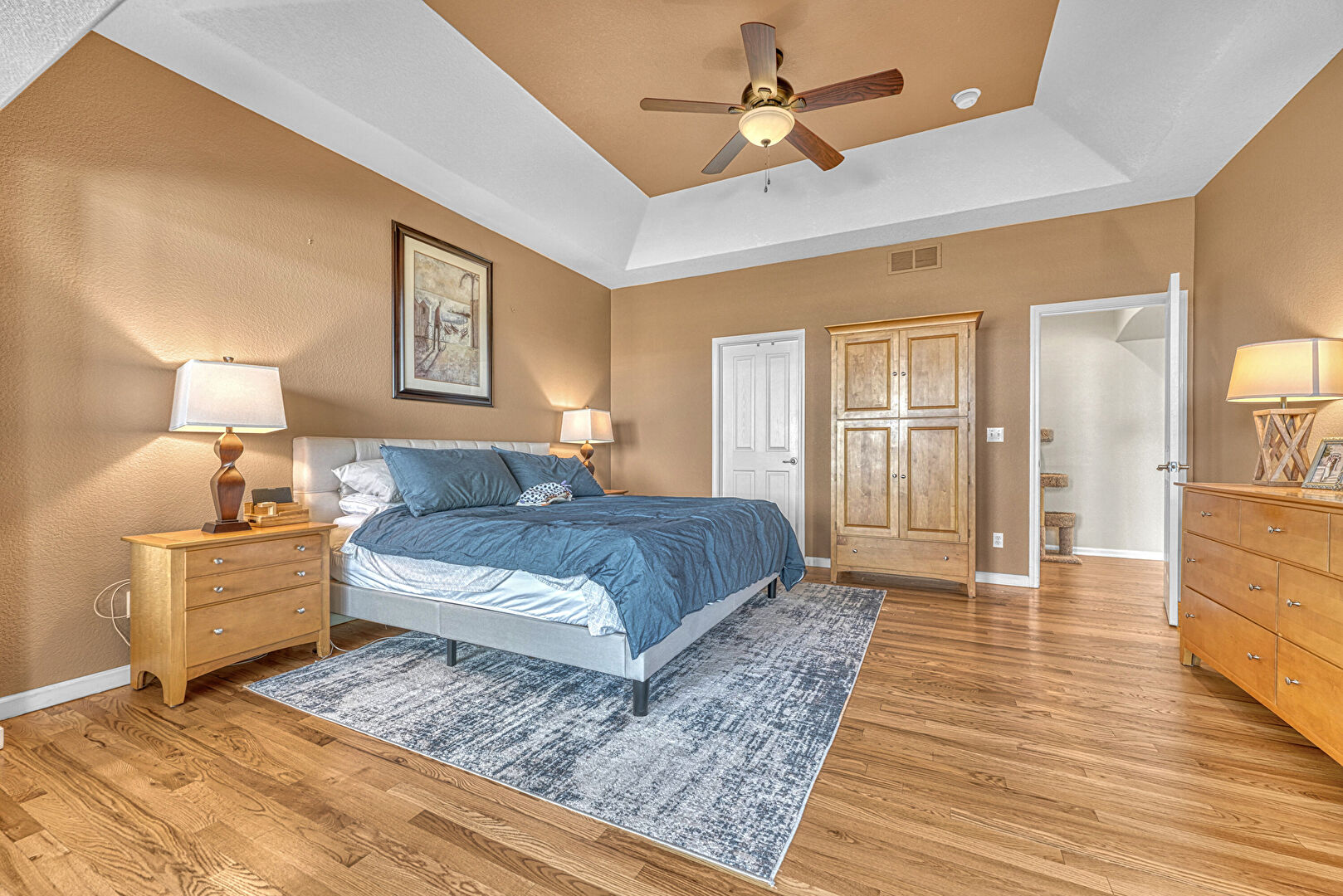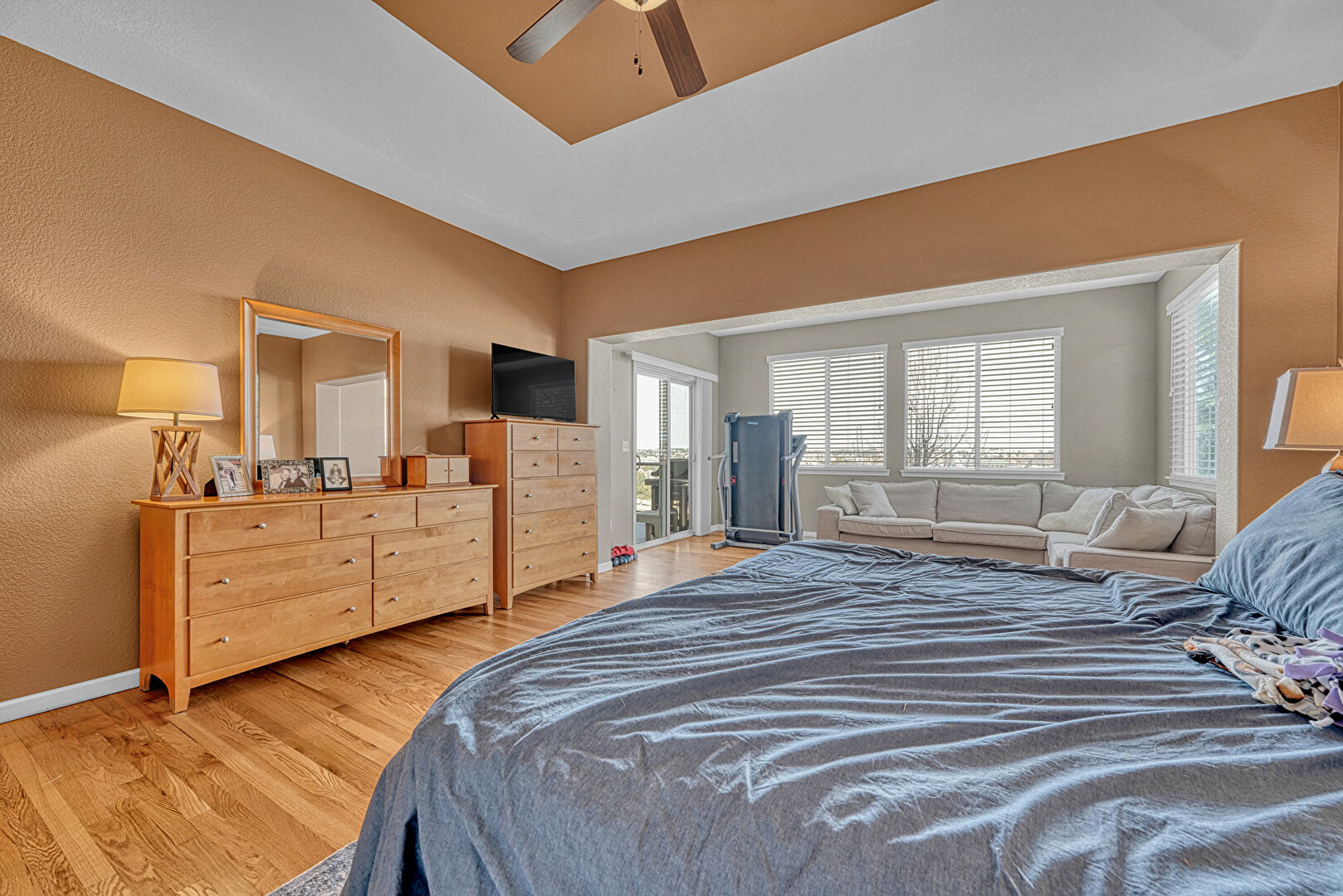 Access To Exterior, Baseboards Wall, Ceiling Fan, Drywall, Natural Light, Tray Ceiling, Vent, Wood Finish Floor, Baseboards Wall, Drywall, Textured Wall, Wood Finish Floor