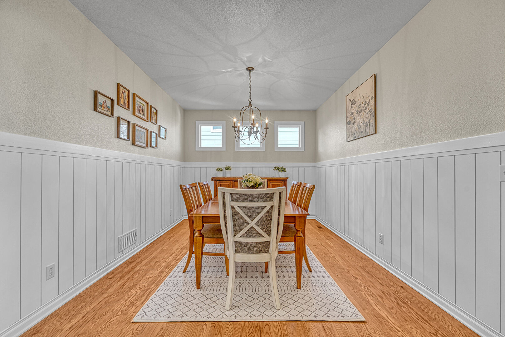 Notable Chandelier, Textured Wall, Vent, Wainscot Wall, Wood Finish Floor, Natural Light